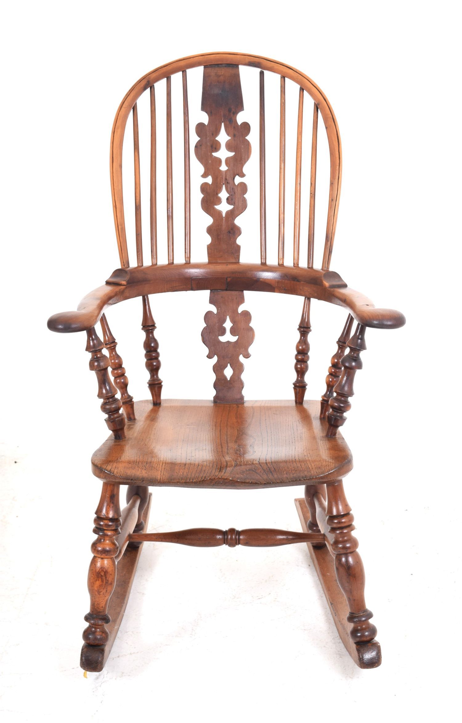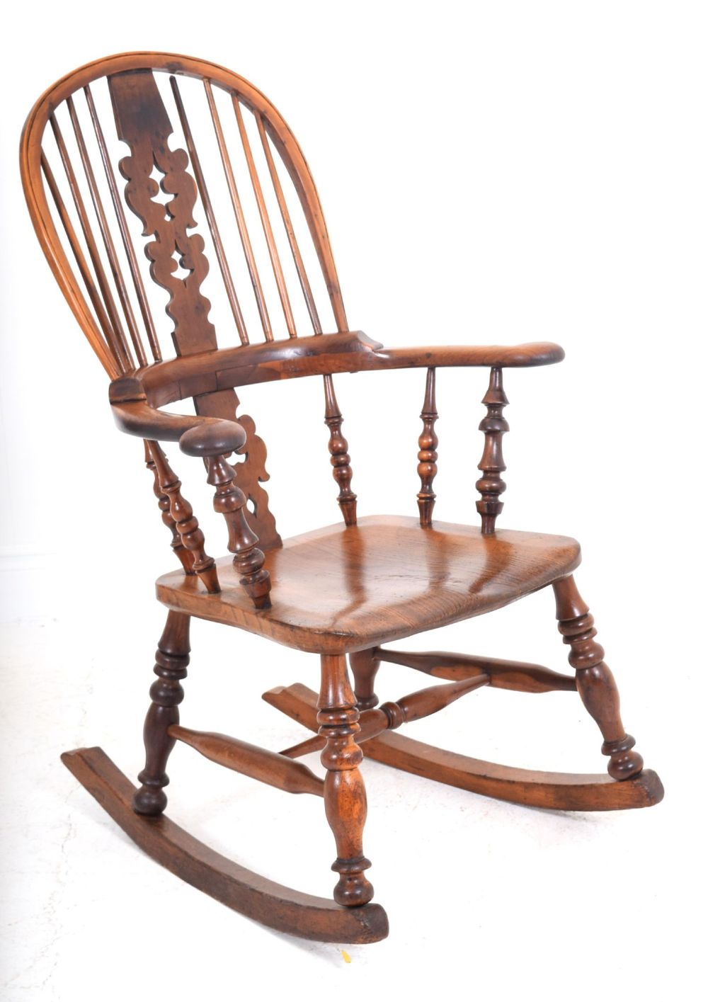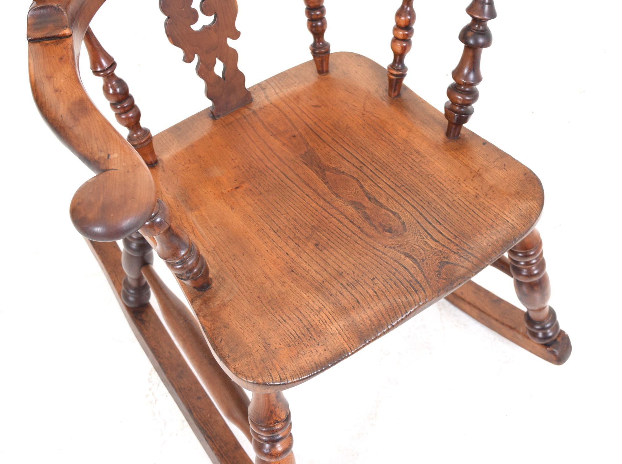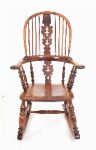 A well-made yew wood Windsor style armchair, with shaped back incorporating a pierced splat, spindle supports, and curved arms, on turned legs united by stretchers, raised on traditional rocking runners.