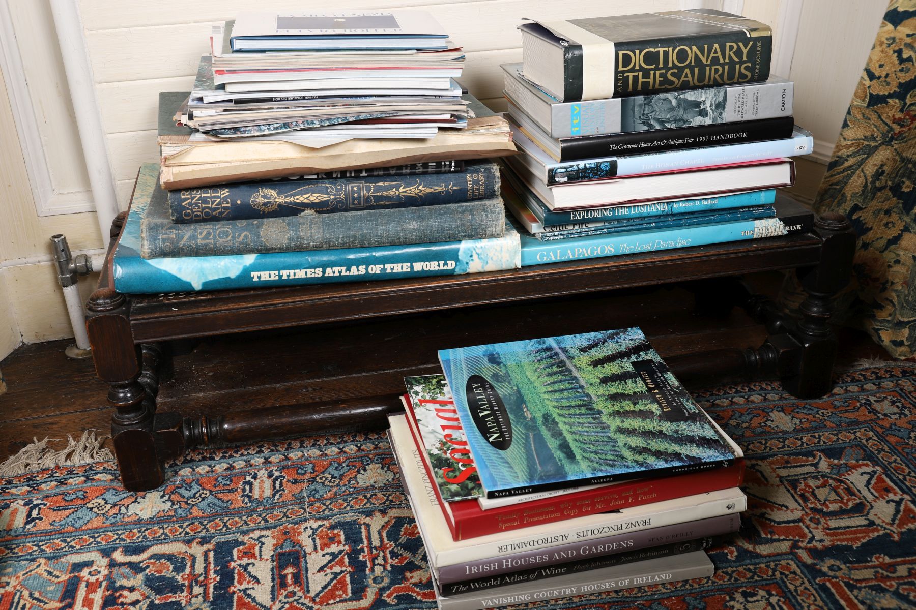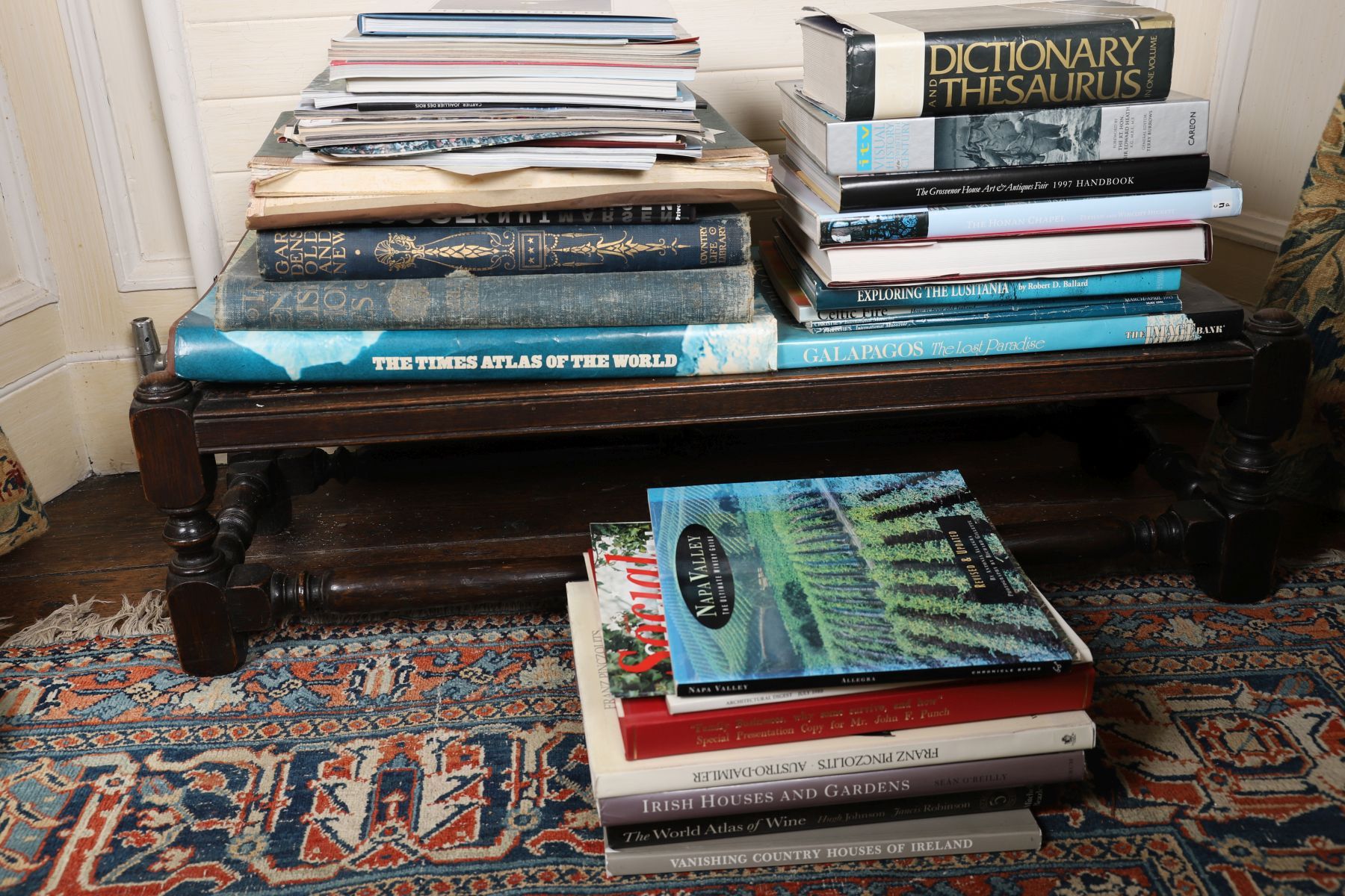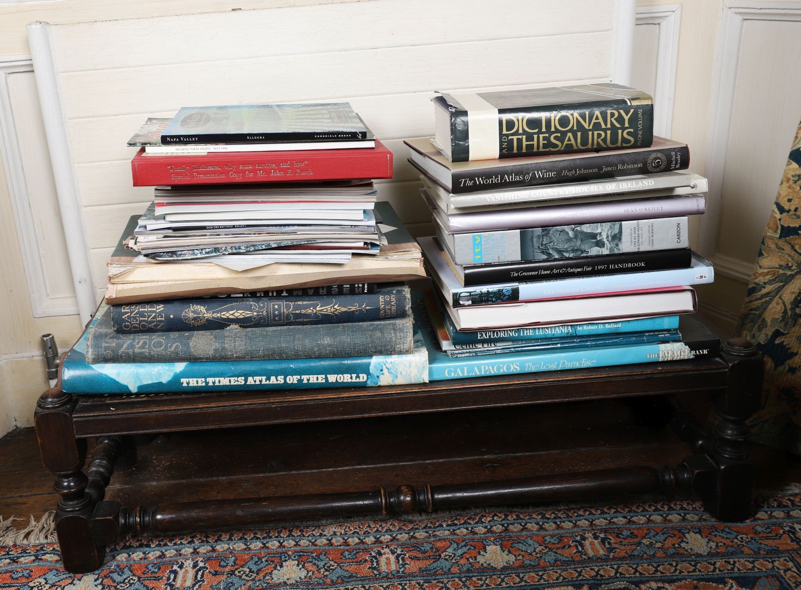 A mixed quantity of books, including volumes on art, architecture, country houses, travel and reference, together with atlases and exhibition catalogues. Titles observed include works on Irish houses and gardens, wine, exploration, antiques fairs and general reference. Mostly hardback editions, in varying condition, with dust jackets present on some volumes.