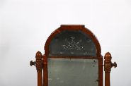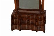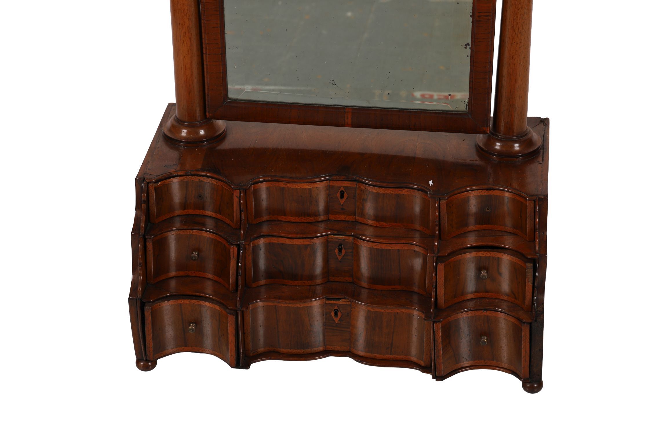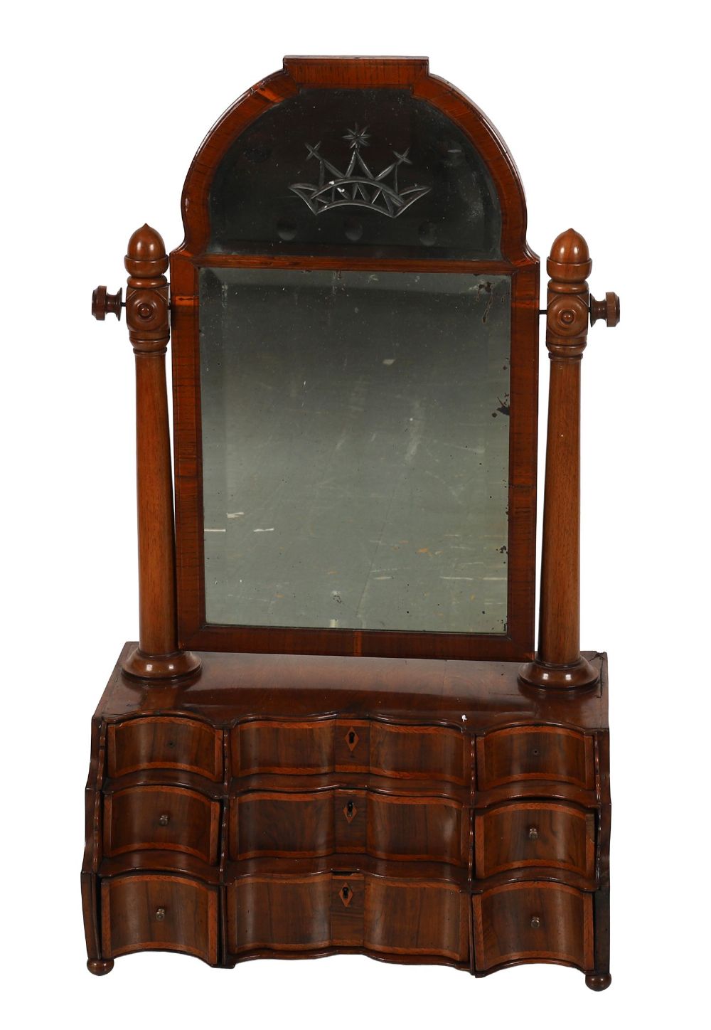 Queen Anne walnut crutch mirror, with three tiers of shaped drawers and pronounced serpentine front, raised on cabriole legs.