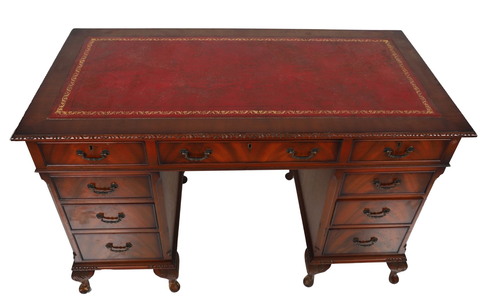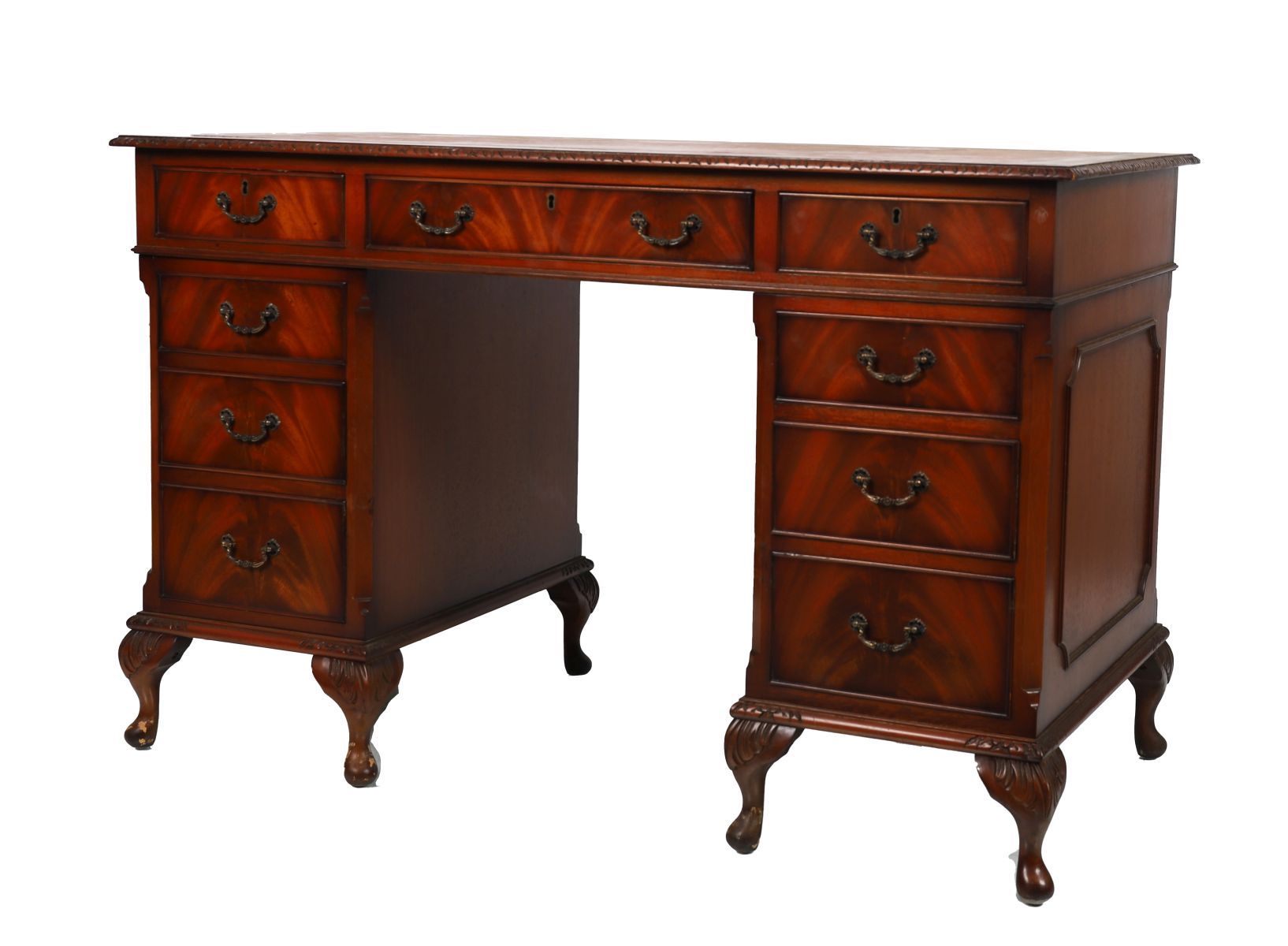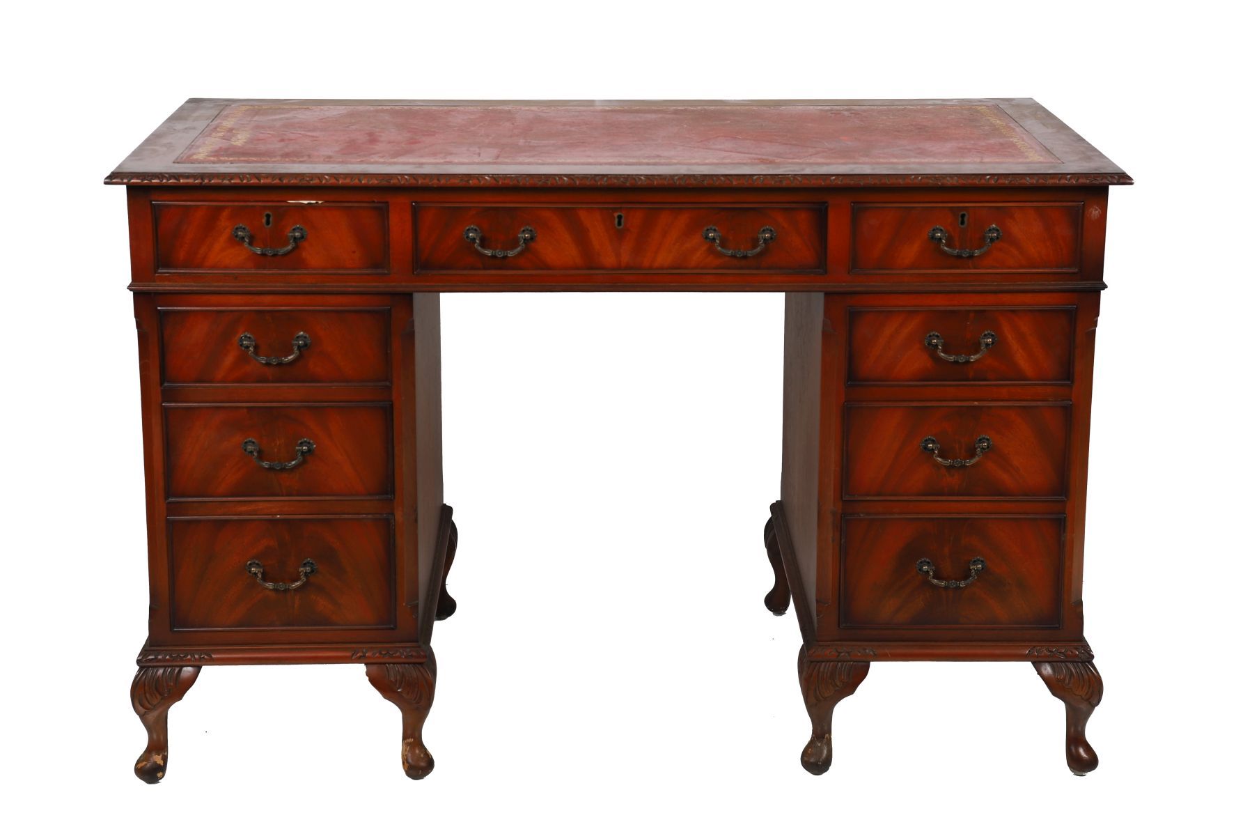 20th century. A Queen Anne style mahogany pedestal writing desk, the gilt-tooled leather inset top above a series of nine drawers on one side, raised on cabriole legs with carved knees and ball feet.