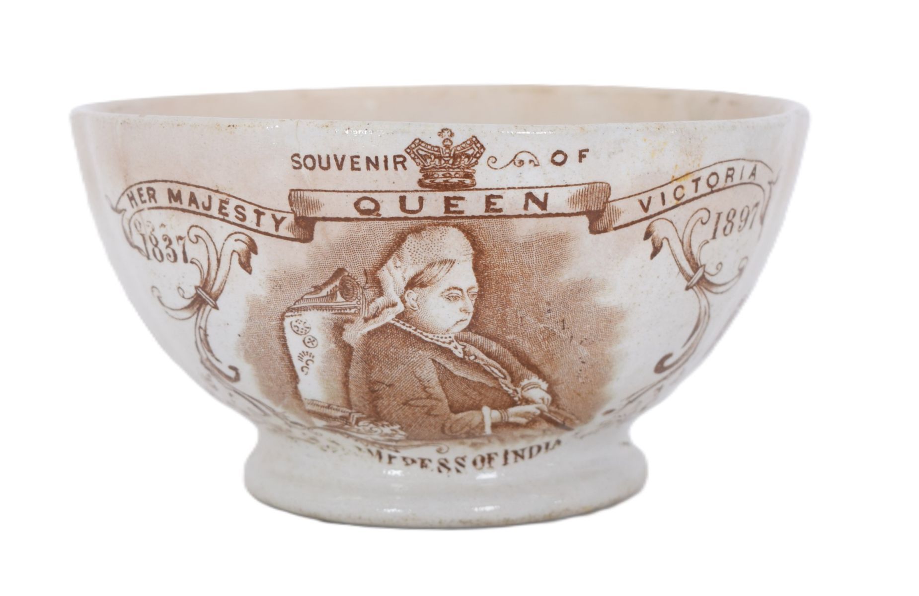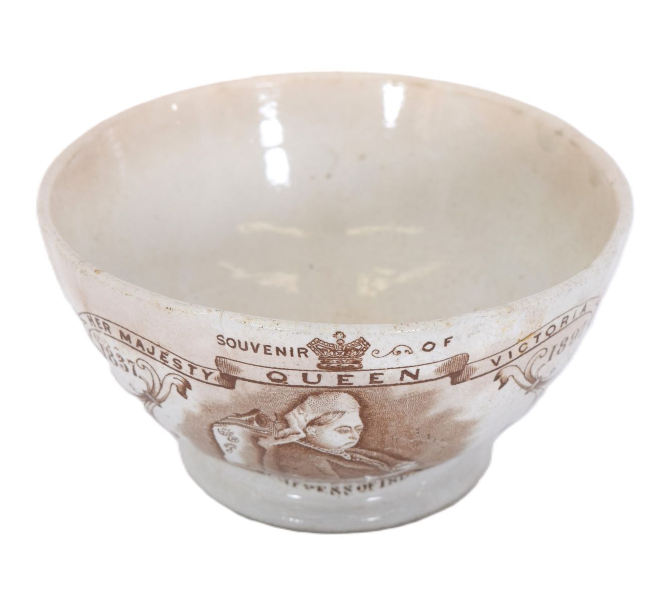 Ceramic porridge bowl printed “Her Majesty Queen Victoria,†with transfer decoration.