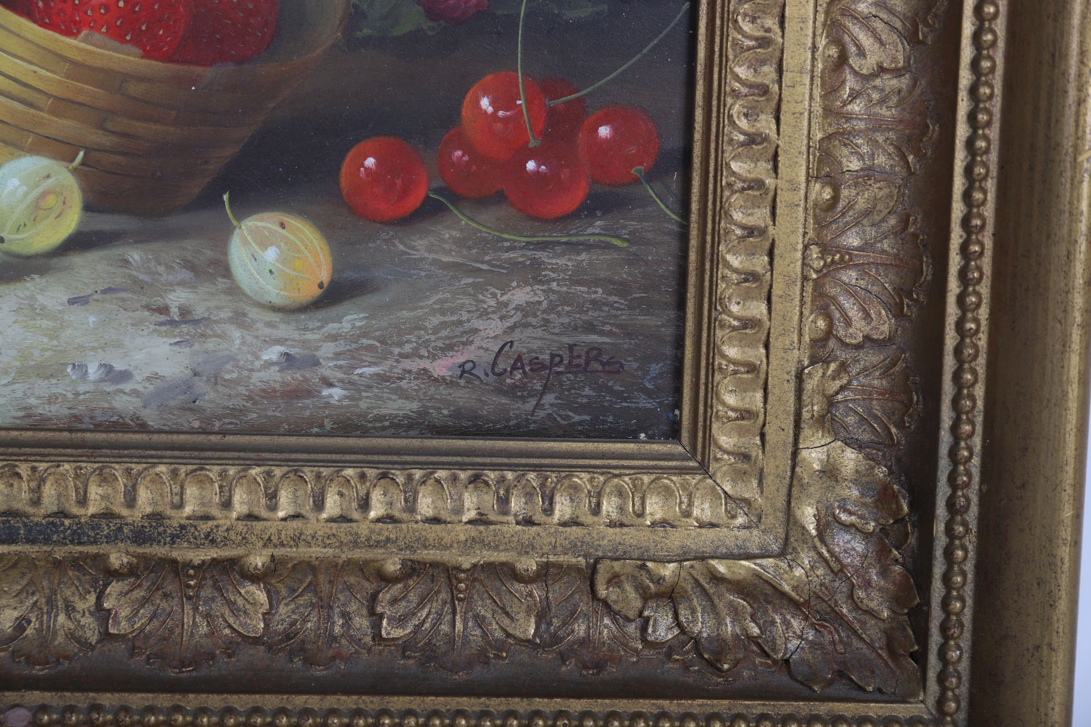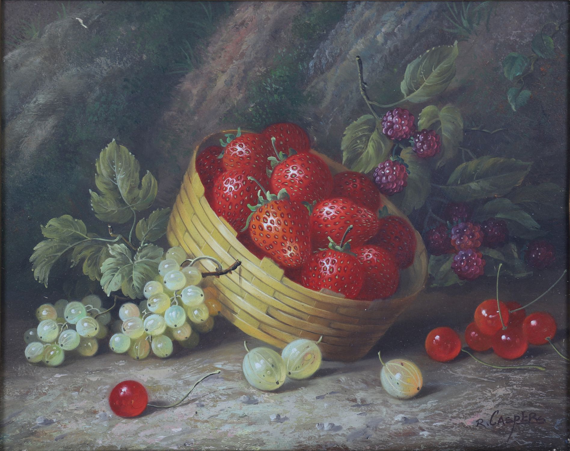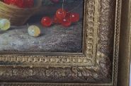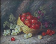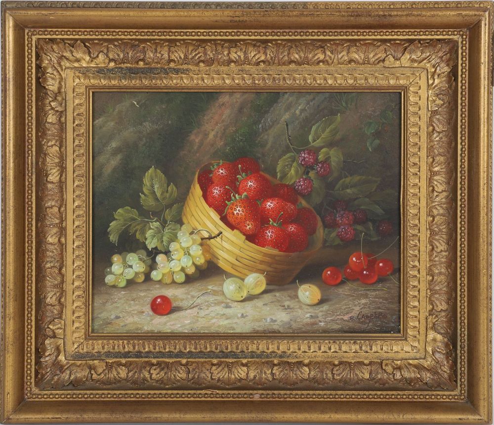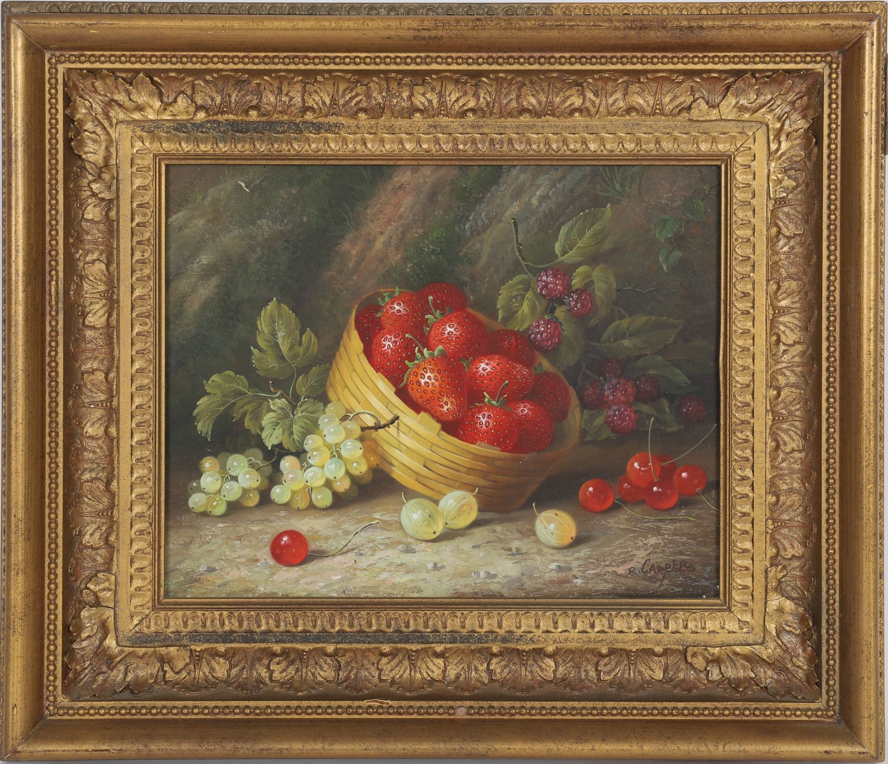 Still life study of a basket of strawberries beside grapes, cherries, gooseberries, and brambles on a naturalistic ledge. Oil on panel. Signed lower right, presented in a gilt leaf-moulded frame.