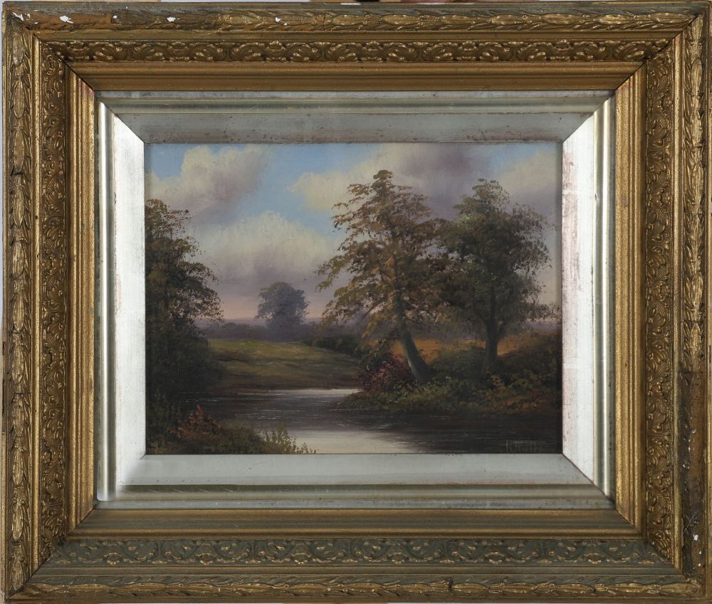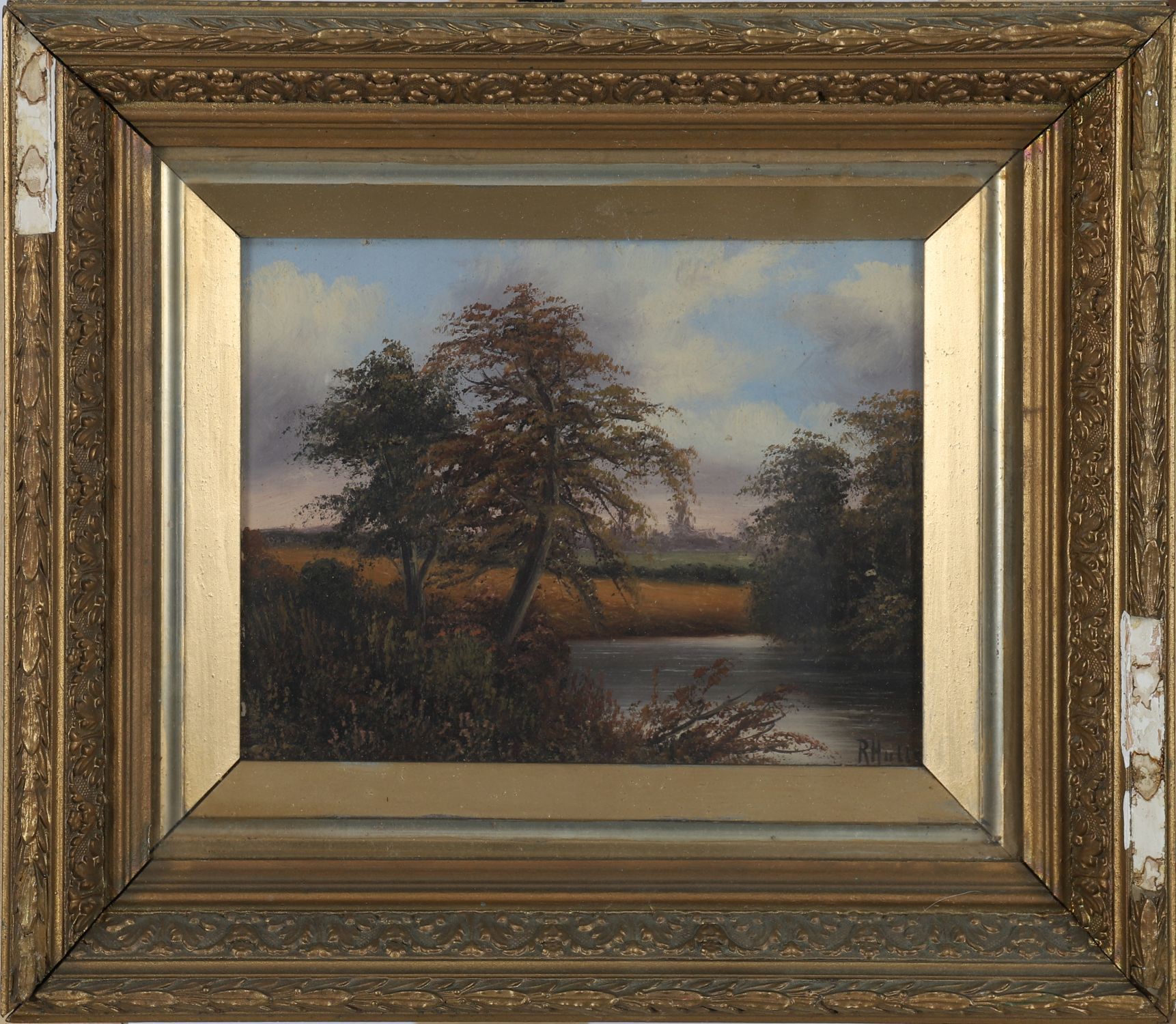 A charming pair of small-scale oil landscapes by R. Hull, each depicting tranquil wooded settings with reflective water and rustic bridges. The compositions are finely balanced and rendered in soft natural tones with delicate brushwork, evoking a romanticised pastoral mood. Both works are signed and presented in matching ornate gilt frames.