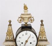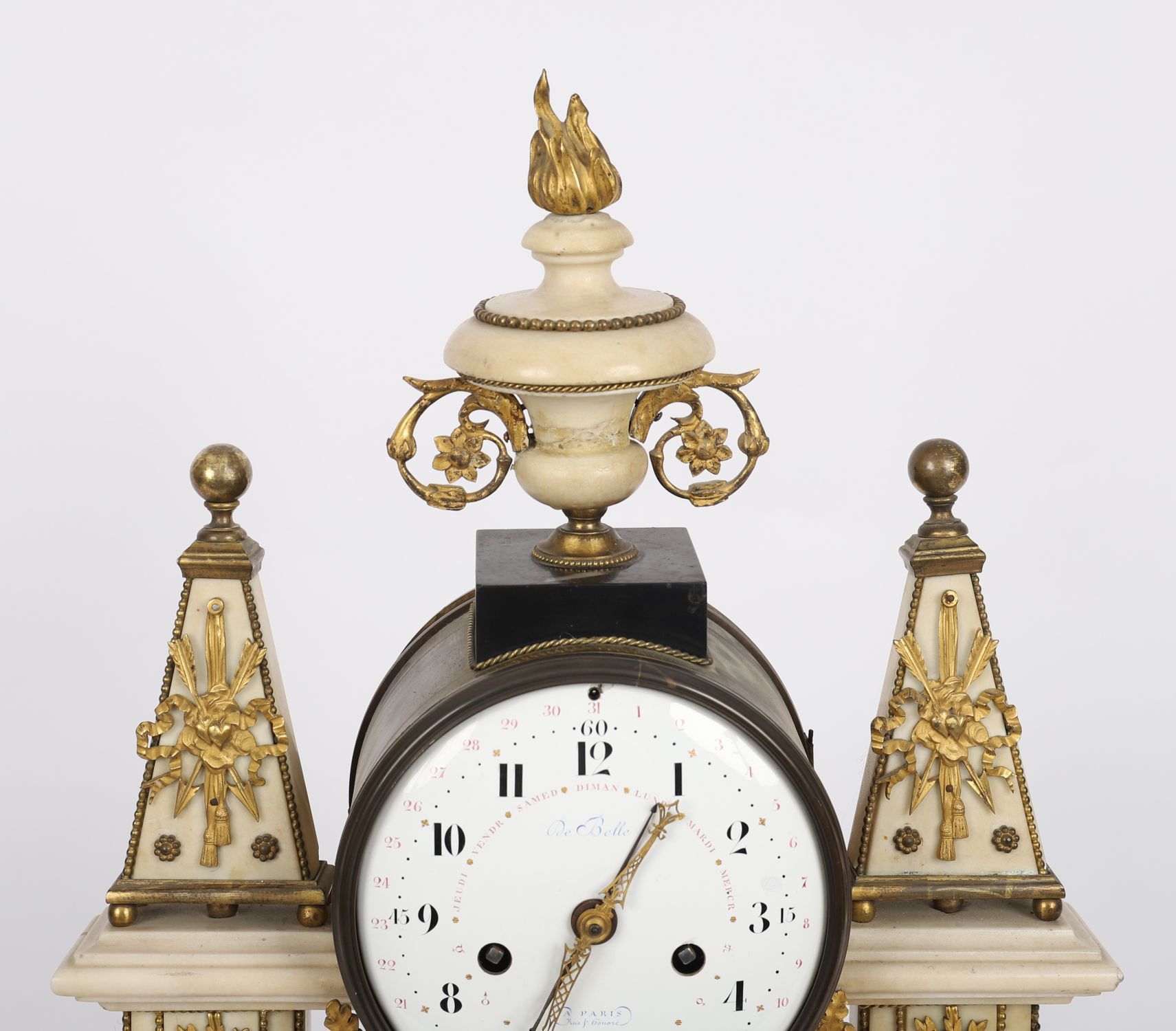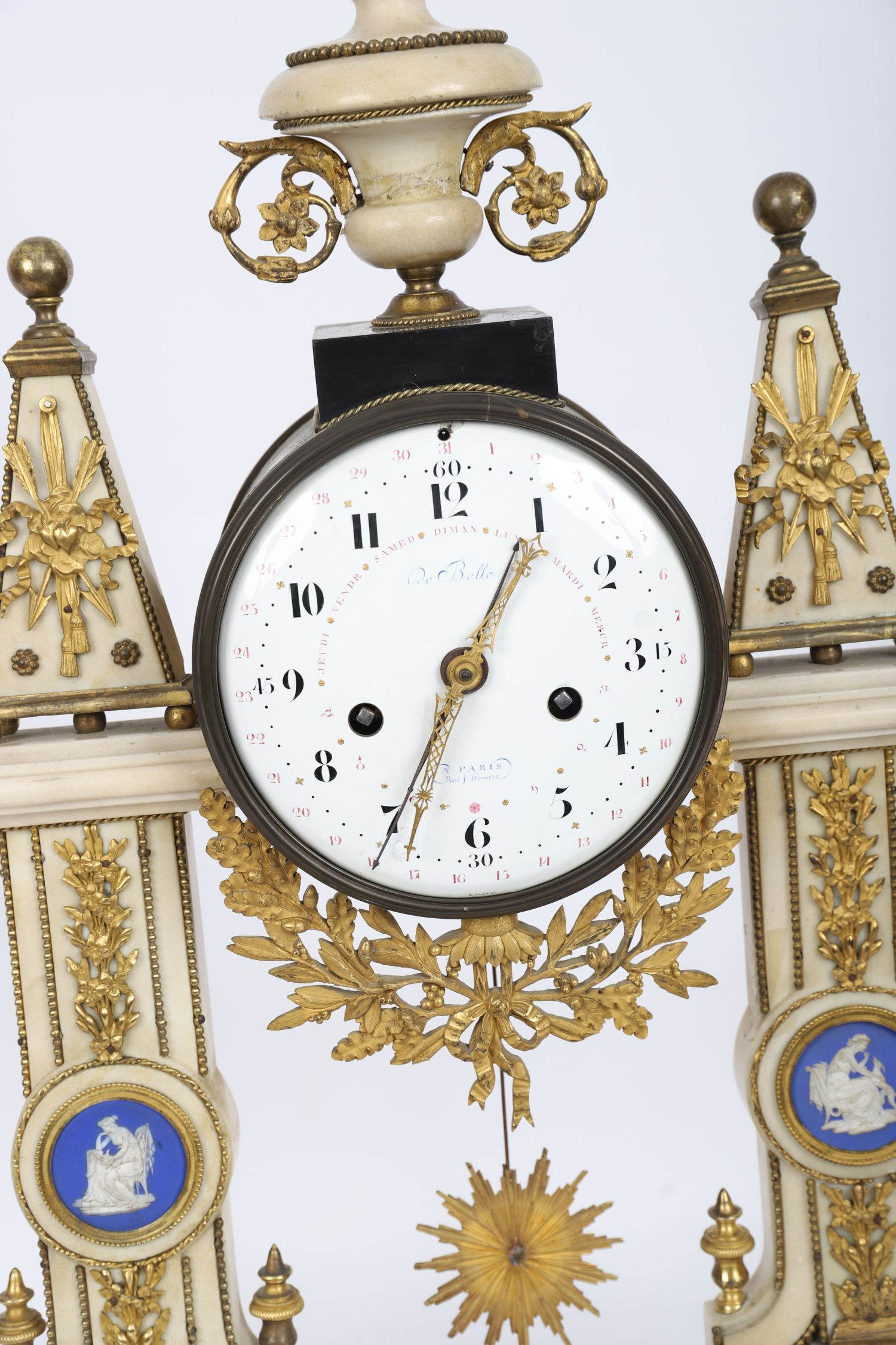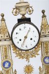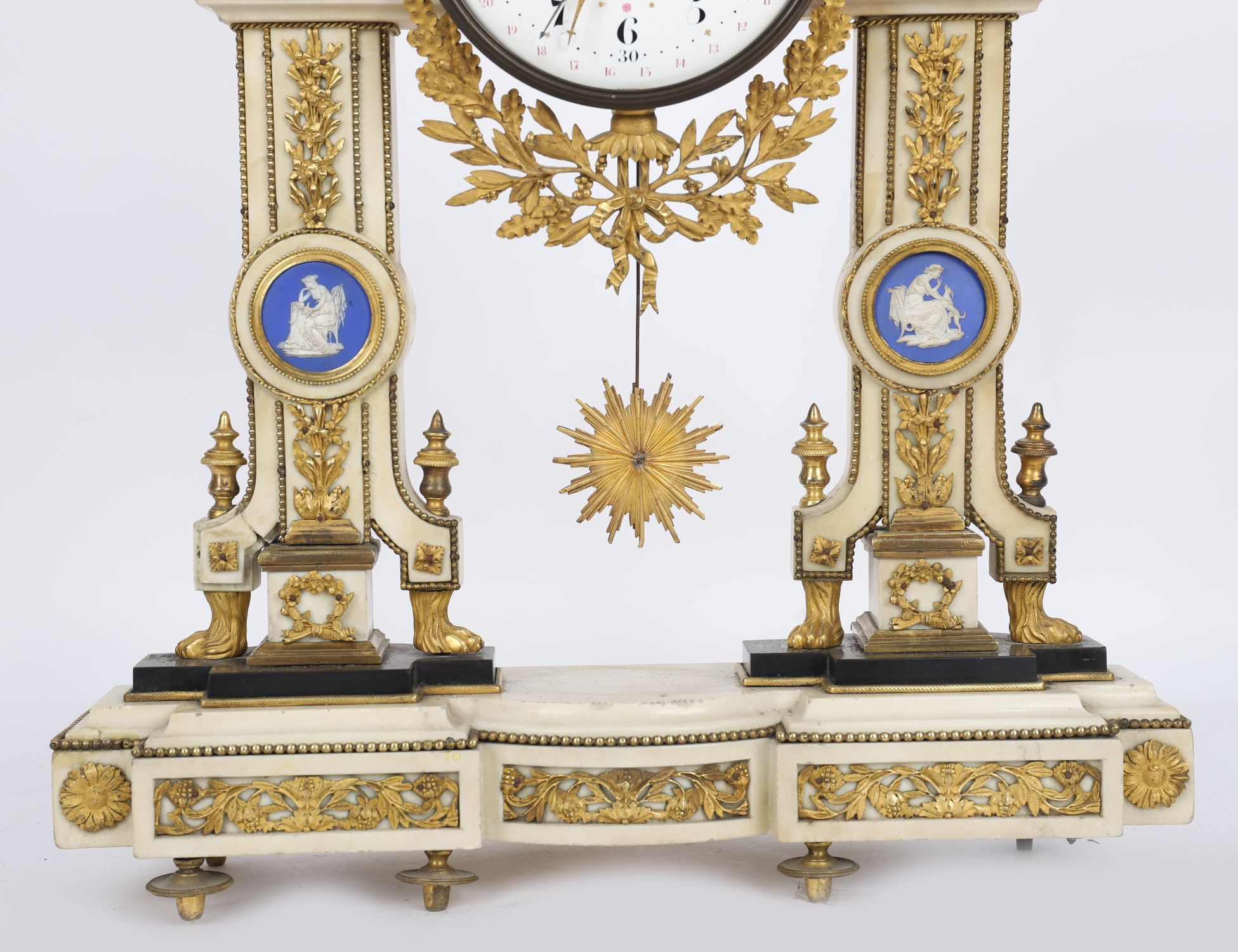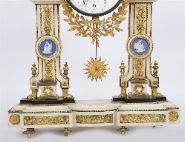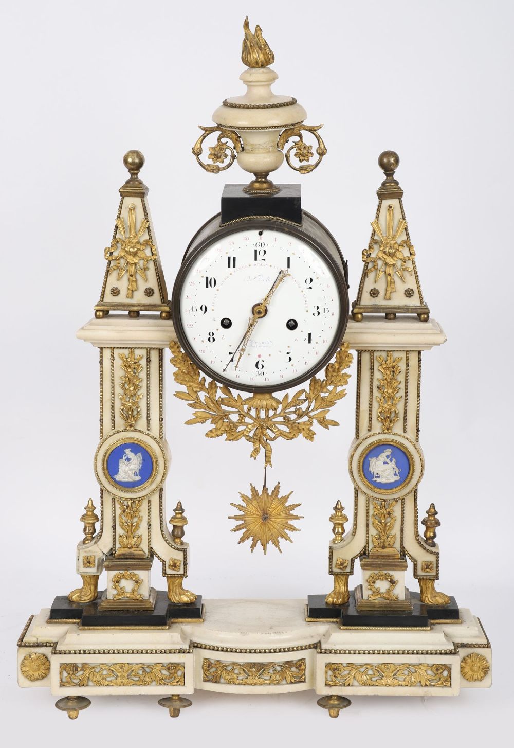 A rare 19th century French mantel clock of architectural design, constructed in ormolu and white marble with Wedgwood-style jasperware medallions depicting classical figures. The enamel dial signed “R. Pardi, à Paris.” Flanked by twin obelisks surmounted with ormolu finials, the base with laurel wreath and sunburst pendulum.
