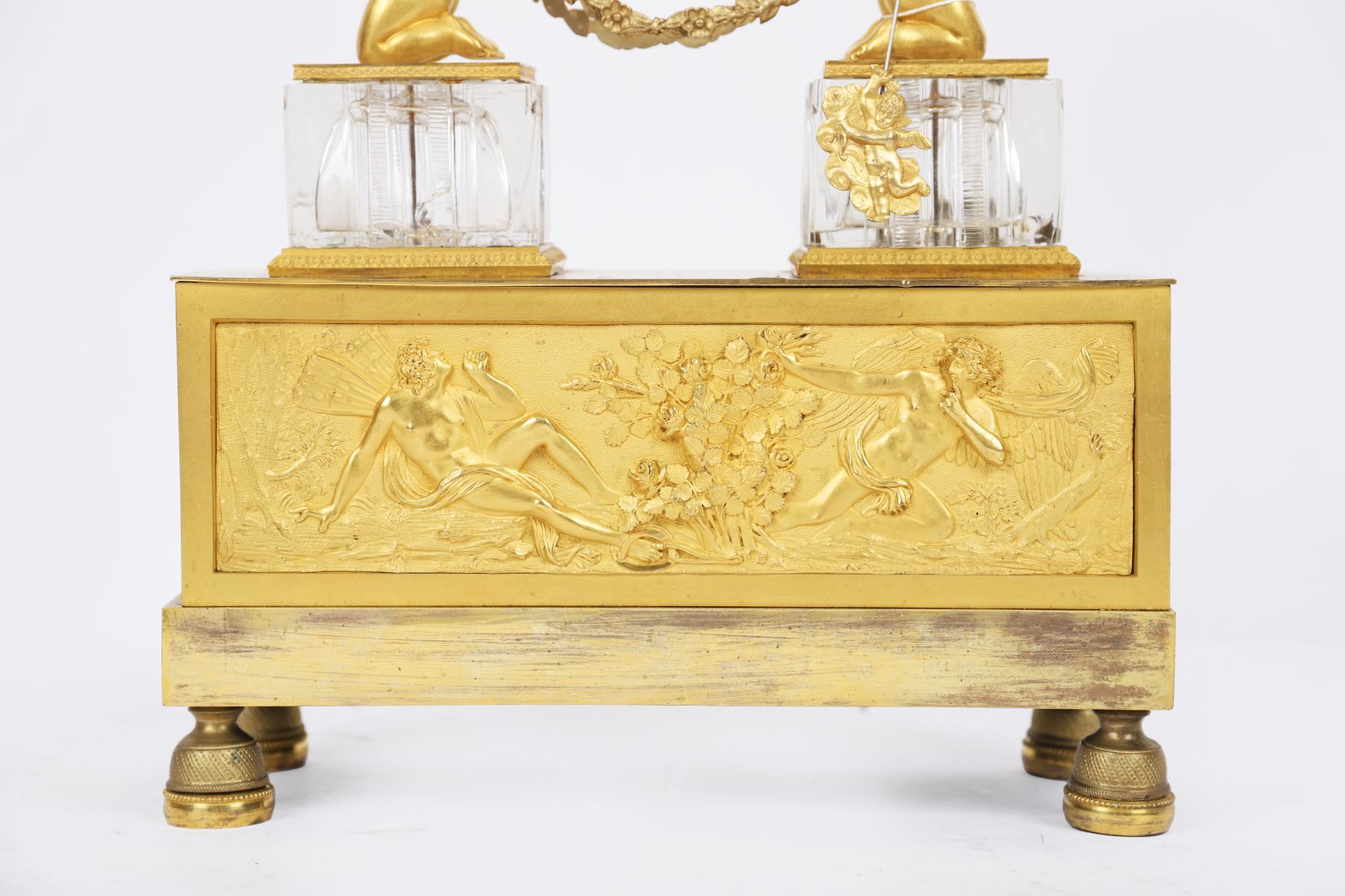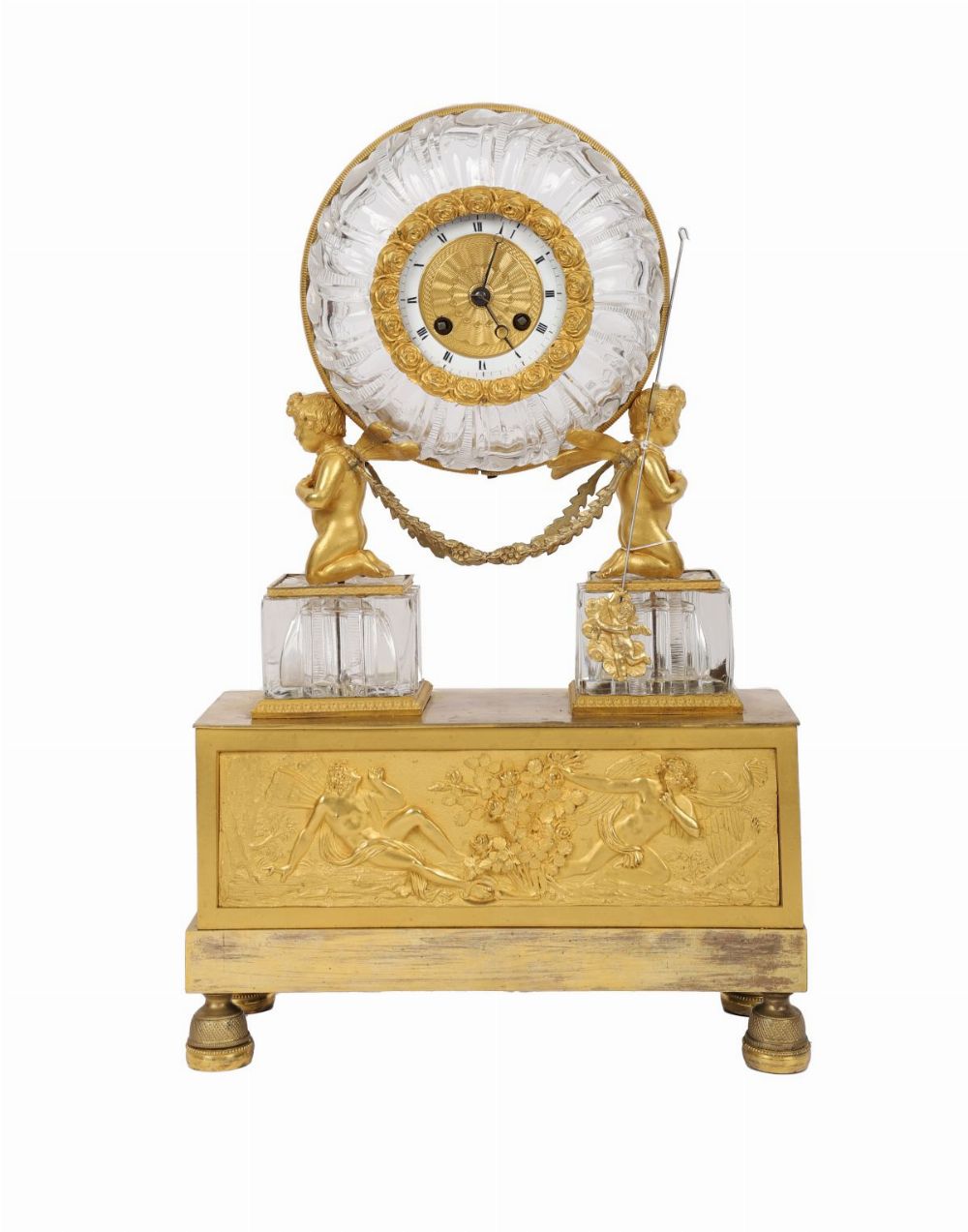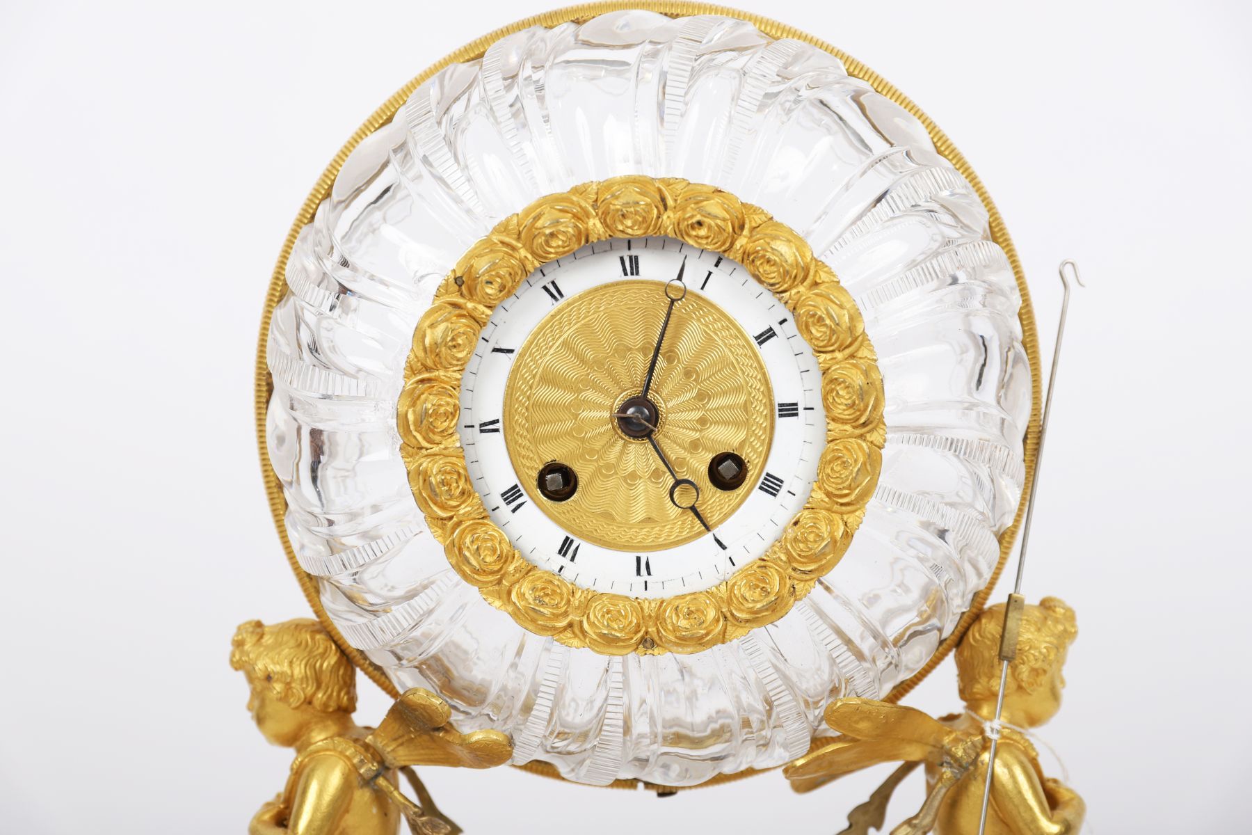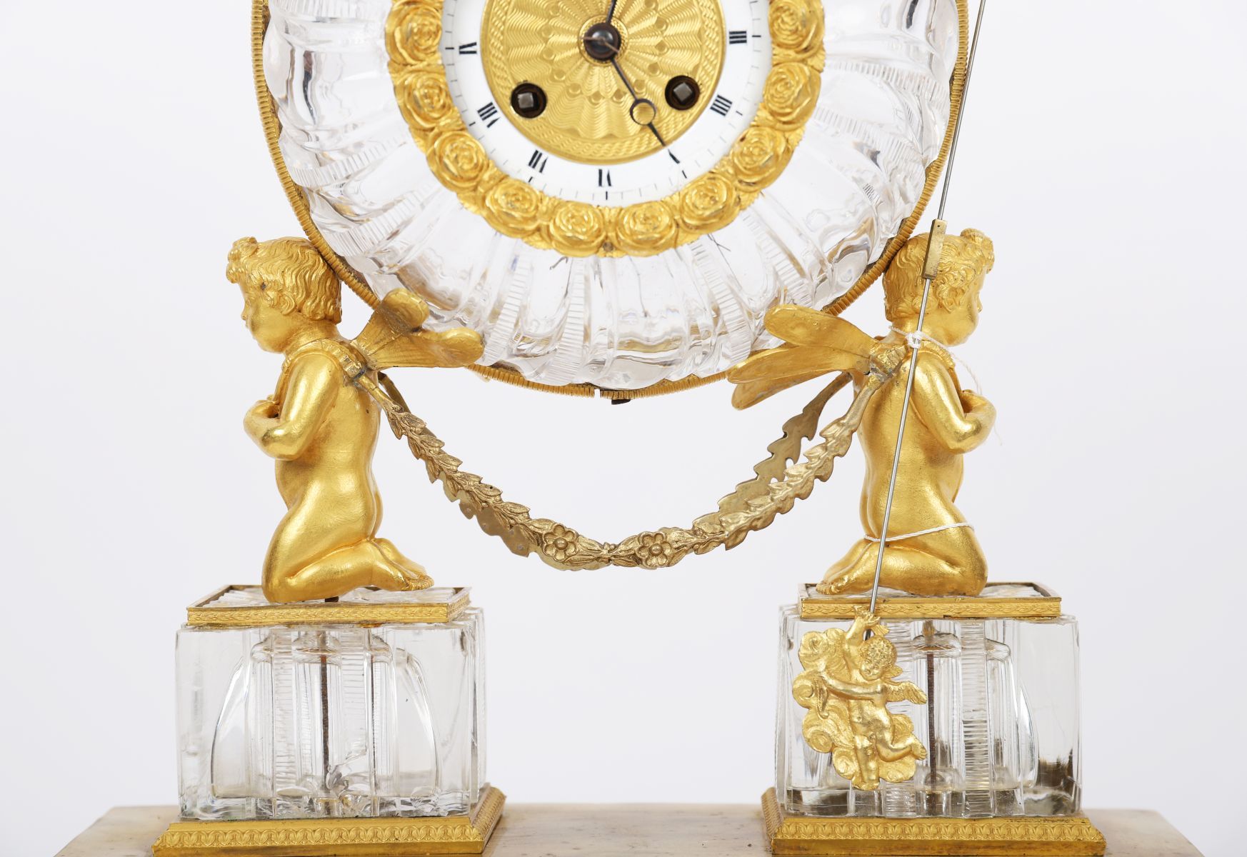 A rare 19th-century French ormolu and cut rock crystal mantel clock, the circular dial with Roman numerals within a floral gilt bezel, surmounted by twin cherubs and mounted on a rectangular ormolu base cast with musical and floral motifs.