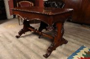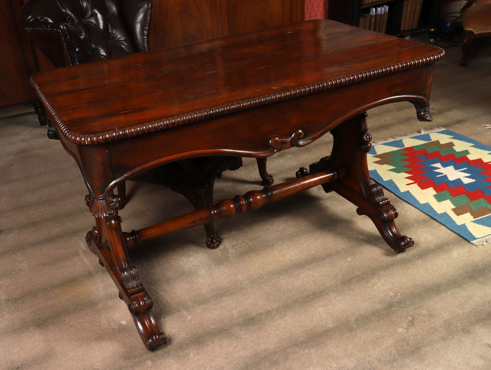Rare 19th-century yew wood library table with rectangular top, raised on boldly carved supports and shaped feet. Richly figured timber throughout.