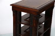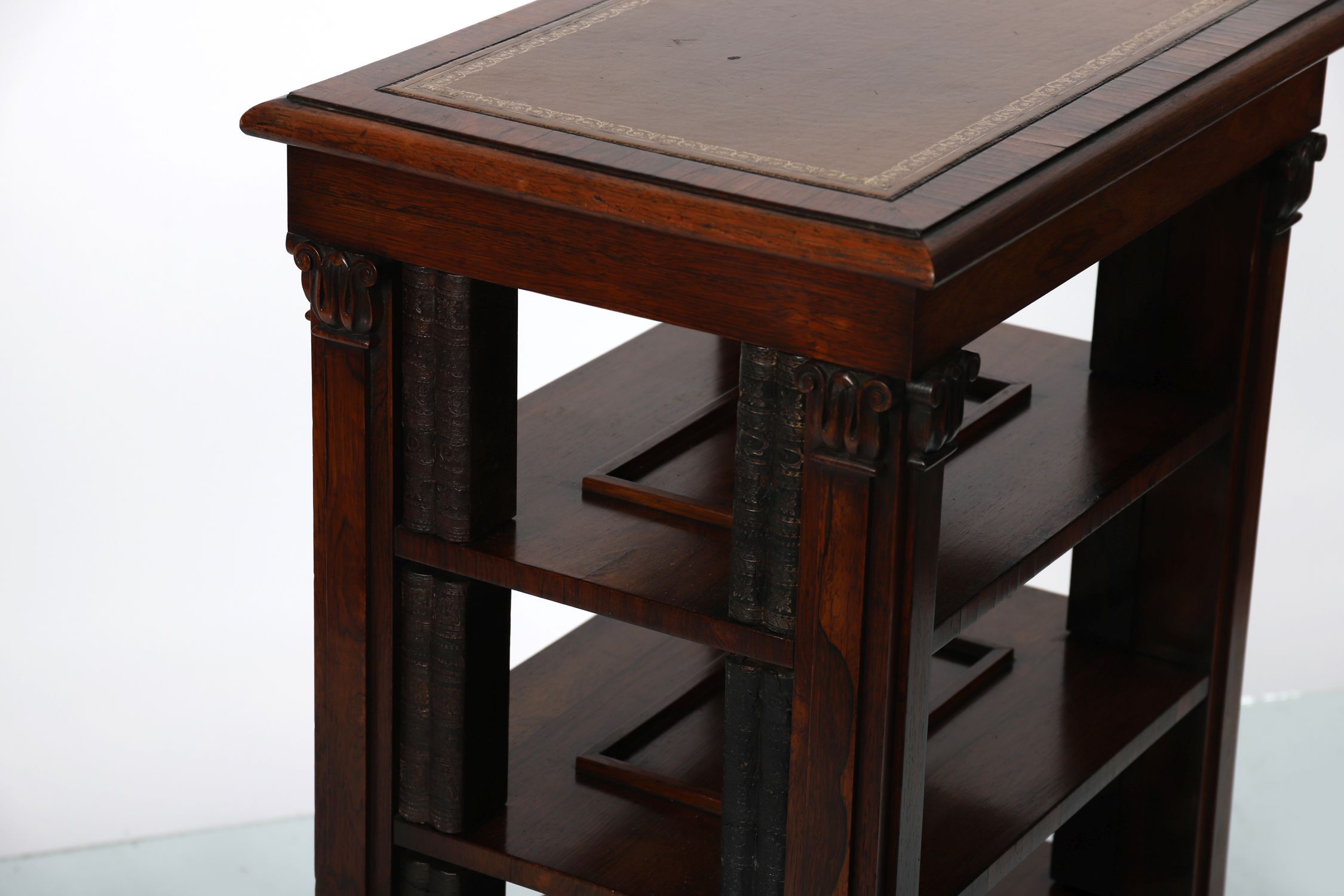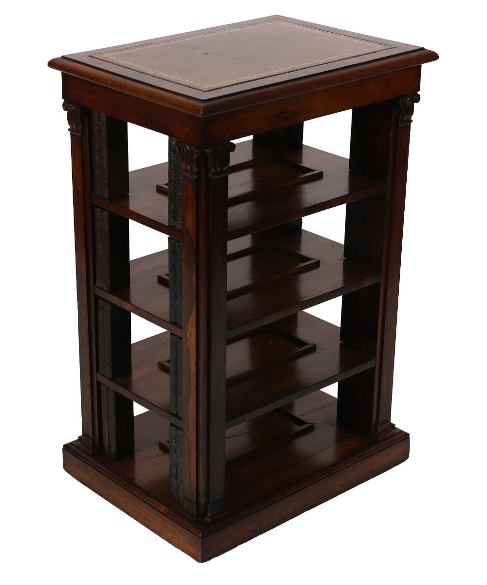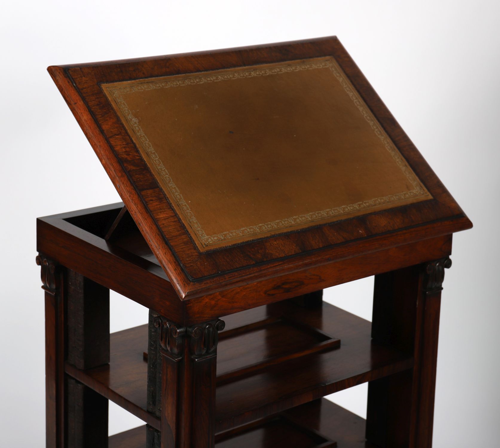 A rare and important William IV period revolving book stand, attributed to Williams & Gibton of Dublin, the square top with inset tooled leather panel, above faux book-spine supports and open tiers, the corners capped with carved anthemion scrolls.