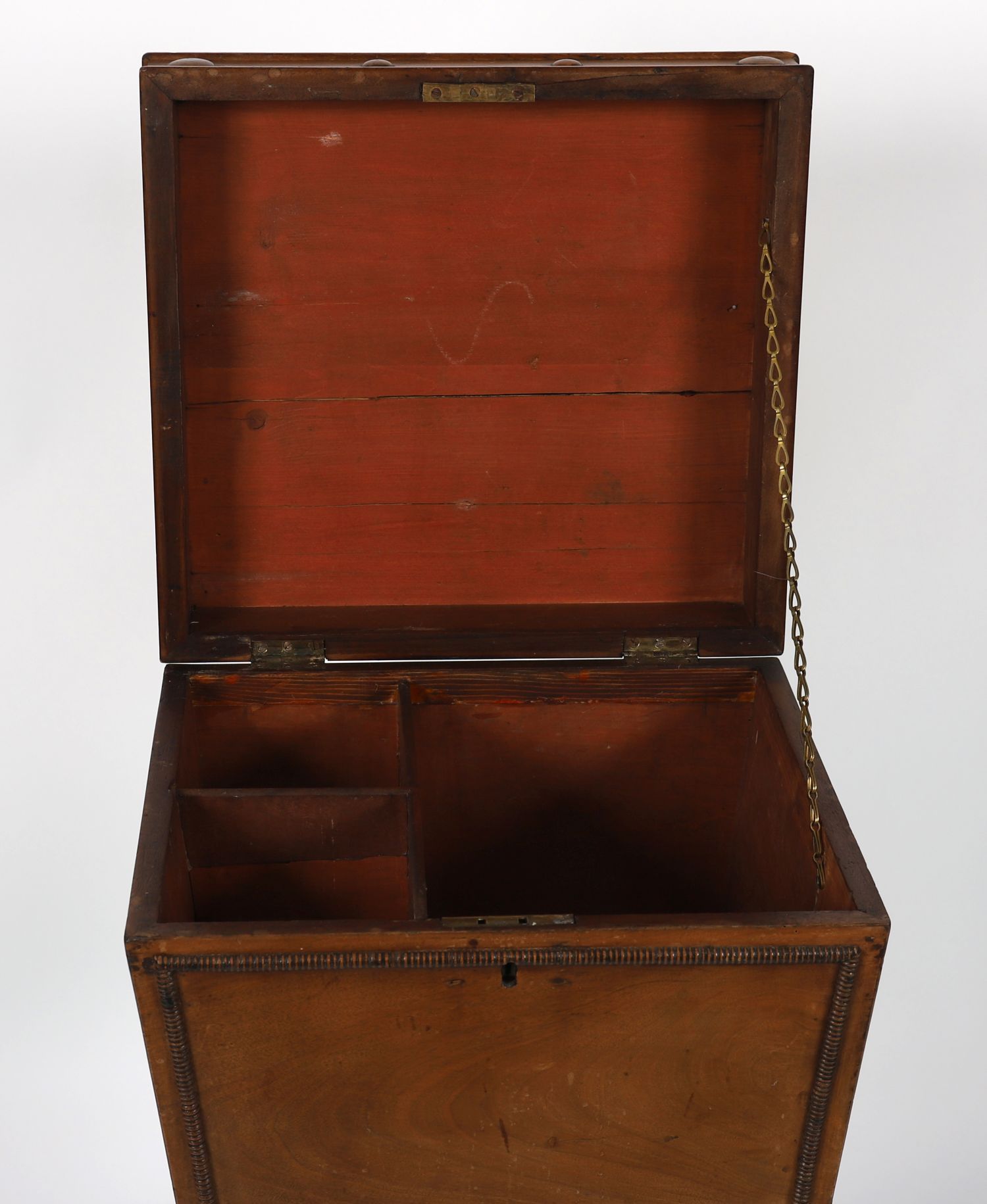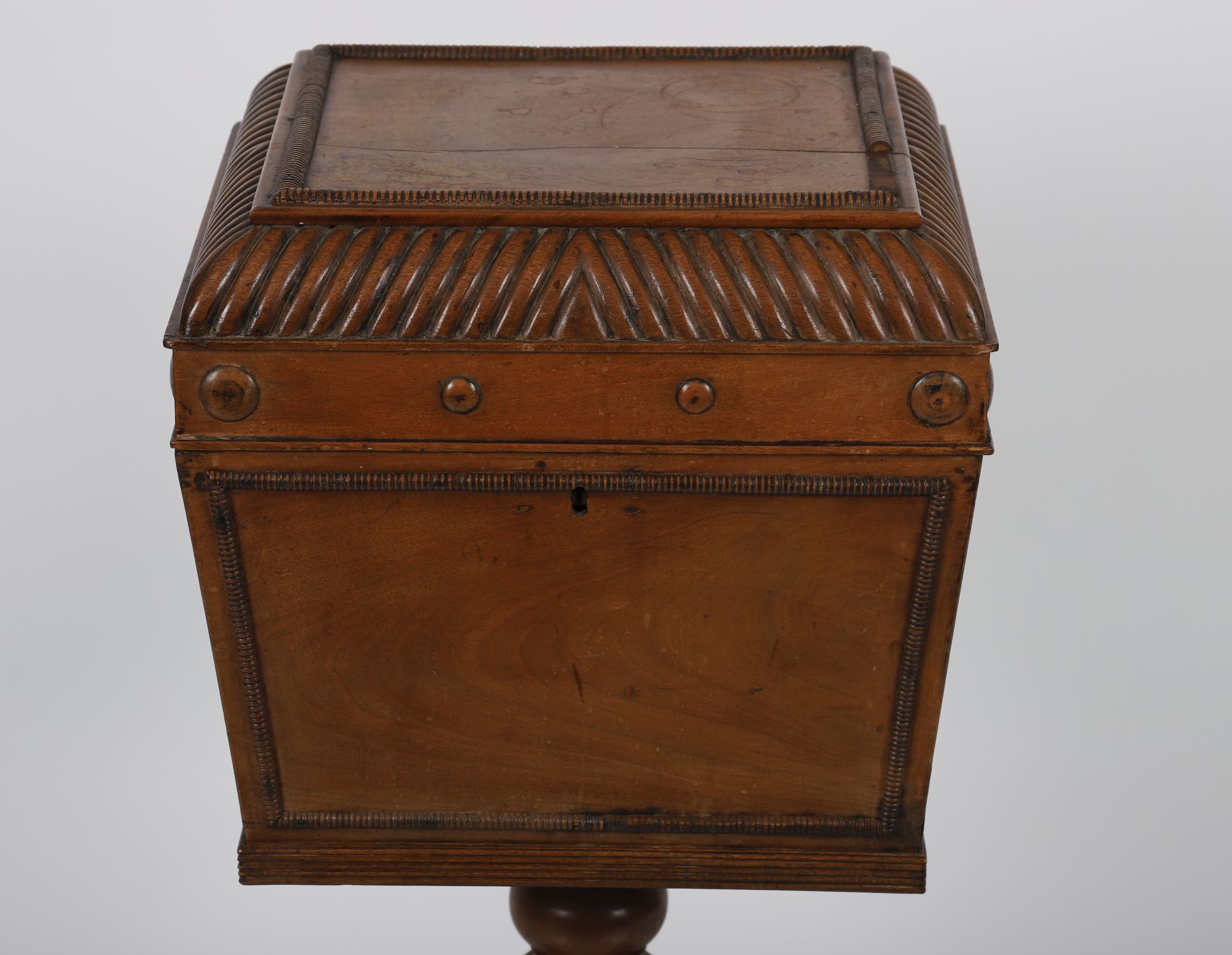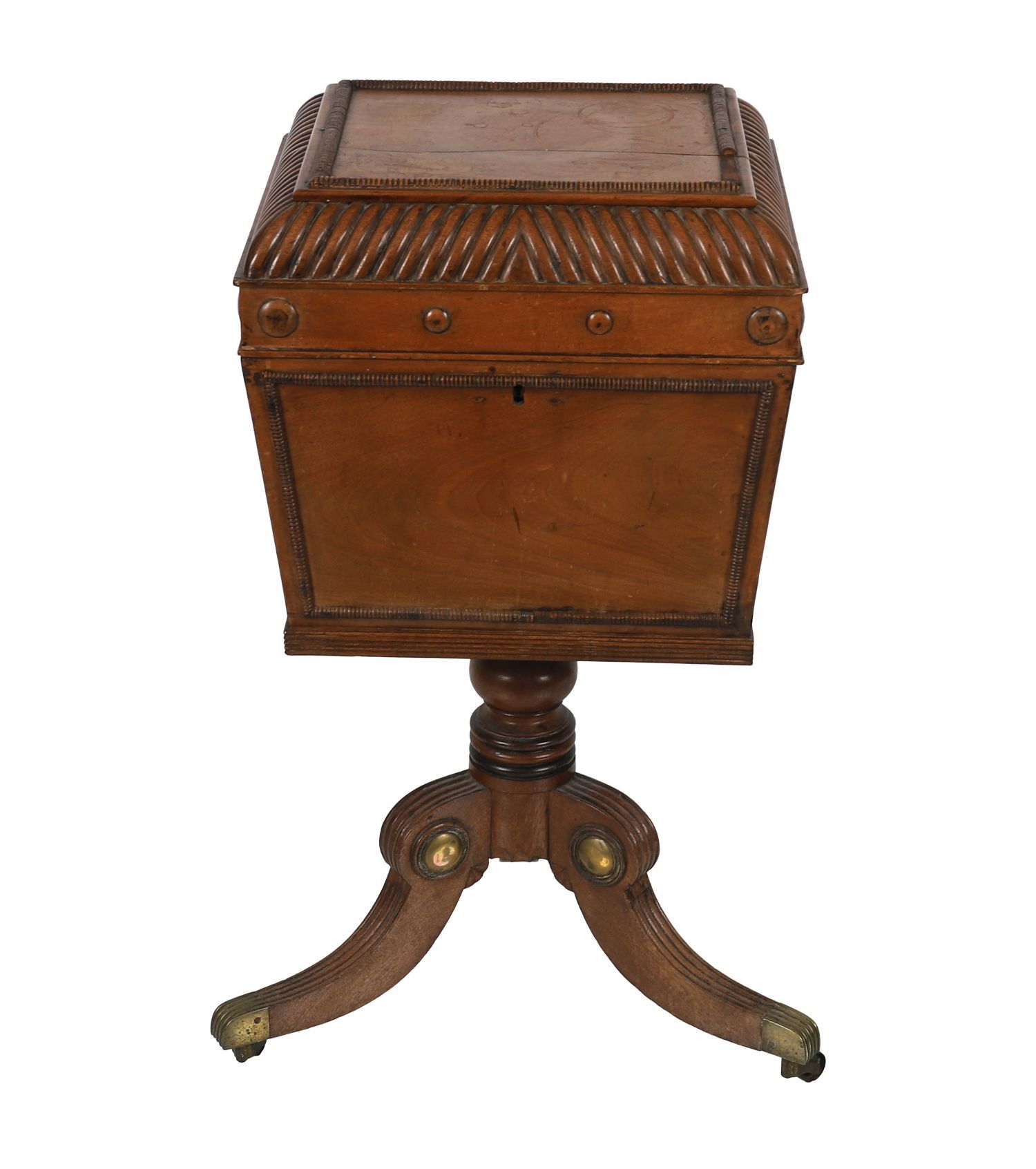 A Cork Regency period teapoy with a gadrooned lift-up lid opening to a fitted interior, the sarcophagus-shaped body raised on a turned stem and sabre legs with brass studs and castors.