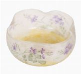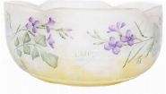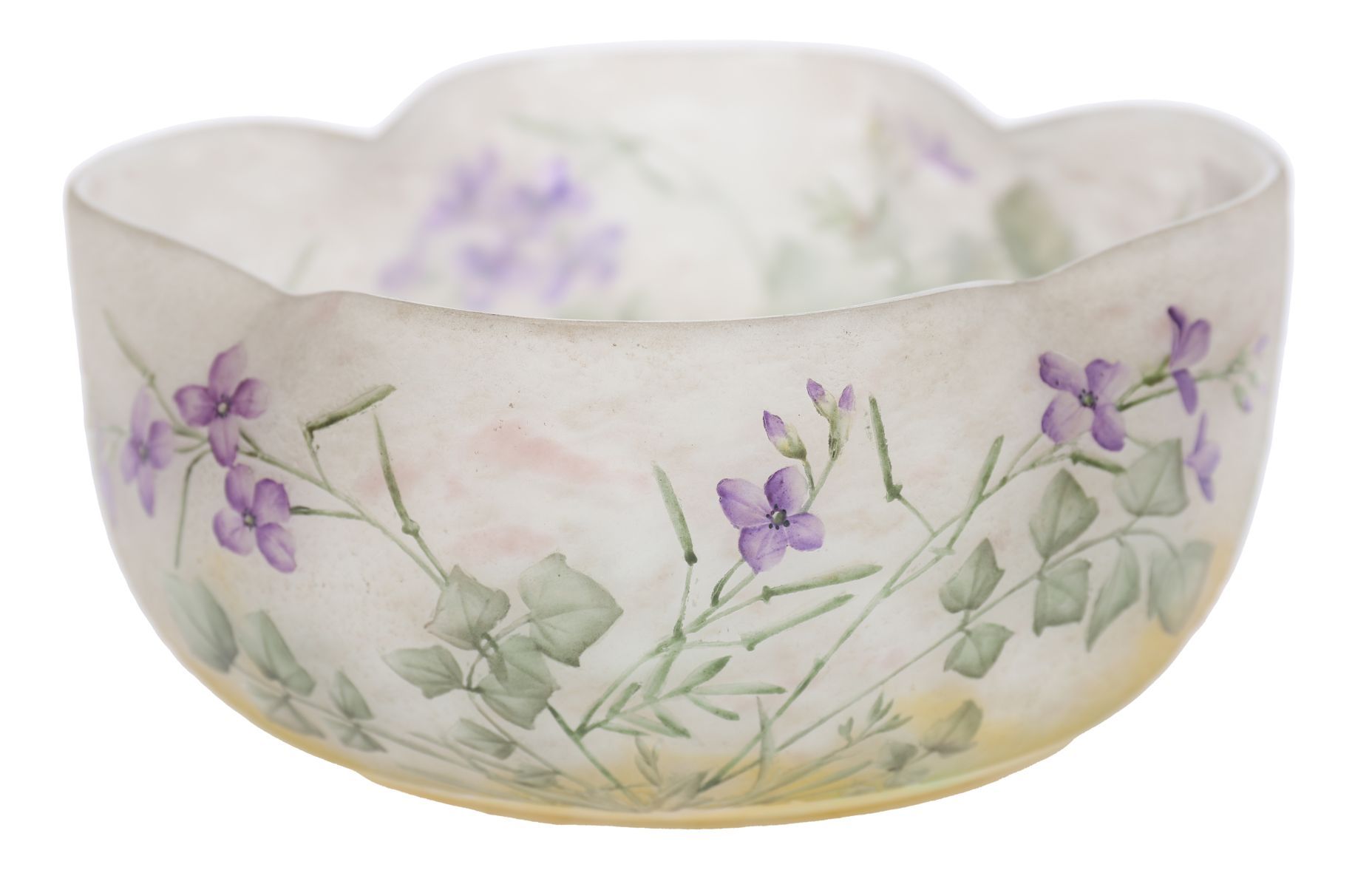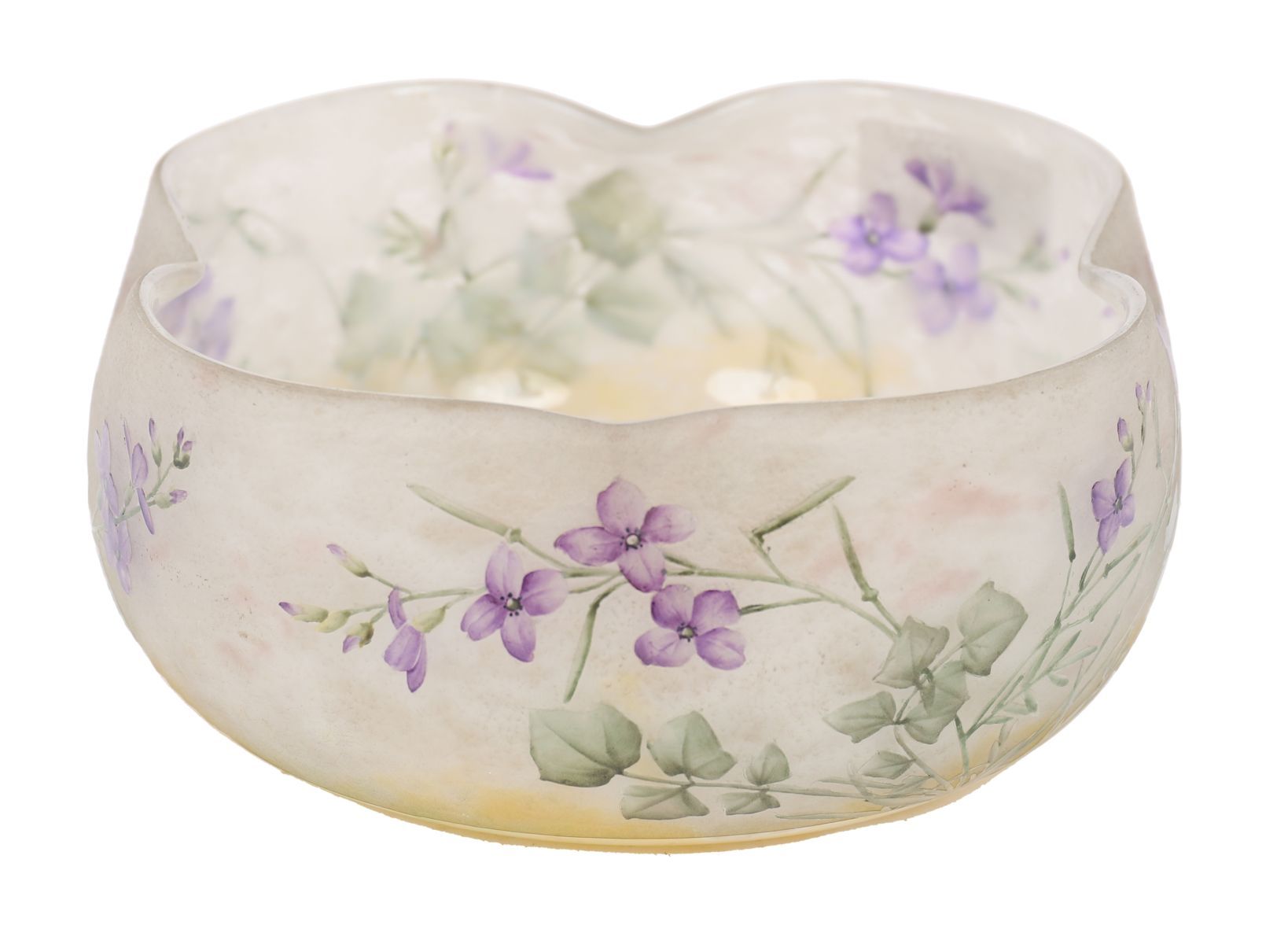 Broad bowl of softly undulating form, the glass acid-etched and enamelled with violets and foliage on a shaded ground, in pale lilac, green and amber tones, bearing the etched Daum Nancy signature.