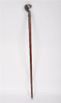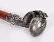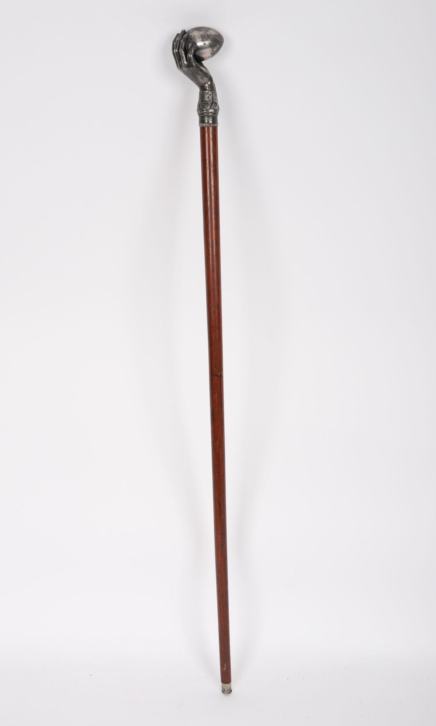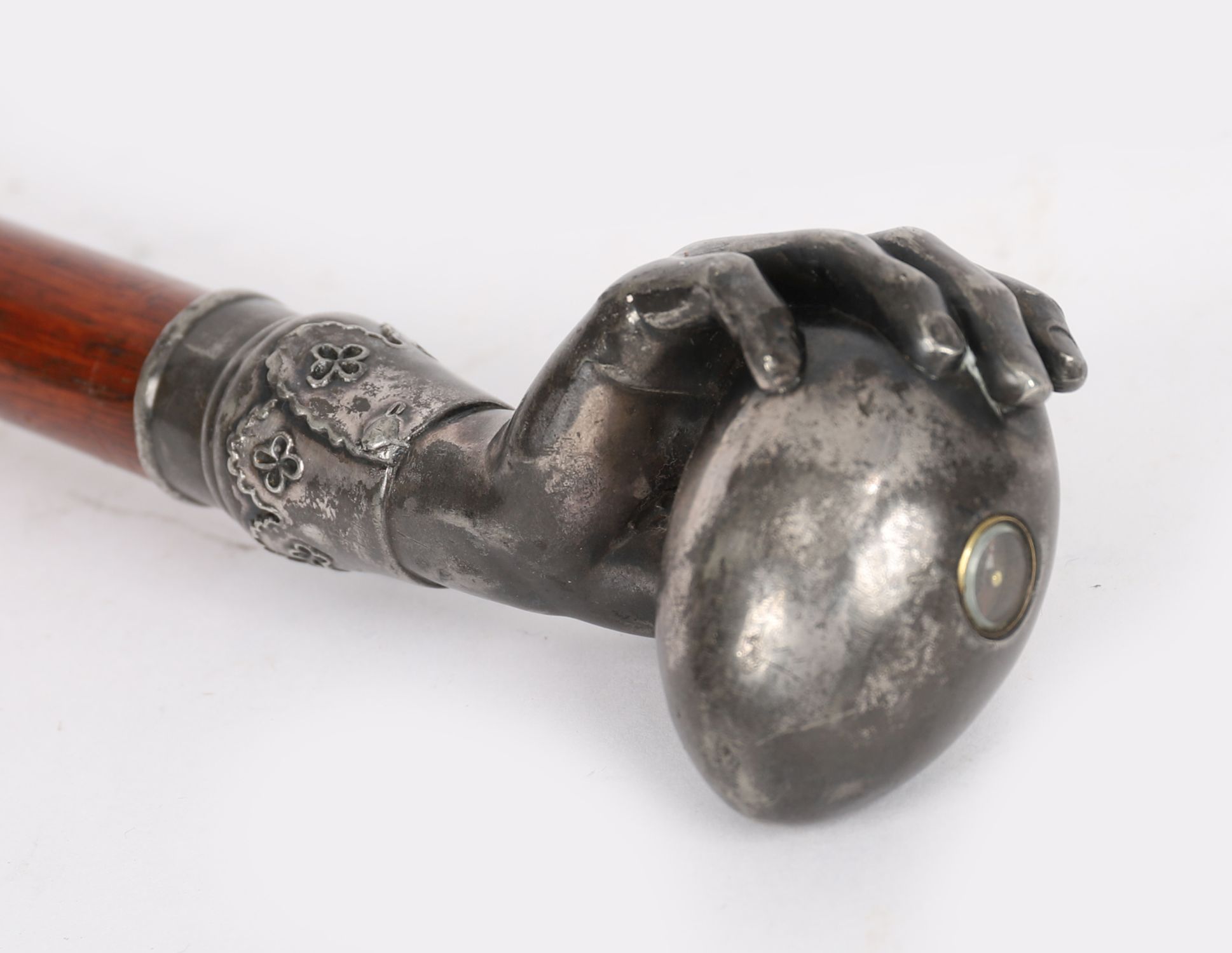 An unusual late 19th-century walking stick, the handle cast as a hand grasping an egg-shaped finial, which conceals a working compass. The hand is detailed with engraved cuff decoration, mounted on a straight hardwood shaft terminating in a metal ferrule.