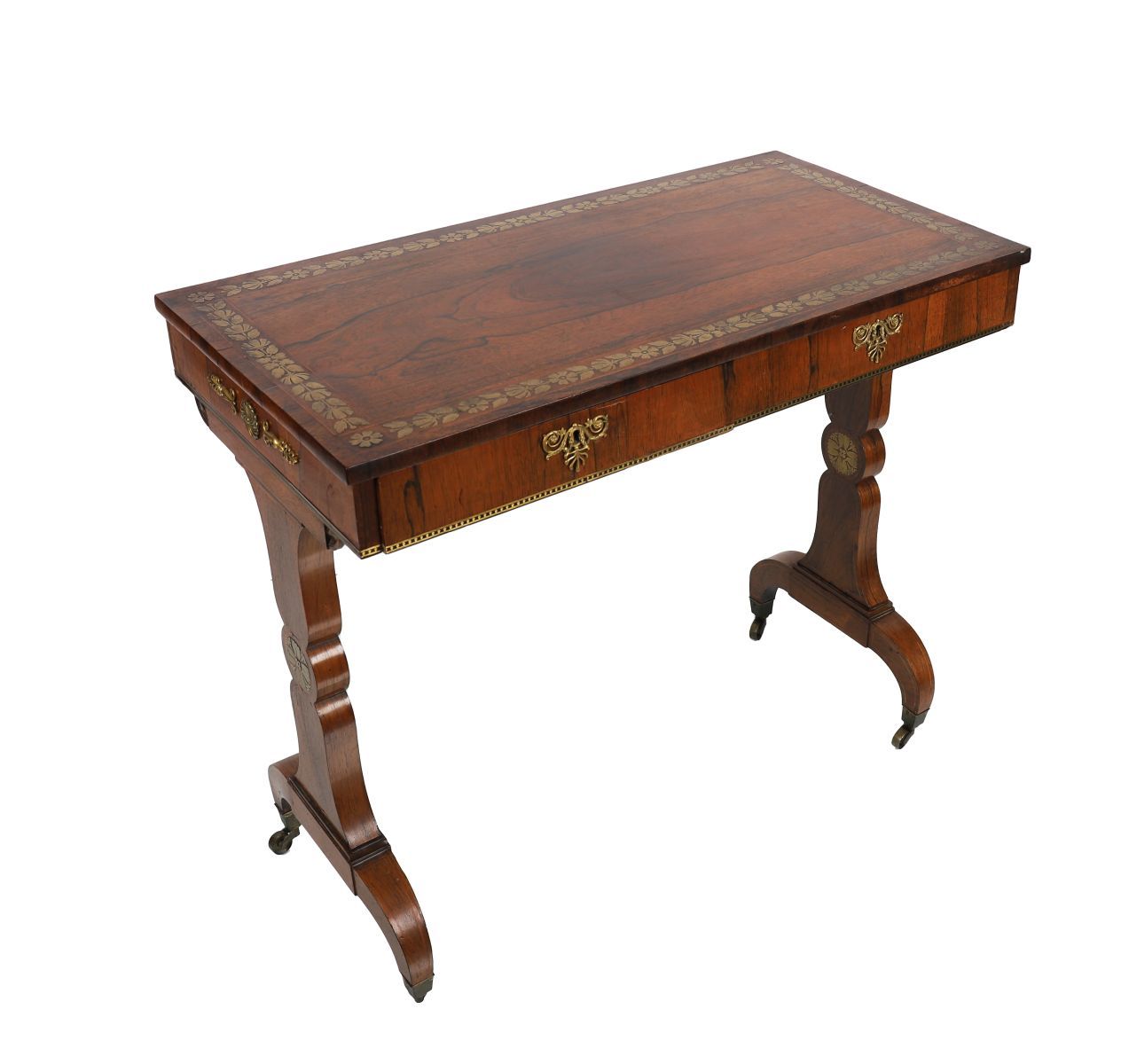 A fine and rare Regency period rosewood and brass-inlaid library table, the rectangular top with a broad brass marquetry border of foliate design, above a single frieze drawer with gilt-brass mounts, raised on twin lyre-form supports joined by a stretcher and terminating in brass castors.