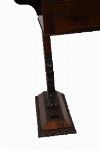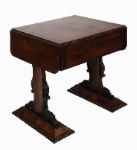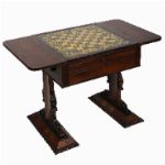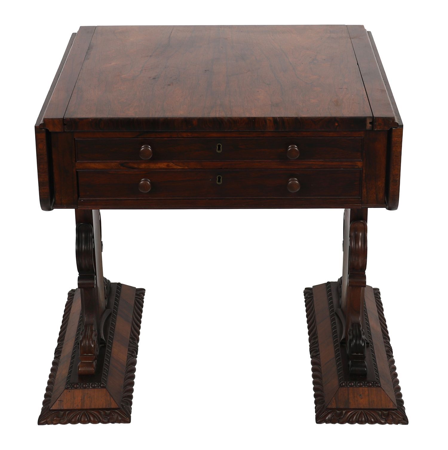A highly unusual William IV period rosewood games table, the rectangular form with hinged and reversible top revealing a lacquered black and gilt chequerboard panel, folding down to a compact games table. Fitted with two frieze drawers and raised on carved trestle end supports with scroll feet, mounted on gadrooned platformsunited by a stretcher.