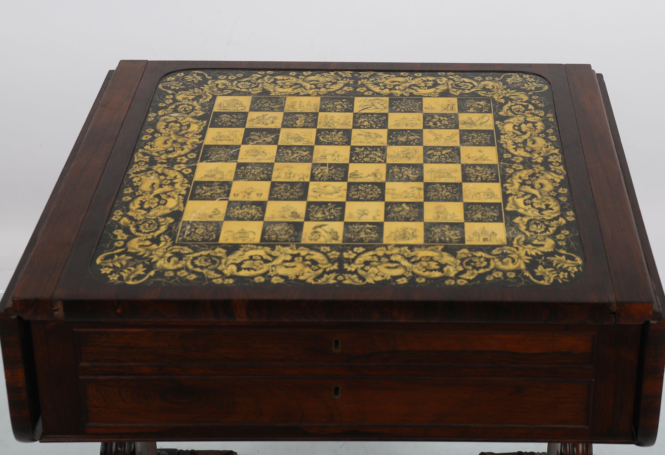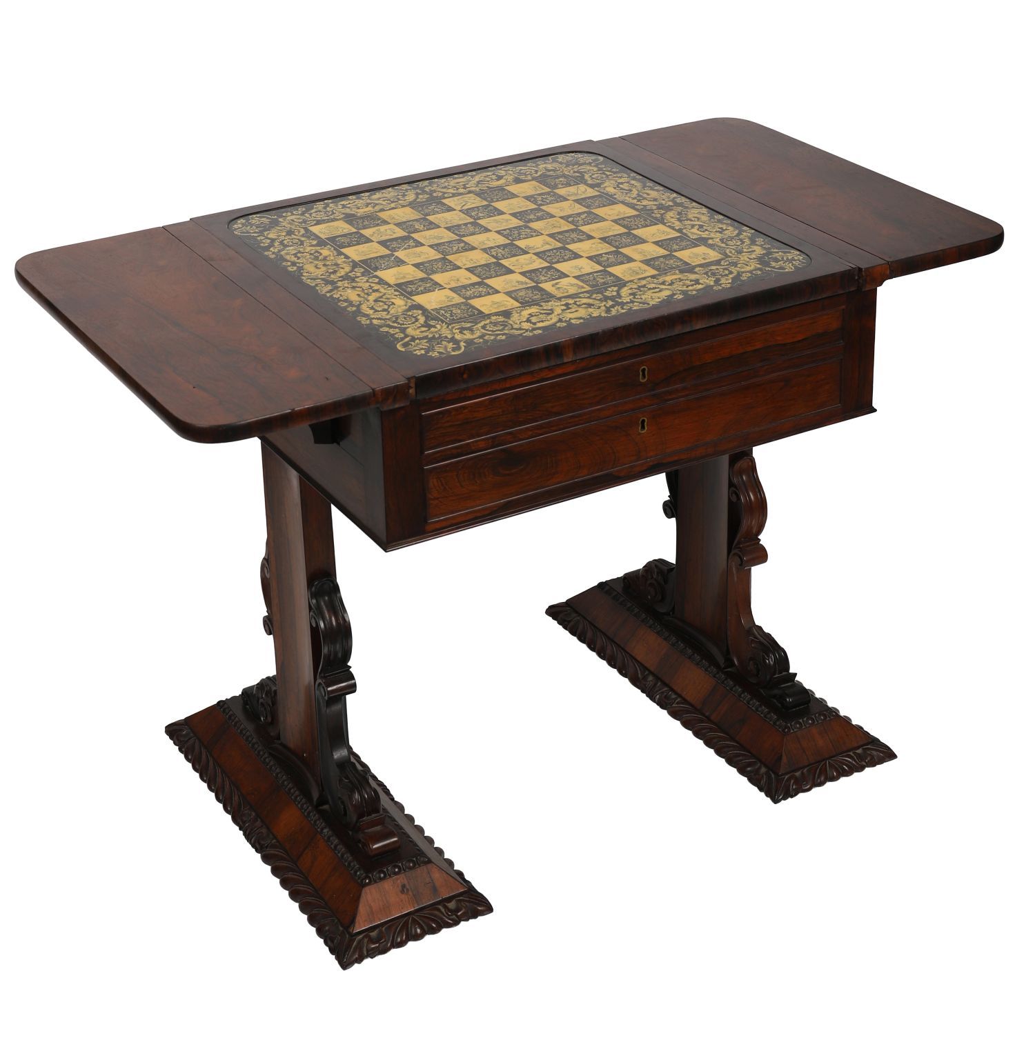 Lot 1341 RARE WILLIAM IV ROSEWOOD GAMES TABLE WITH REVERSIBLE LACQUERED CHEQUER BOARD