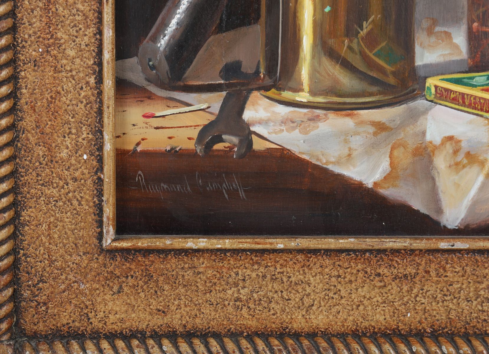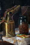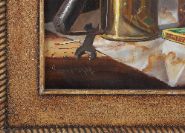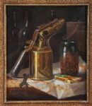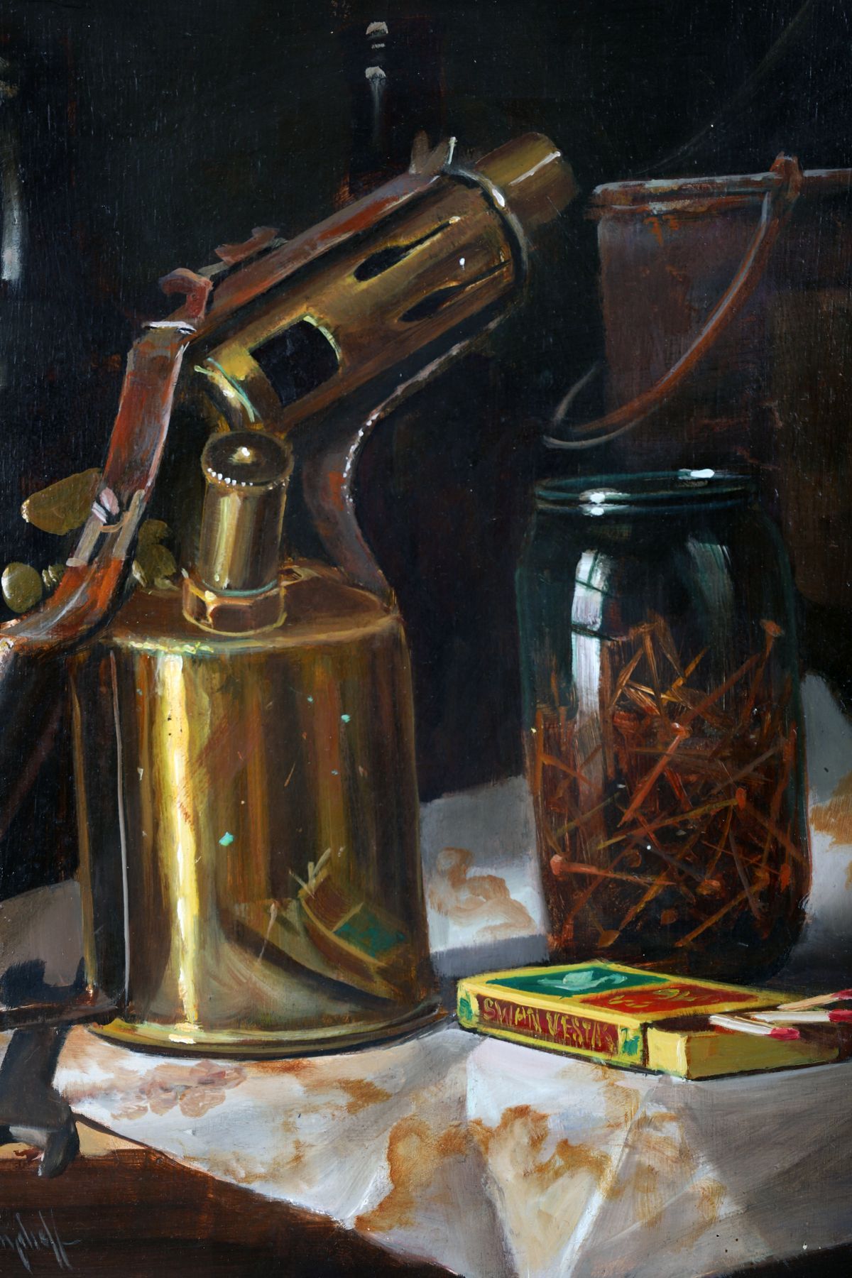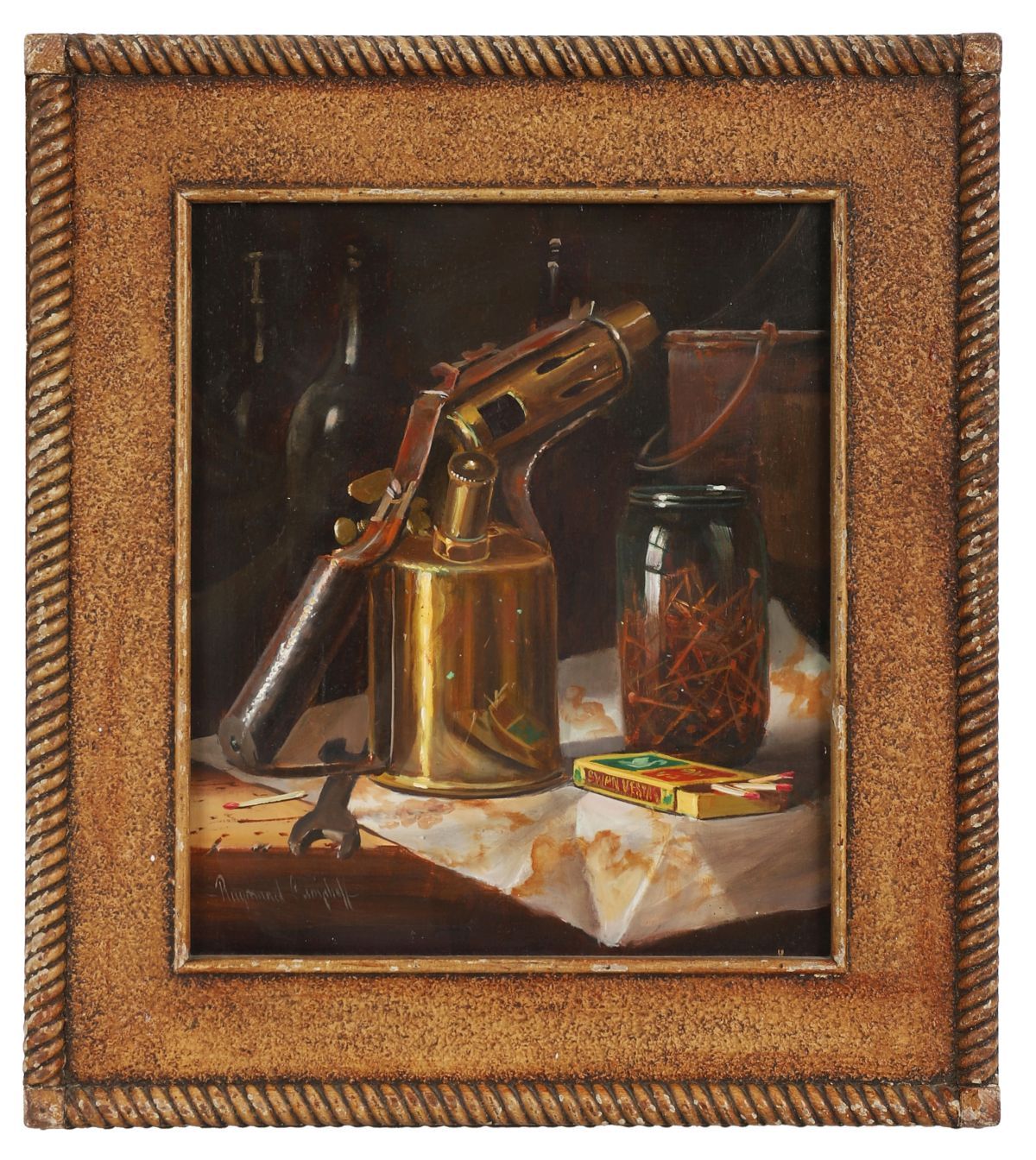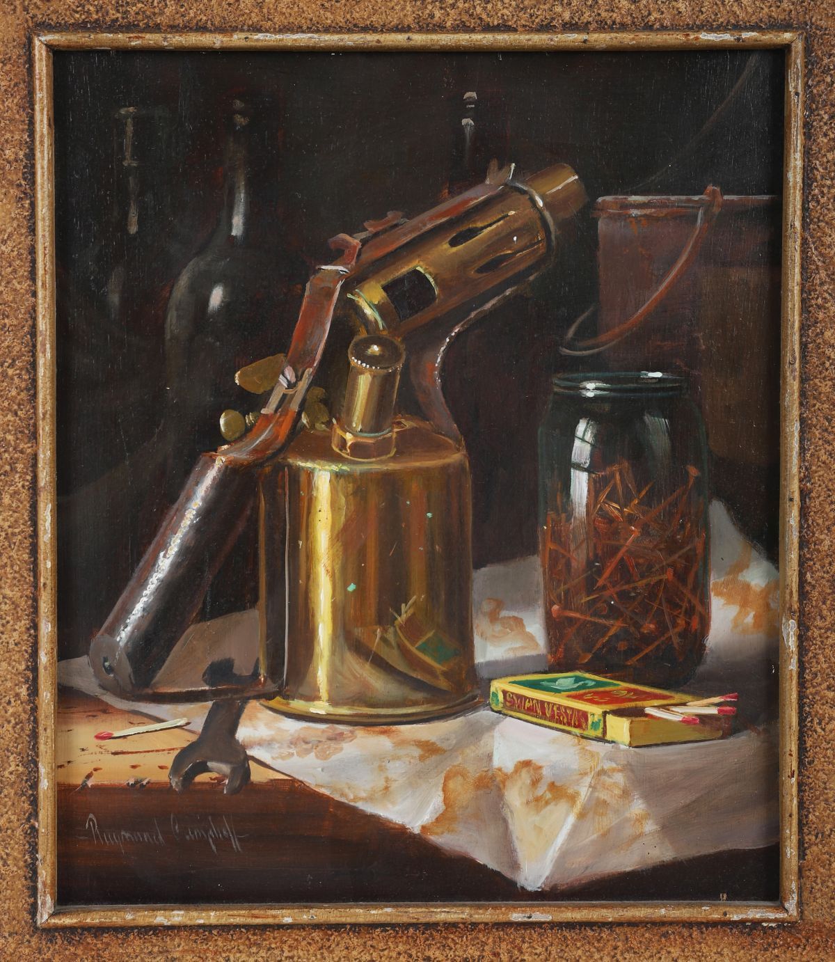 A finely rendered still life depicting a brass blowtorch, a glass jar filled with nails, and a boxed set of matches arranged on a draped surface. The meticulous realism highlights reflective metal, transparent glass and textured workshop objects. Signed lower left and presented in a textured gilt frame.