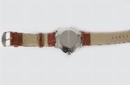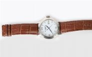 Classic round silver-tone case with white dial, applied Roman numerals, and date aperture. Paired with a brown crocodile-grain leather strap.