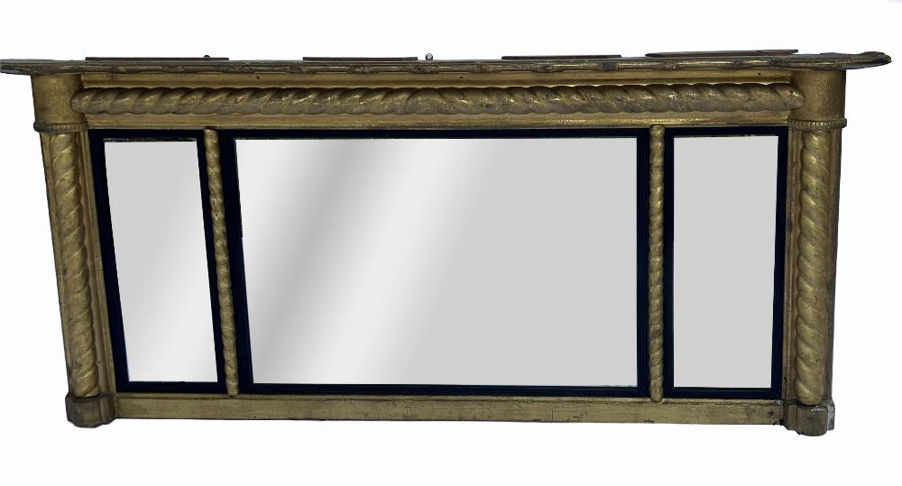 A Regency giltwood overmantel mirror of rectangular form, the plate divided into three sections, flanked by spiral columns and surmounted with rope twist and moulded cresting.