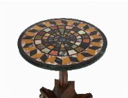 Circular specimen marble top inlaid with various coloured marbles including sienna, verde antico, and porphyry, mounted on a rosewood tripod base with gilt mounts.