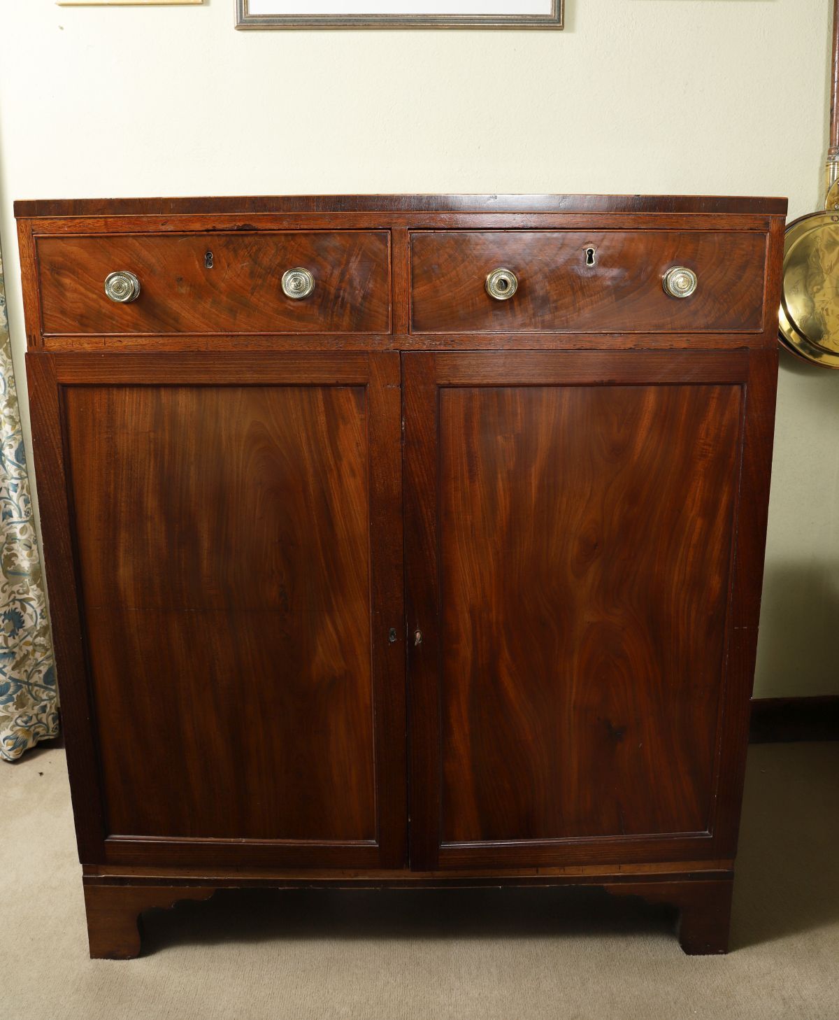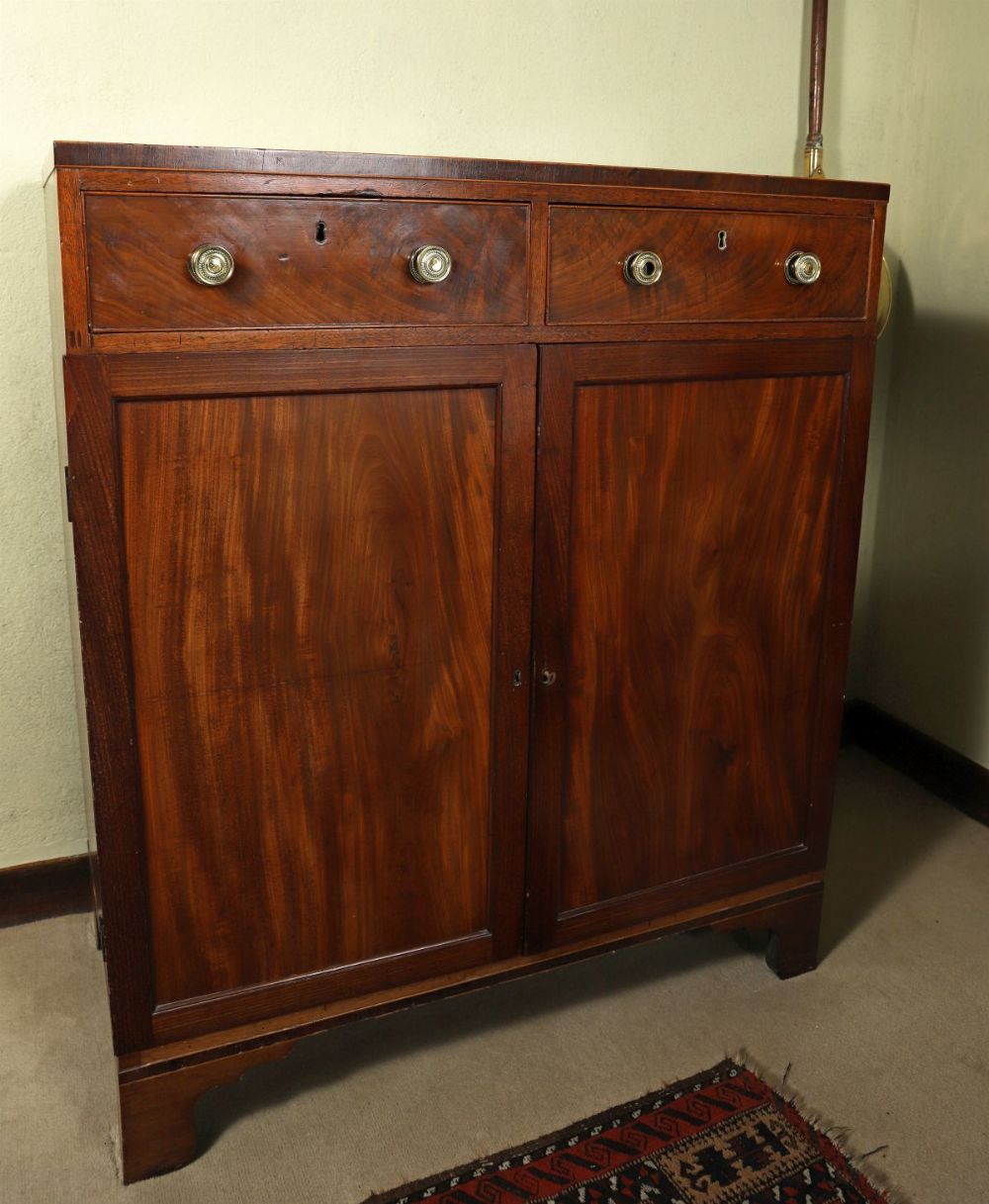 A Regency period mahogany blanket chest, the hinged lid with boxwood string inlay, above a plain front and raised on bracket feet.