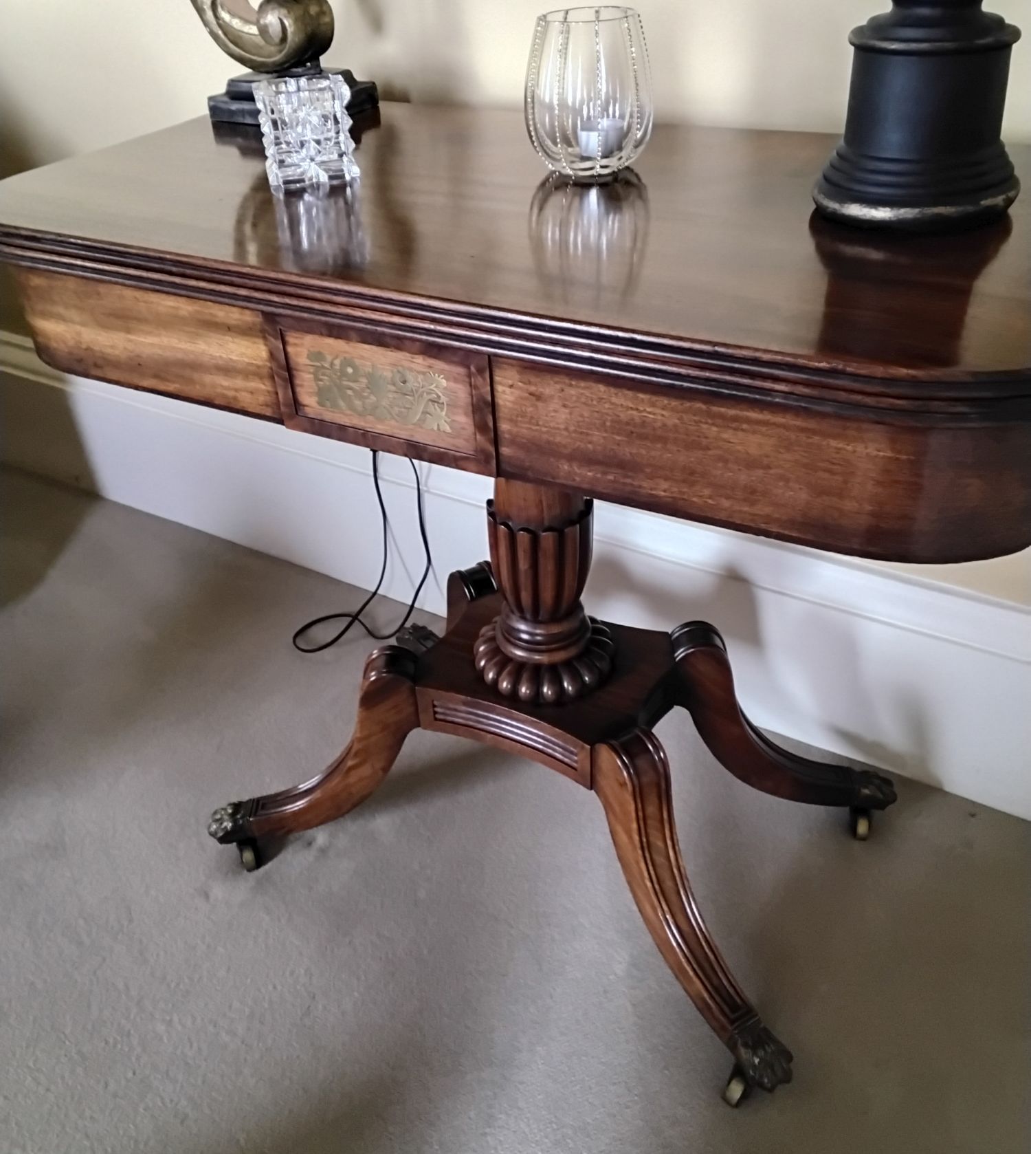An elegant Regency mahogany fold-over card table, the rectangular top opening to reveal a baize-lined playing surface, above a frieze with intricate brass stringing and inlay. The table is supported on a turned and reeded column stem and a sabre-legged quadra form base, terminating in brass claw feet and castors.