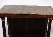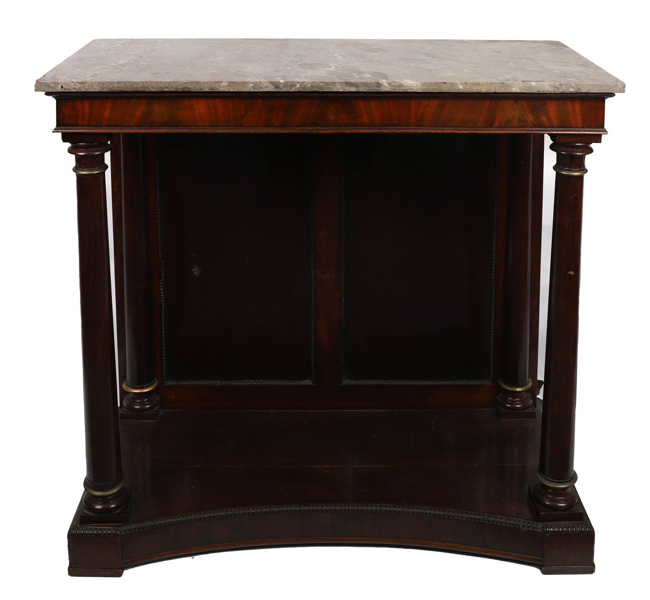 A Regency mahogany console table with grey marble top, supported on twin columns with brass mounts, the base with concave front and raised on a plinth.