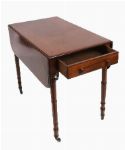 The rectangular-shaped top, with D-shaped drop leaves, sits above a real and opposing faux drawer furnished with turned wooden knobs, and is raised on turned legs terminating on brass cup casters.