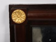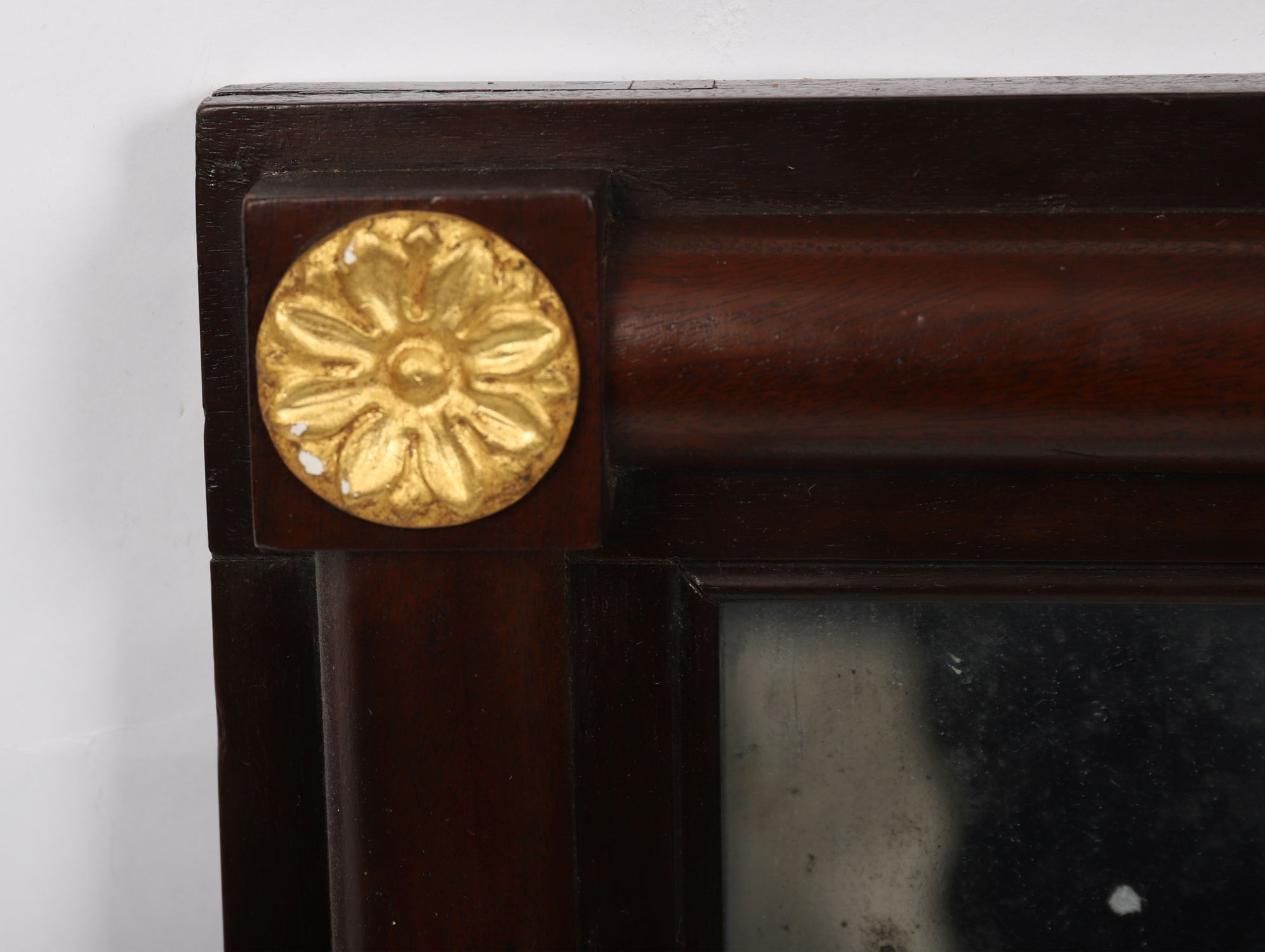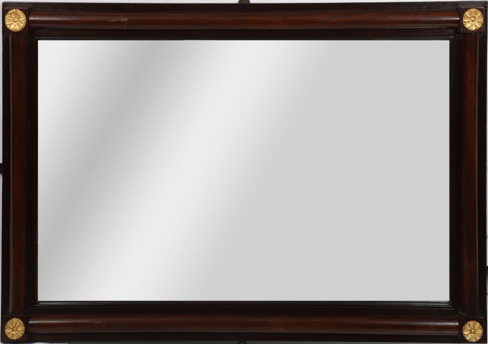A Regency mahogany framed pier or overmantle mirror, with half column sides and parcel-gilt roundel mounts at the corners. Original mirror plate with some age-related spotting.