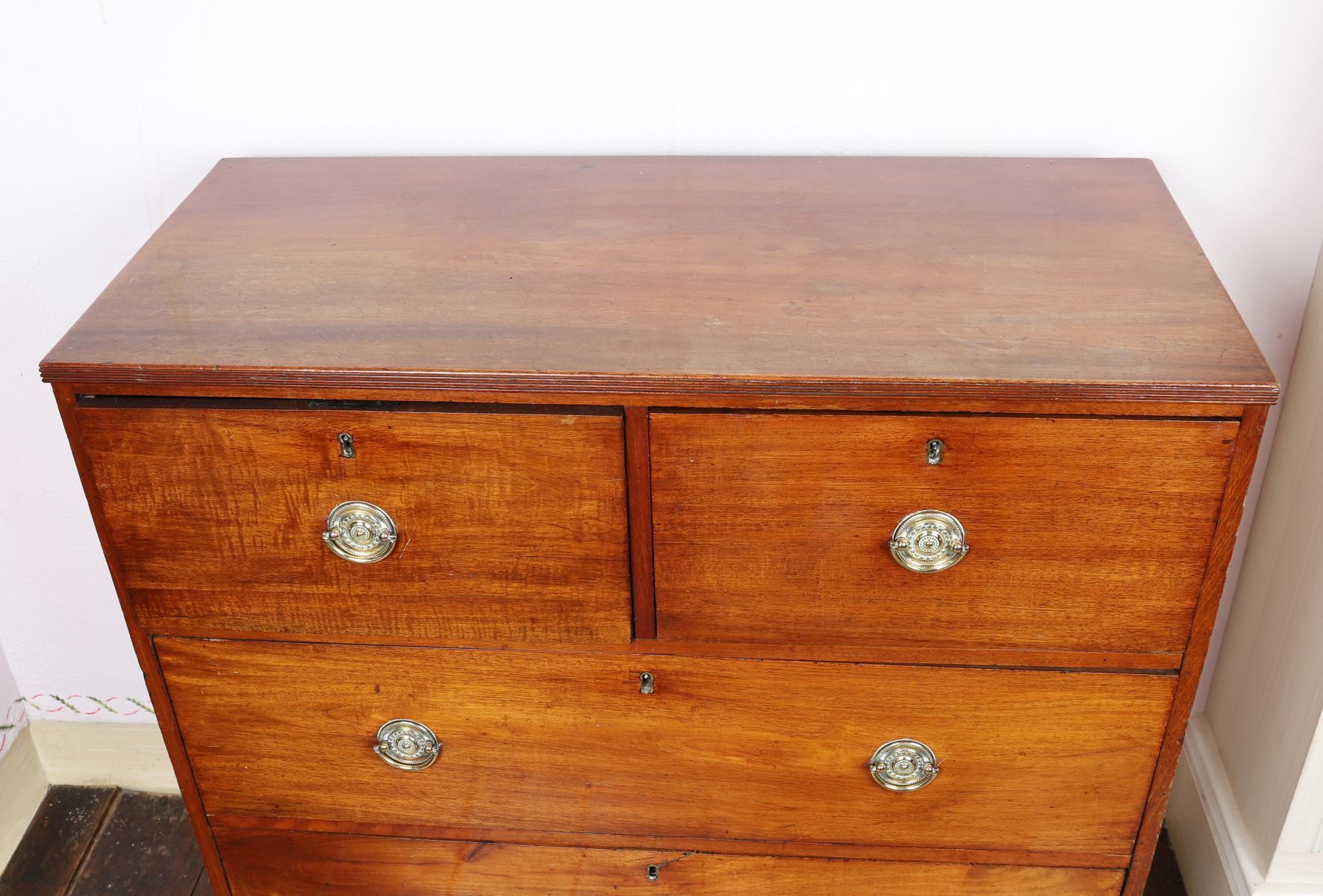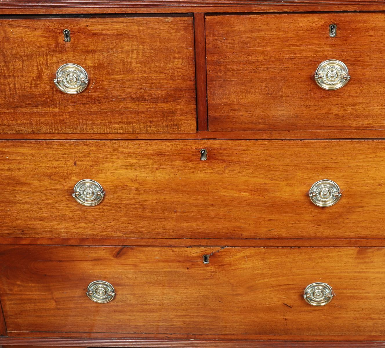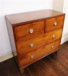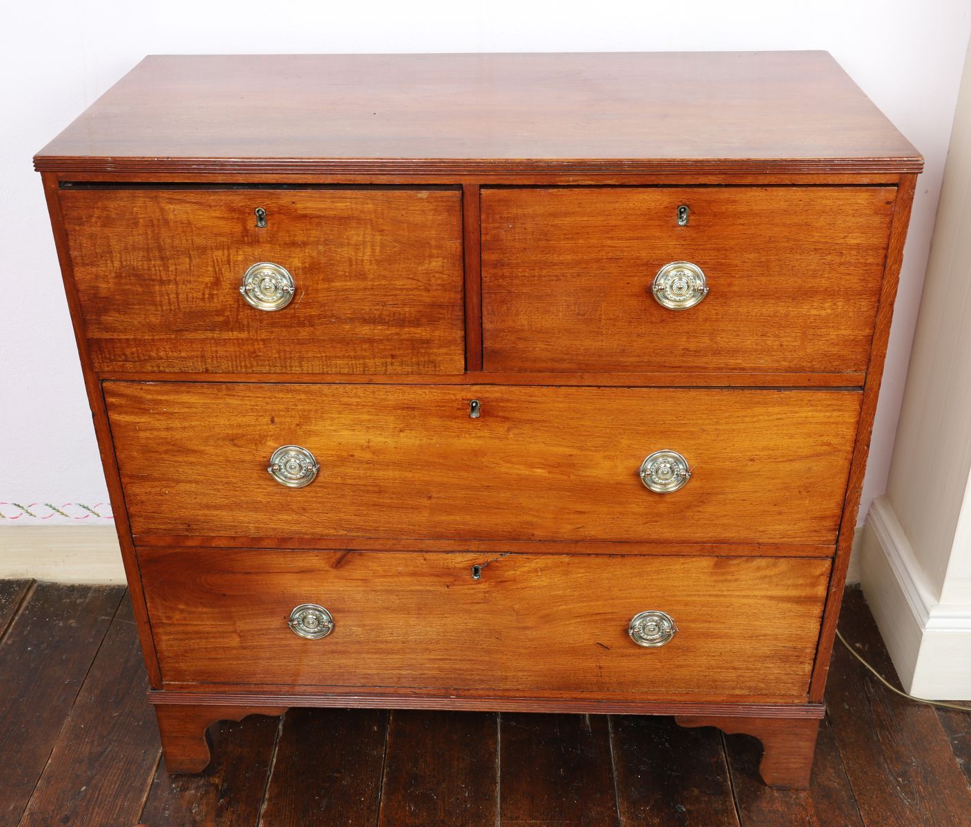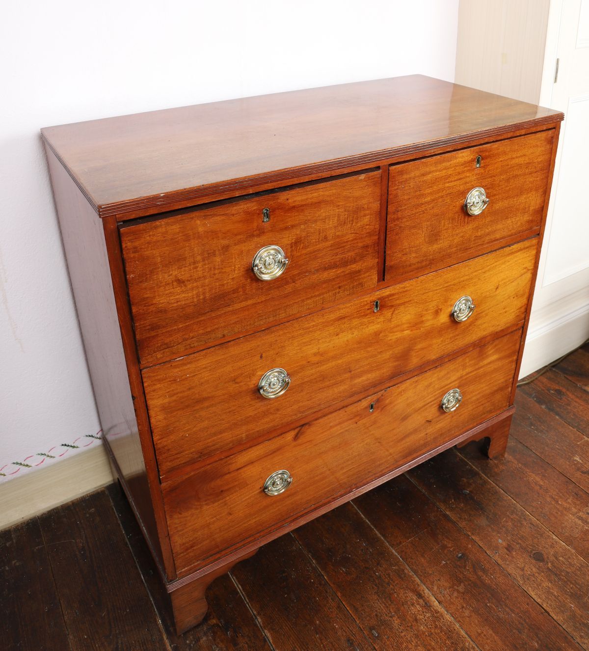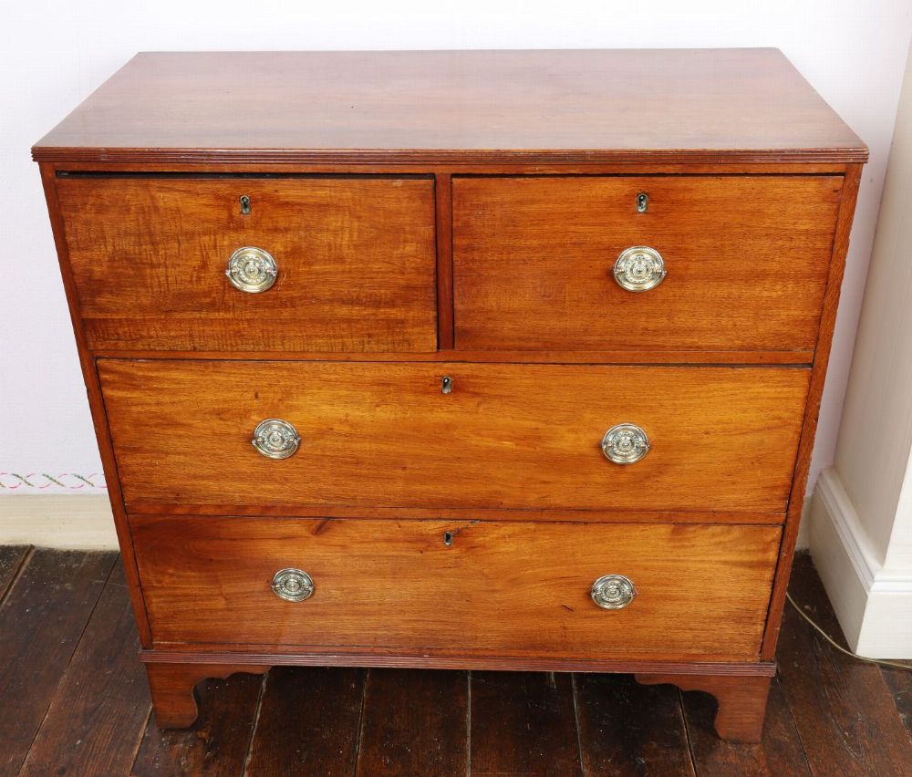 A Regency-period mahogany chest of drawers of two short and two long drawers, each with circular brass ring handles and escutcheons, raised on bracket feet.