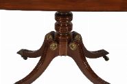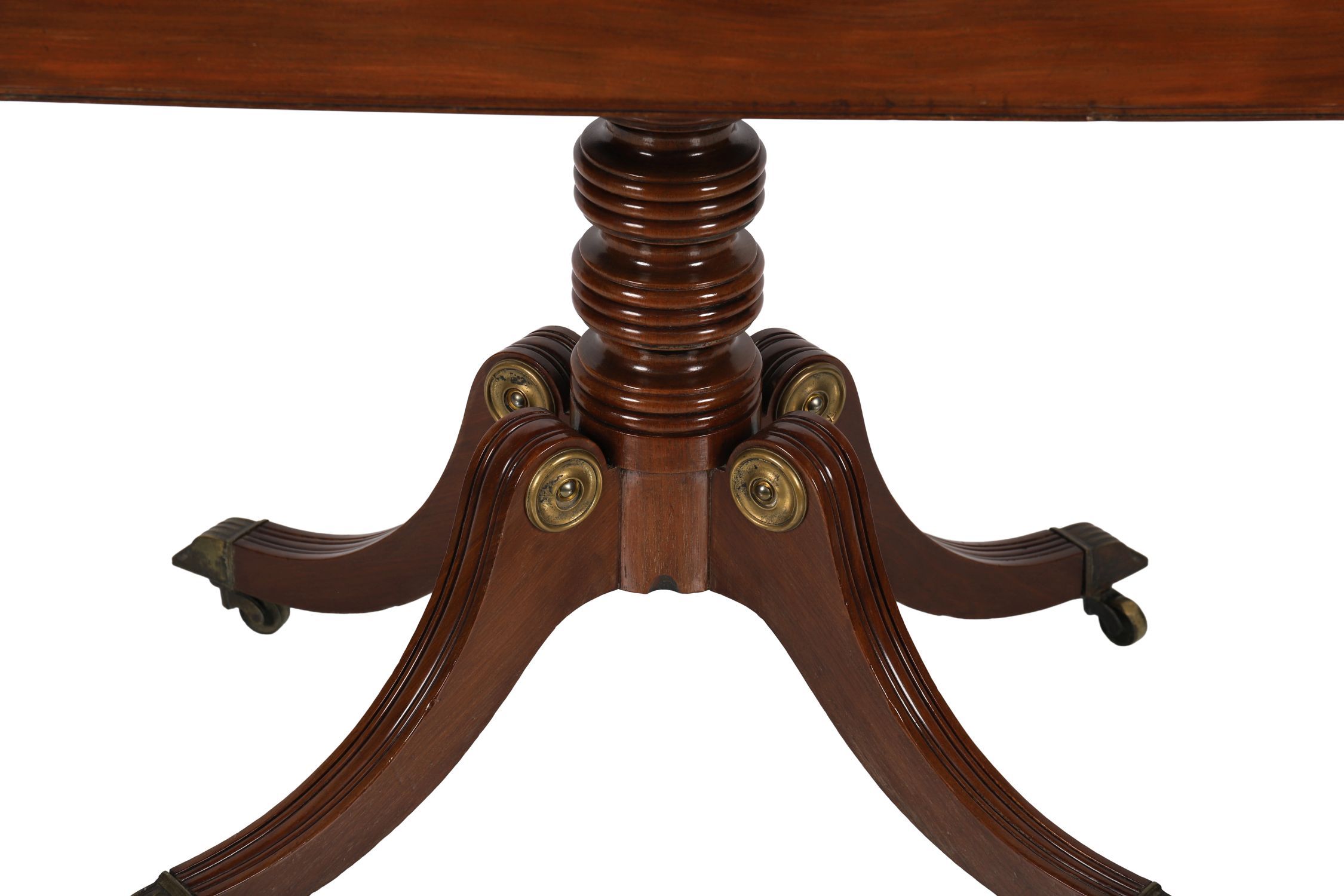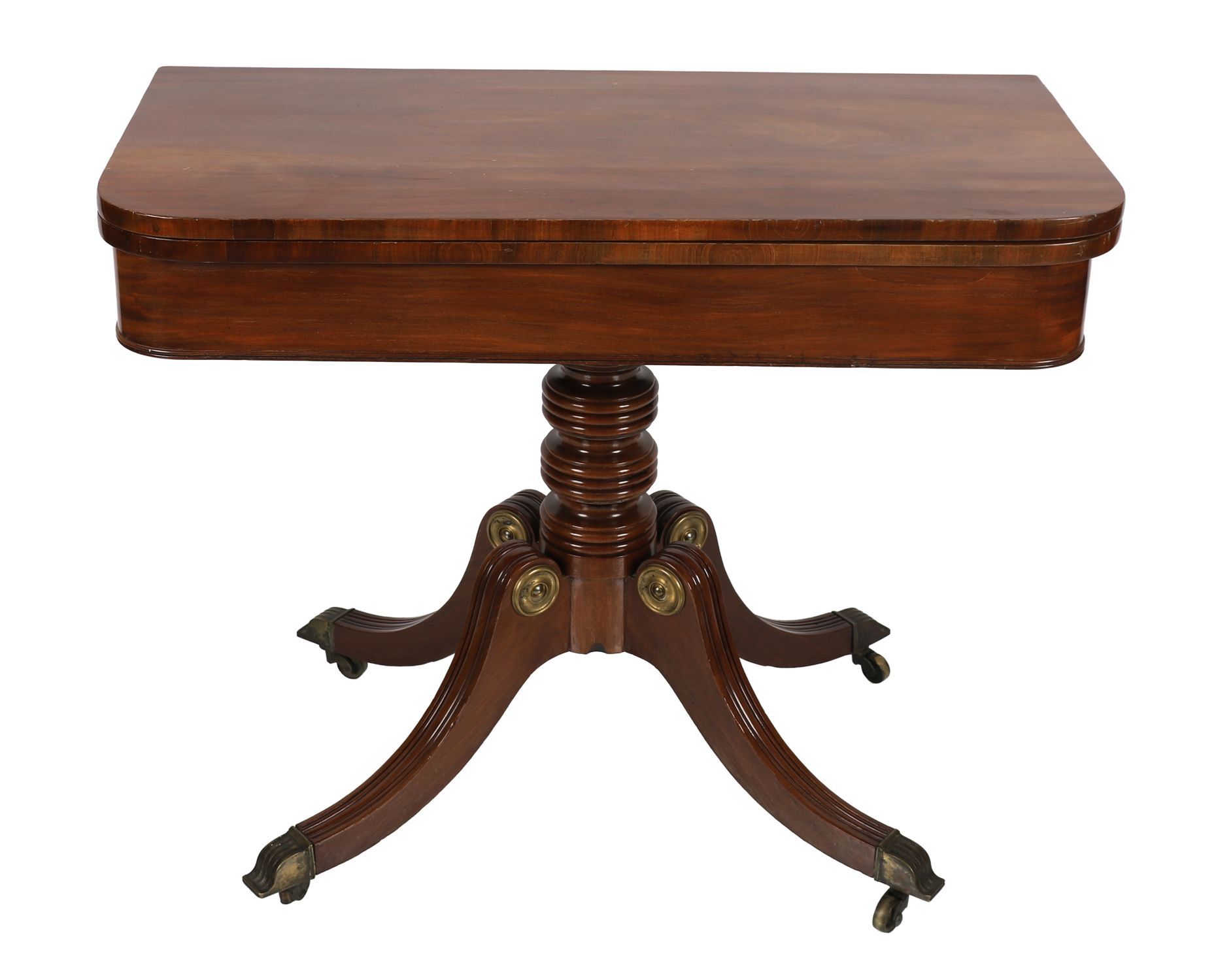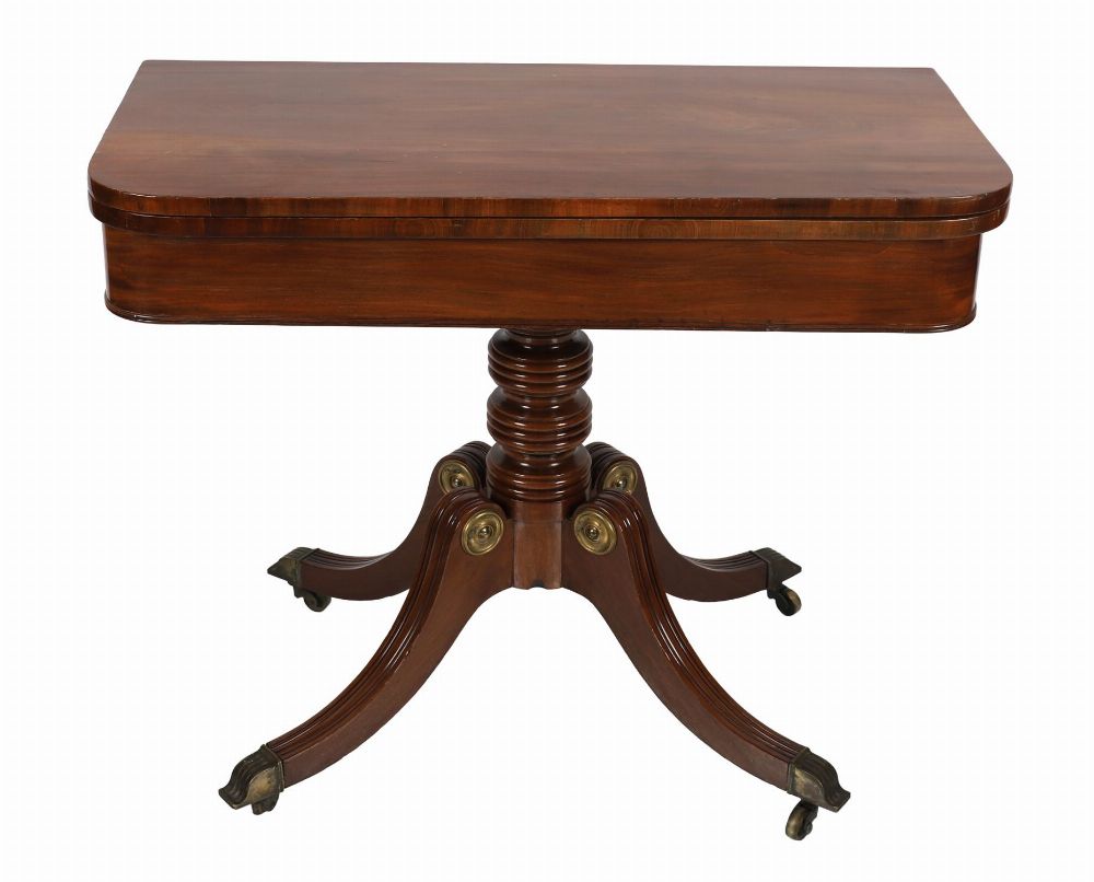 A fine Regency mahogany fold-over tea table, the rectangular top with rounded front corners opening to reveal a polished interior, above a conforming frieze. The whole is raised on a turned baluster stem and elegant sabre-legged quadra form pod, terminating in brass feet with original castors — a graceful and practical example of period design.