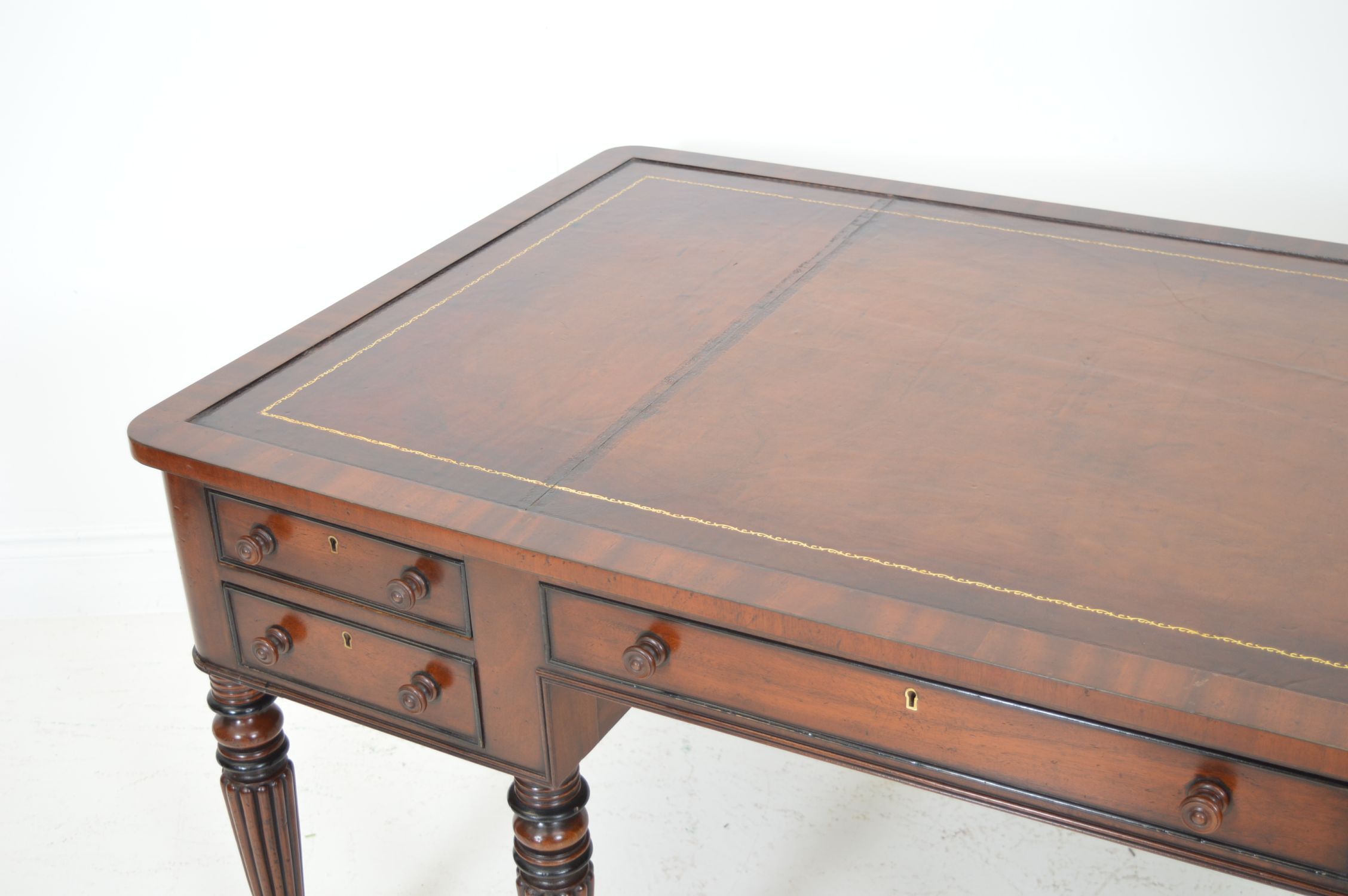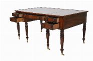 Rectangular desk with gilt-tooled leather writing surface, central kneehole, one long drawer, four short drawers to each pedestal, fitted with turned mahogany knobs, raised on six reeded legs with brass castors.