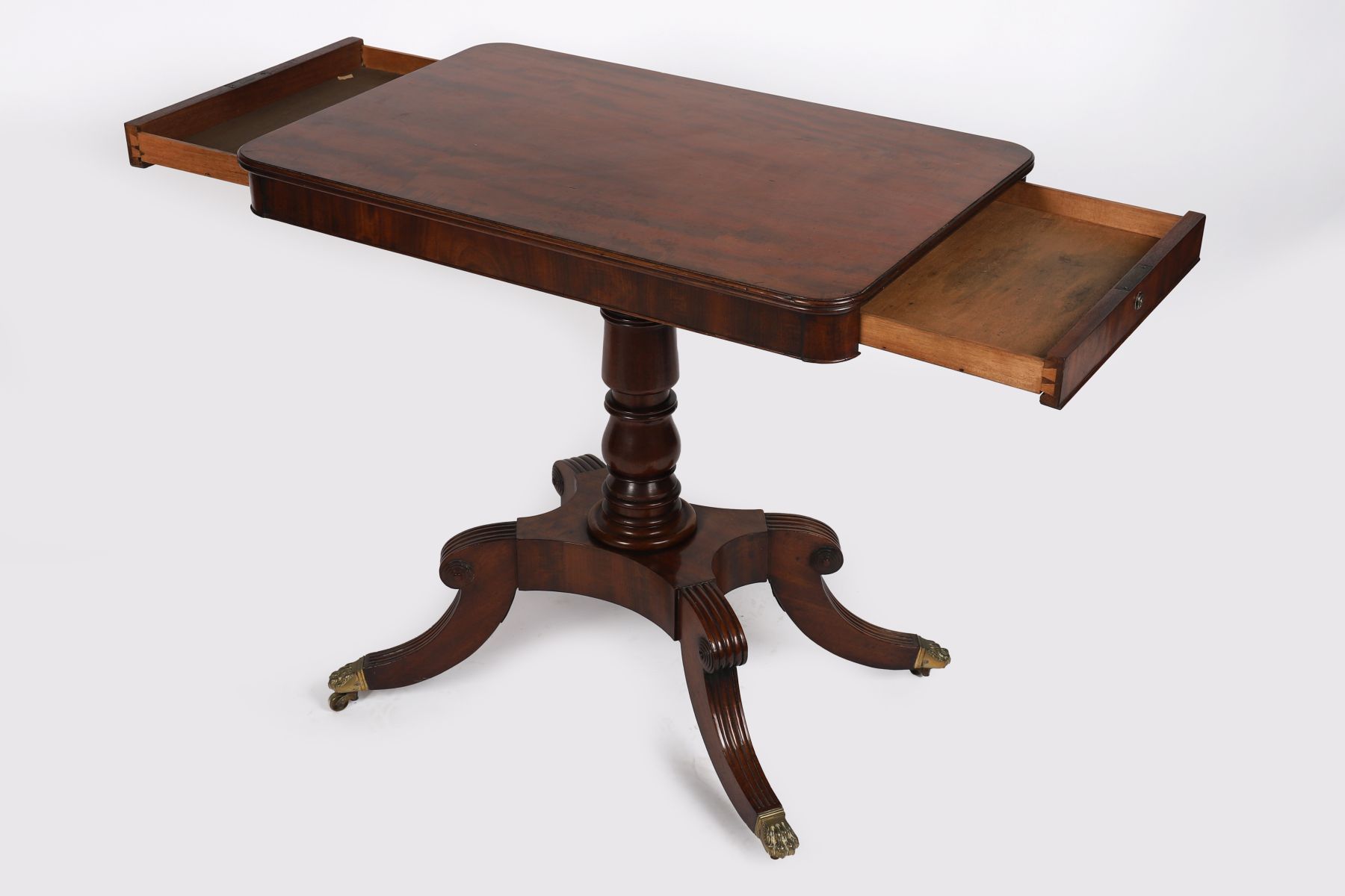 the rectangular reeded edged top with rounded corners above a drawer on either end, raised on a turned stem and sabre legged pod, terminating on brass claw feet and castors.