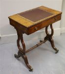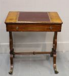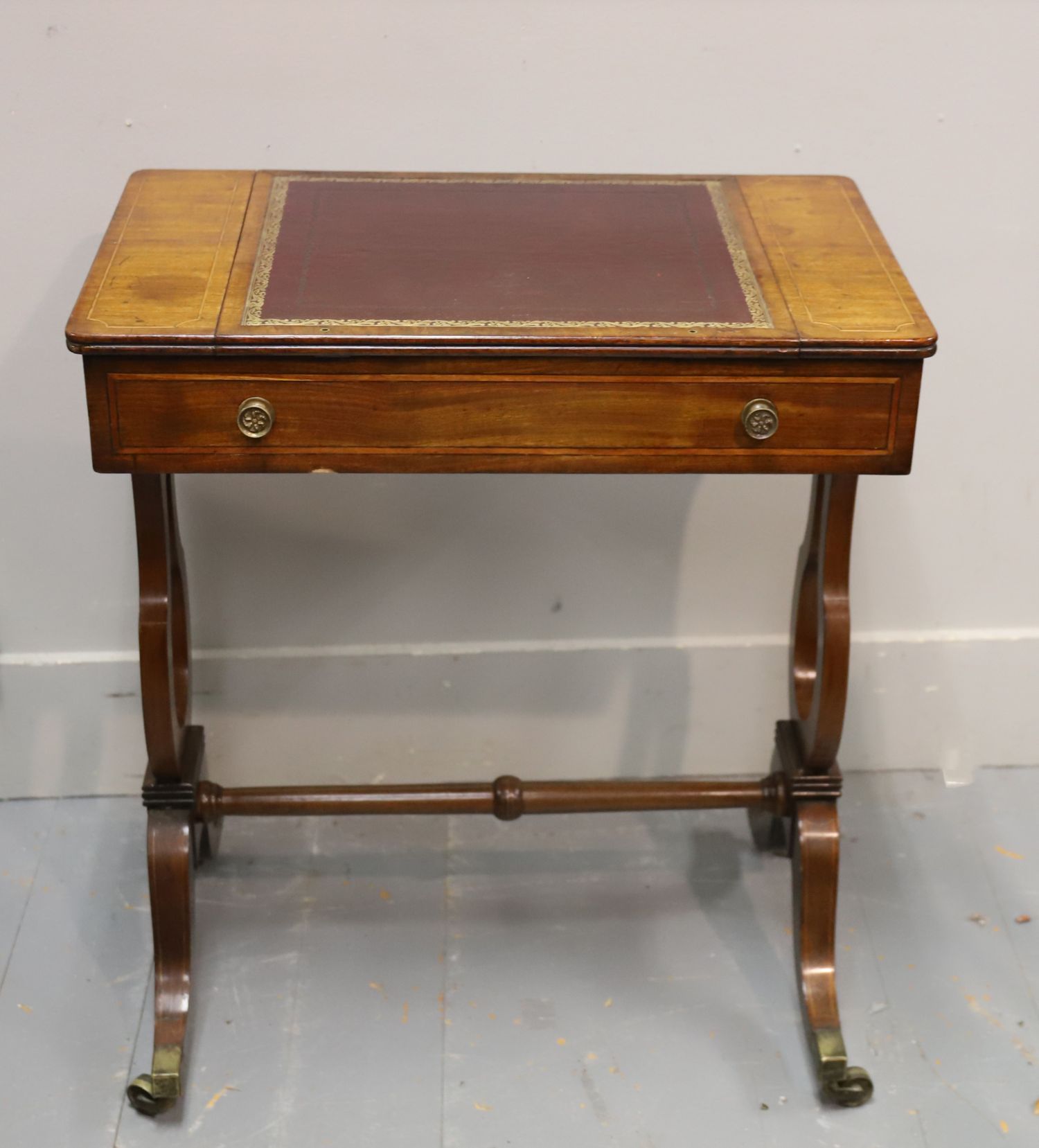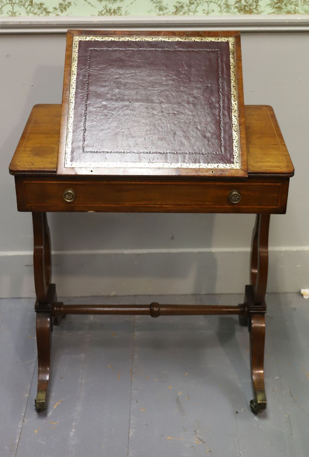 A Regency period mahogany library table, the rectangular top inset with a gilt-tooled burgundy leather writing surface, rising on an adjustable ratcheted support. Fitted with frieze drawers to each side with brass knob handles, the table is raised on elegant twin lyre-shaped end supports united by a turned stretcher, terminating in brass caps and castors.