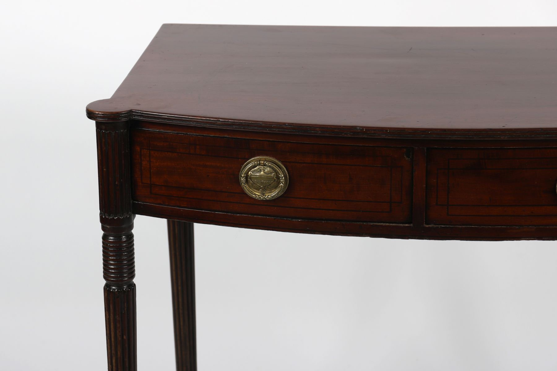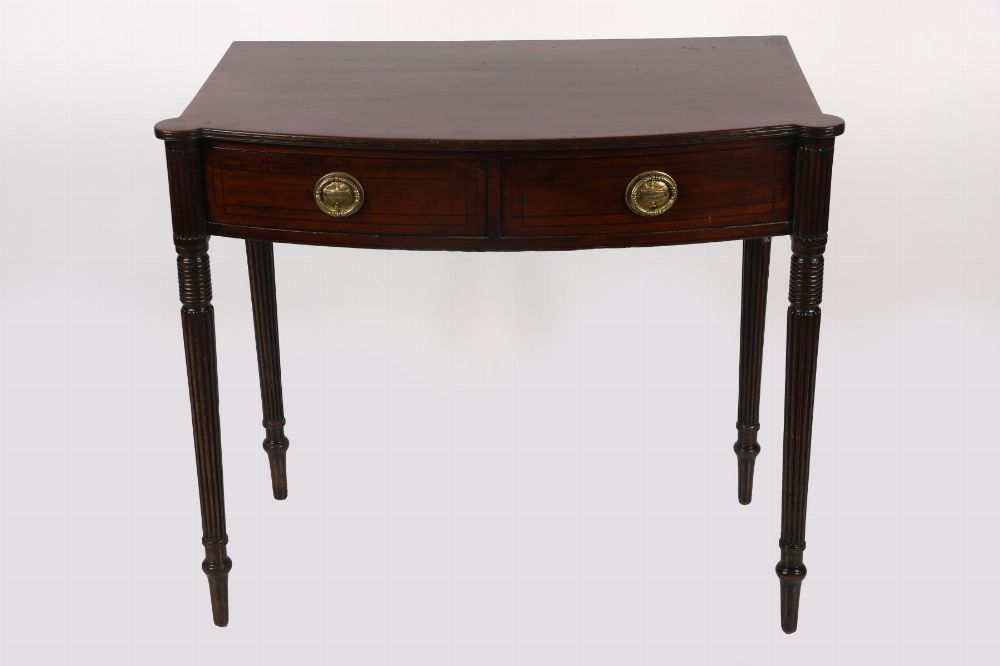 the bowfront-shaped top with projecting eared corners above 2 frieze drawers, furnished with urn embossed brass handles, raised on reeded turned legs.
