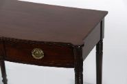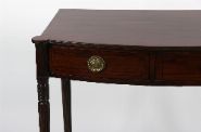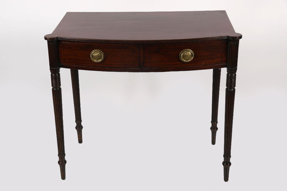 the bowfront-shaped top with projecting eared corners above 2 frieze drawers, furnished with urn embossed brass handles, raised on reeded turned legs.