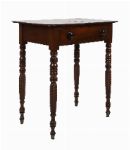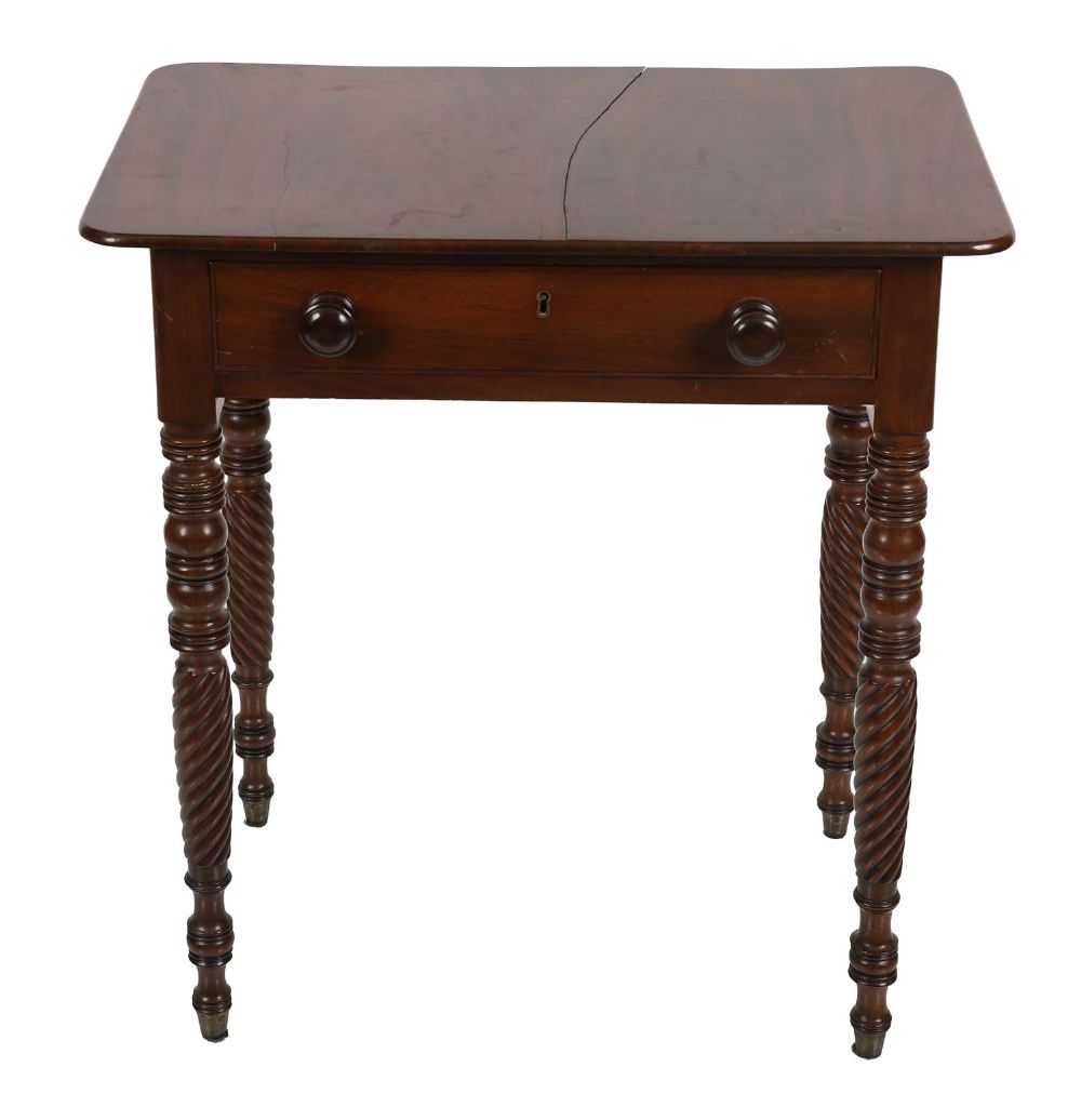 A Regency side table in figured mahogany with single frieze drawer, turned legs, and brass castors.