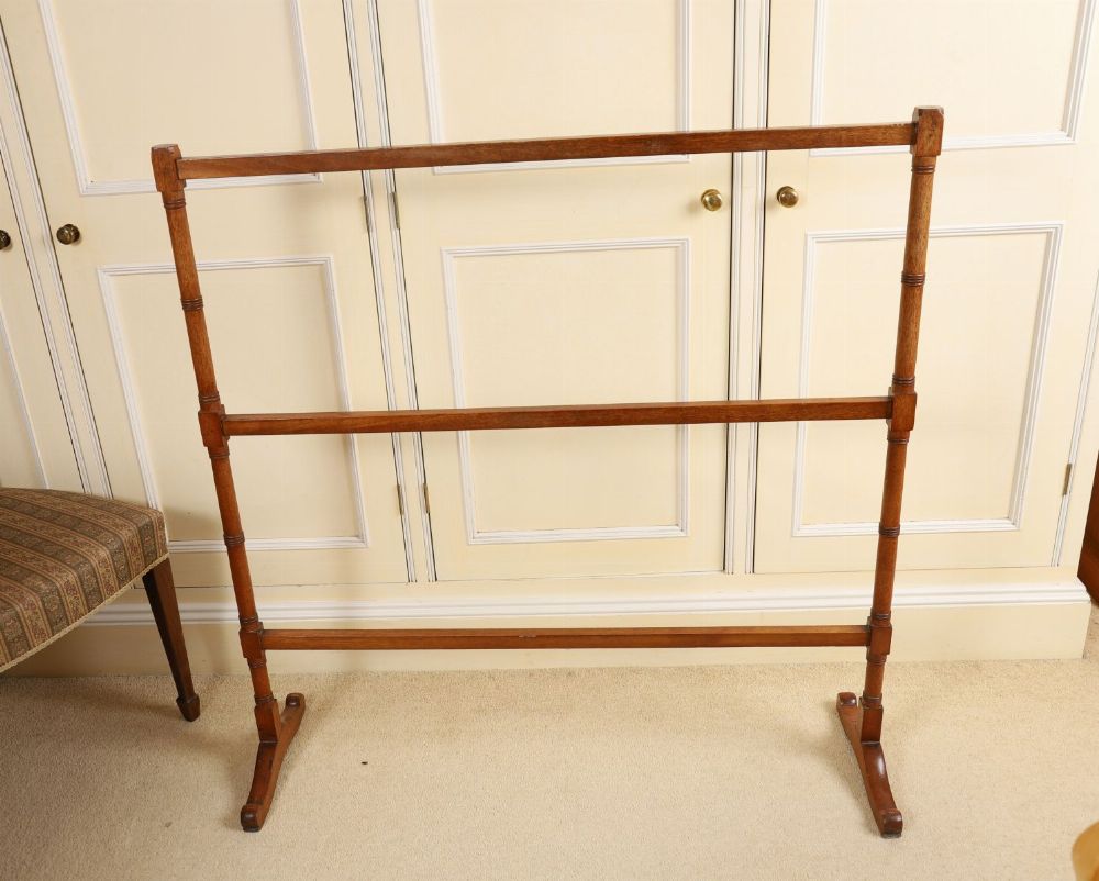 A Regency-period mahogany towel rail with turned uprights supporting twin rails, raised on shaped feet.