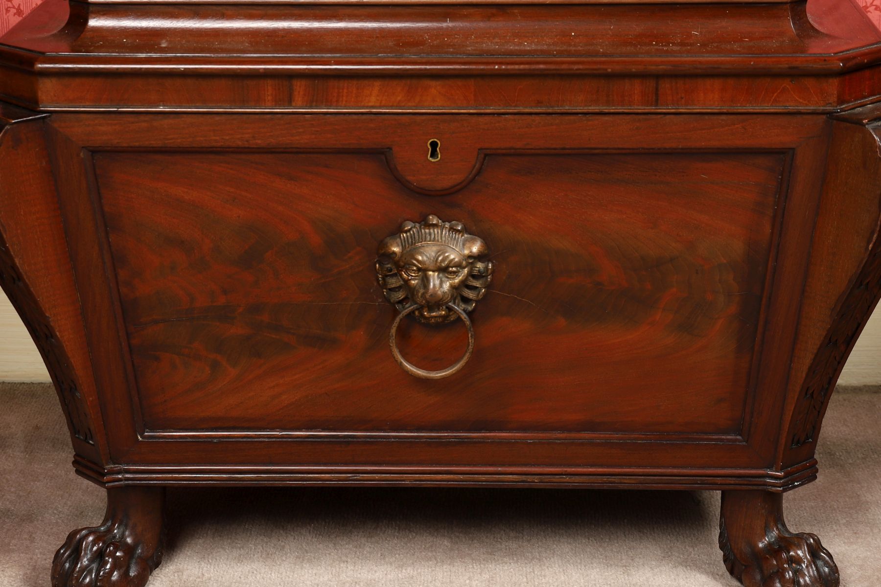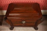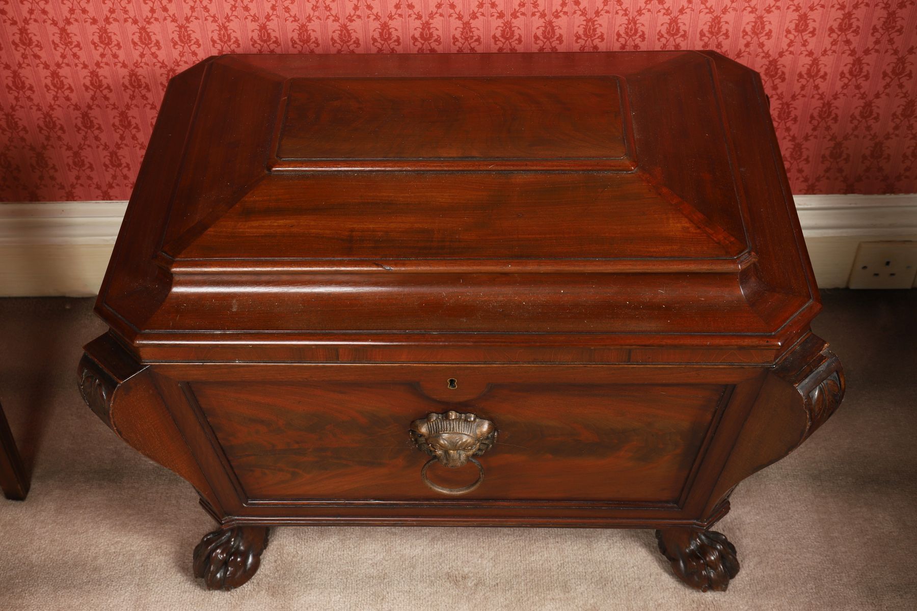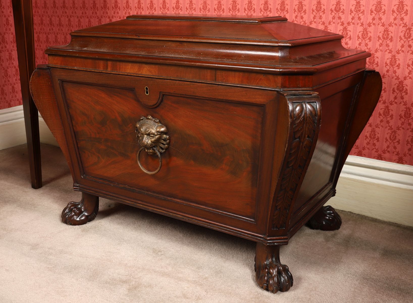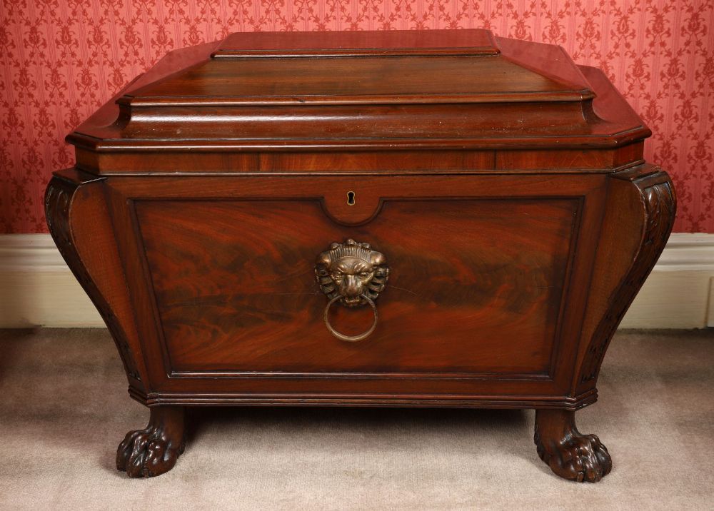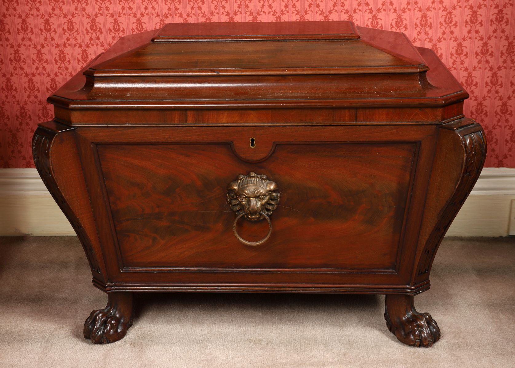 of sarcophagus form, the coffered lid opening to a storage interior, above a lion mask mounted, panelled, and scroll pillared body, raised on hairy paw feet.