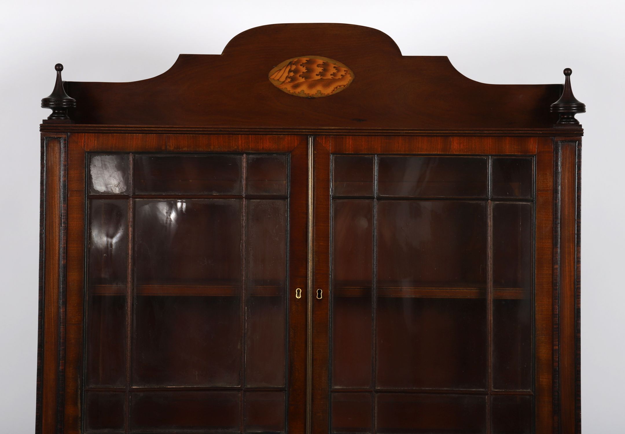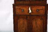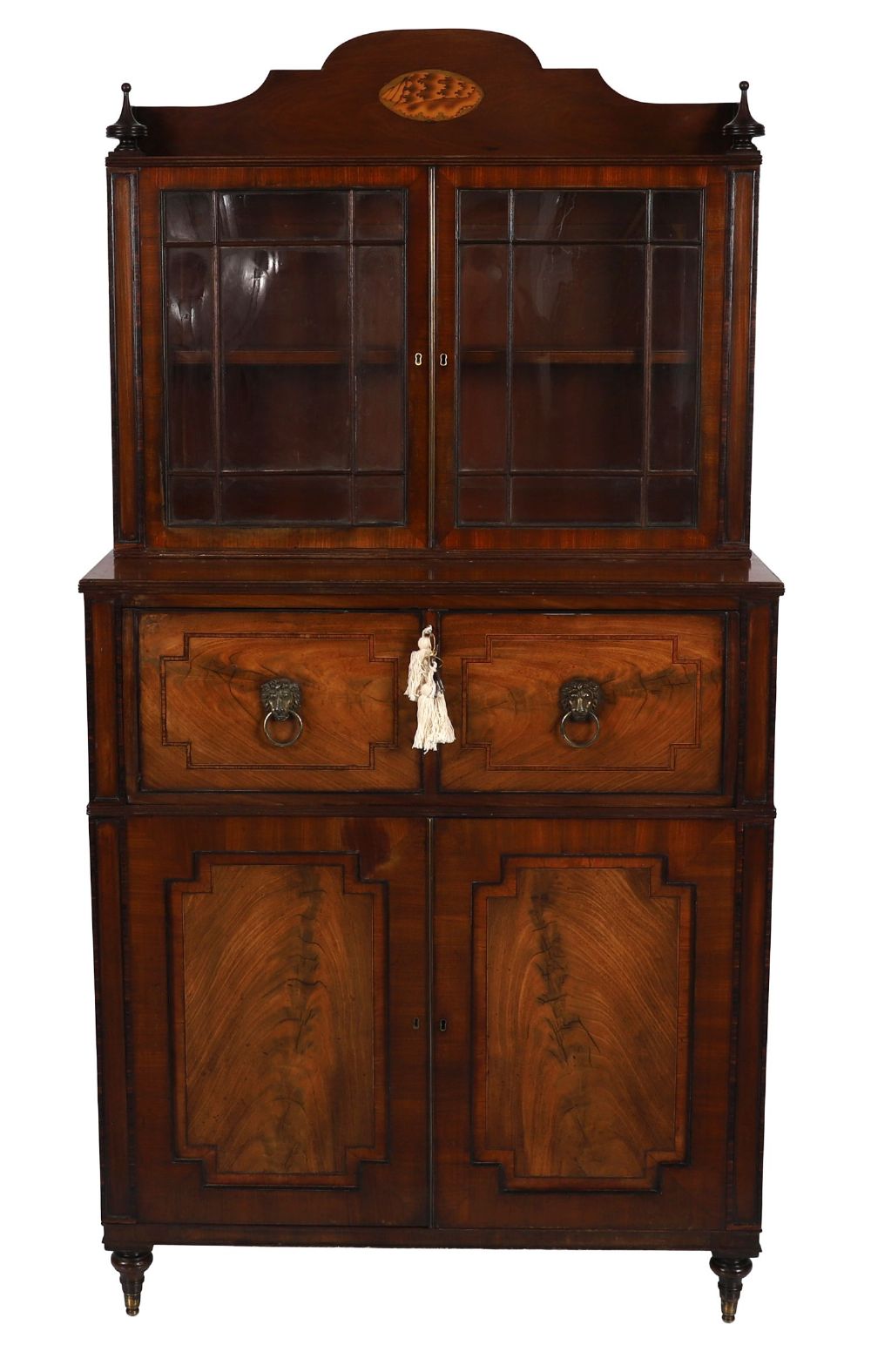 The upper section with twin astragal glazed doors enclosing adjustable shelves, above a fitted fall-front secretaire drawer with interior compartments, over lower cupboard doors, decorated throughout with boxwood inlay and panelled reserves.
