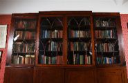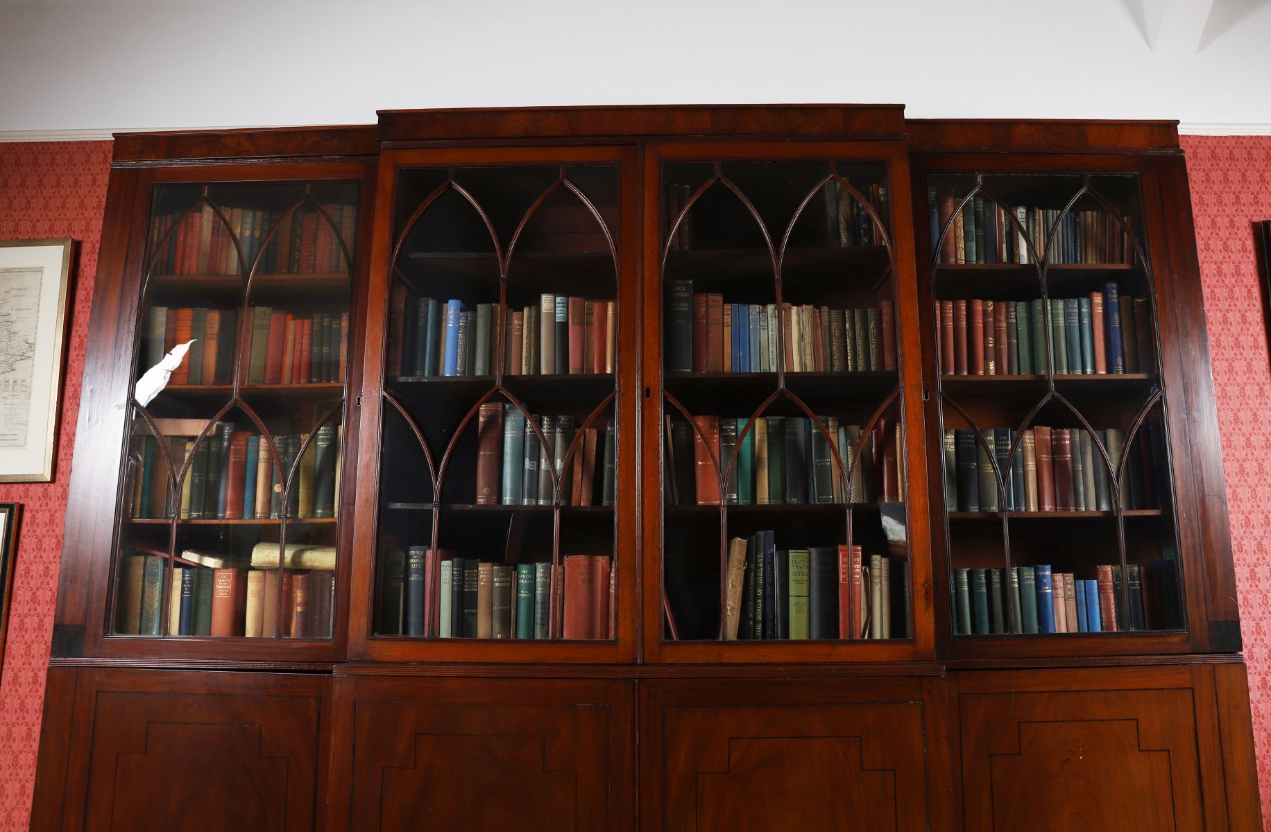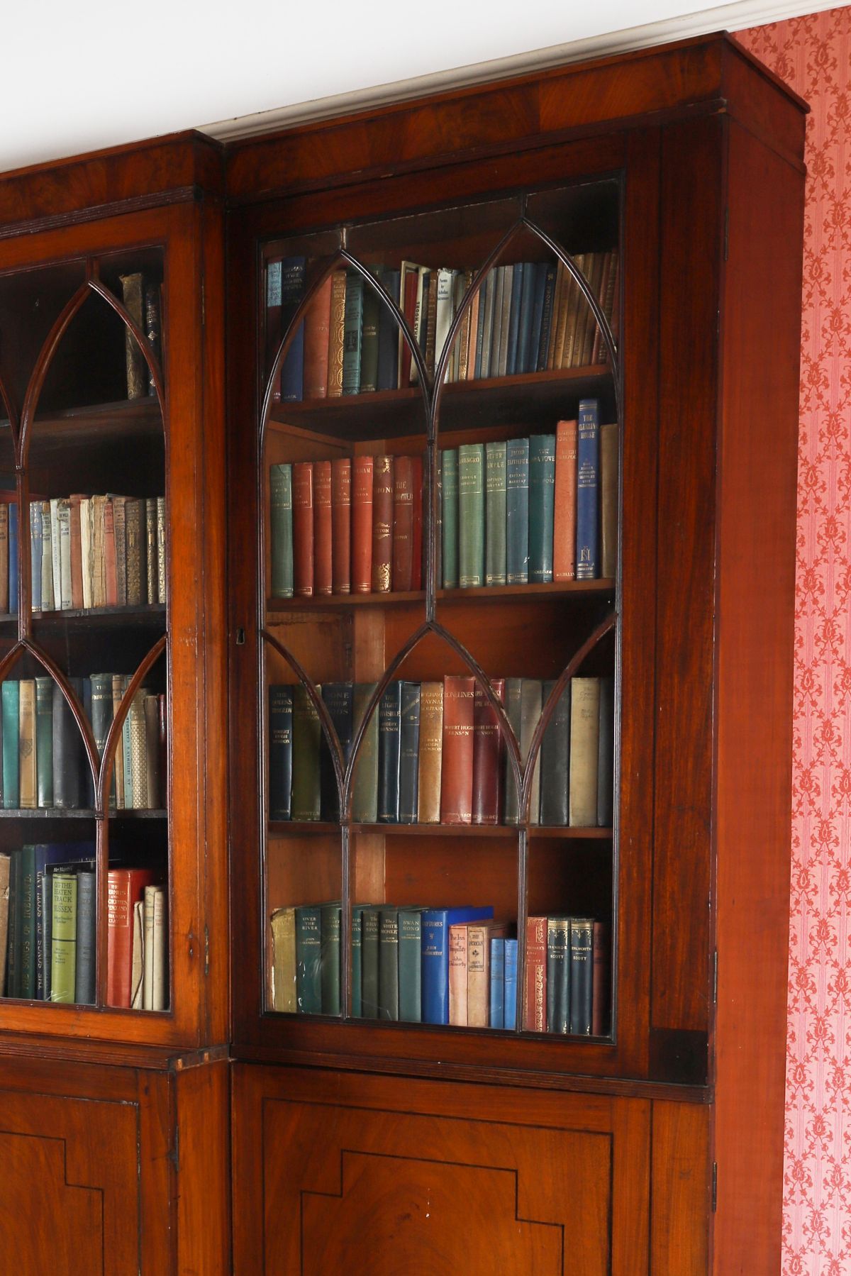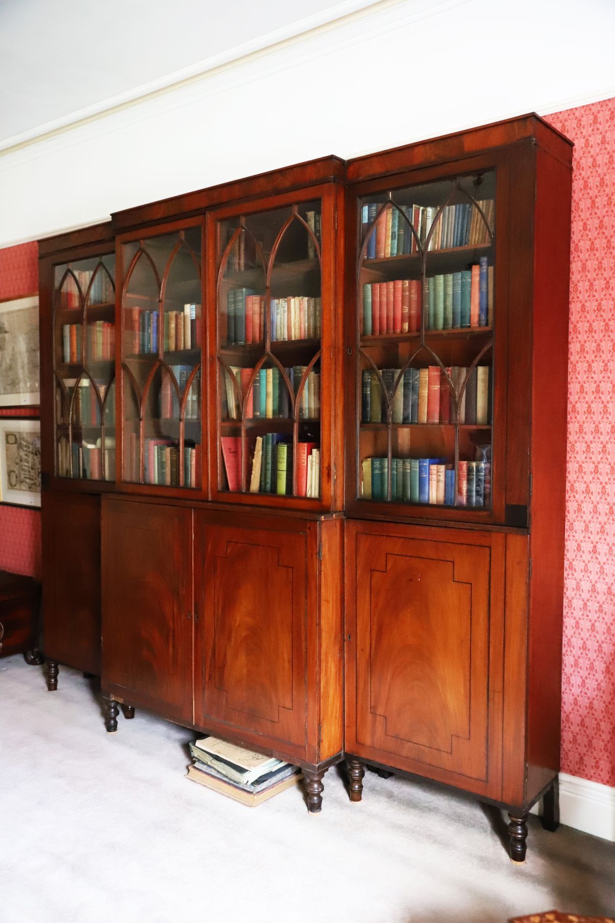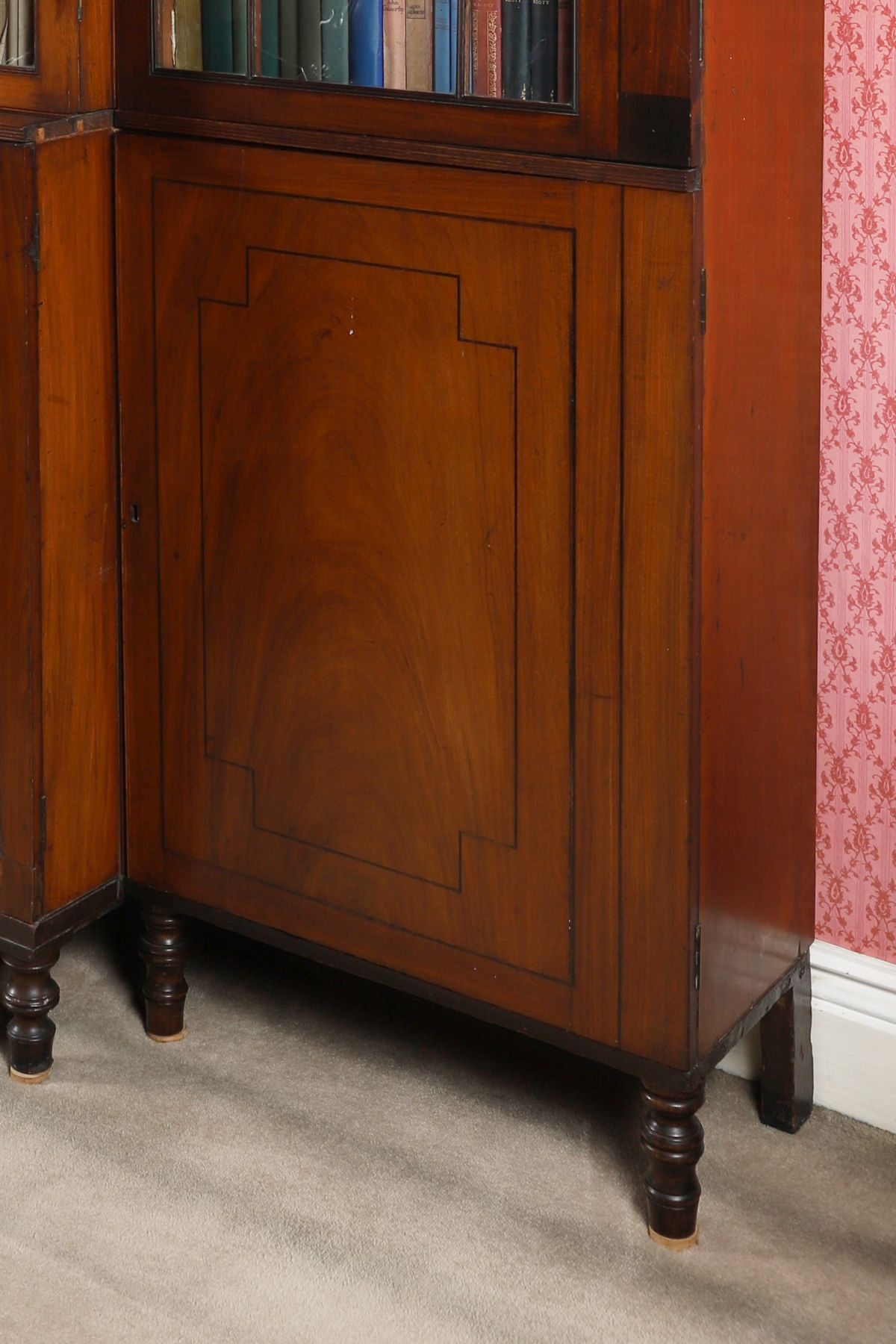 Regency-period mahogany breakfront bookcase, the upper section fitted with glazed doors enclosing adjustable shelving, above a lower section with panelled cupboard doors. Ebony line inlay throughout, raised on turned legs.