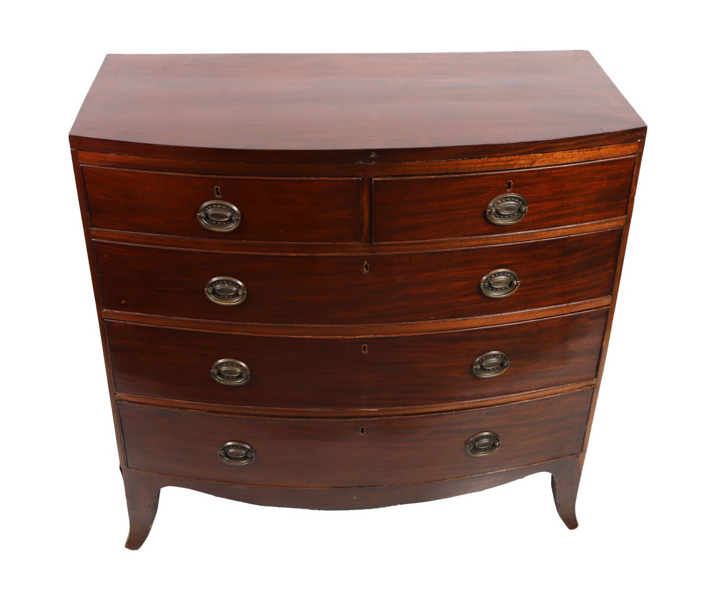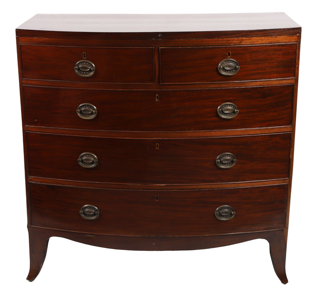 Comprising two short and three long drawers, furnished with oval brass handles and raised on outswept bracket feet.