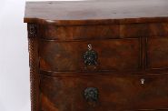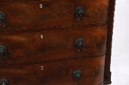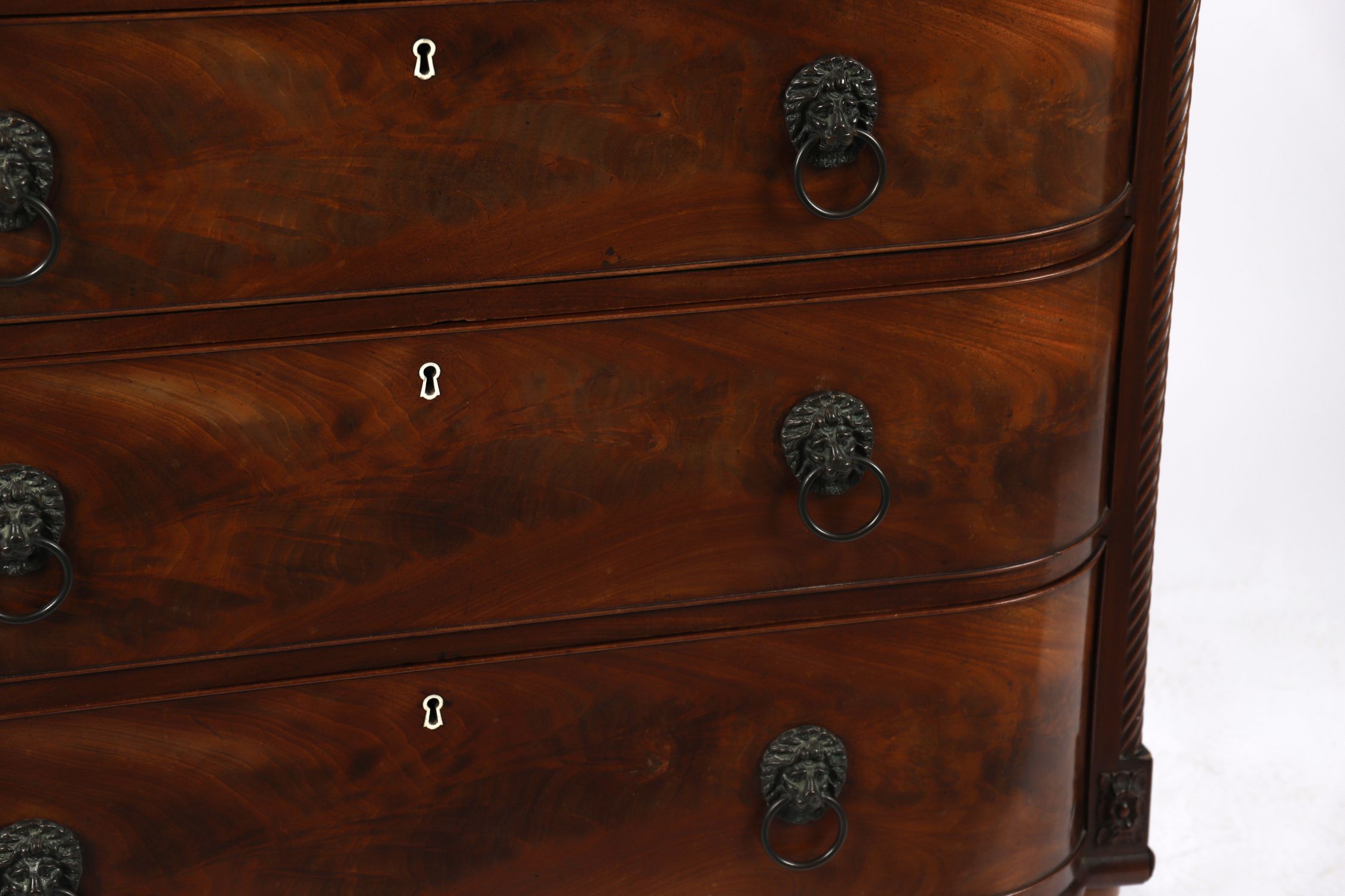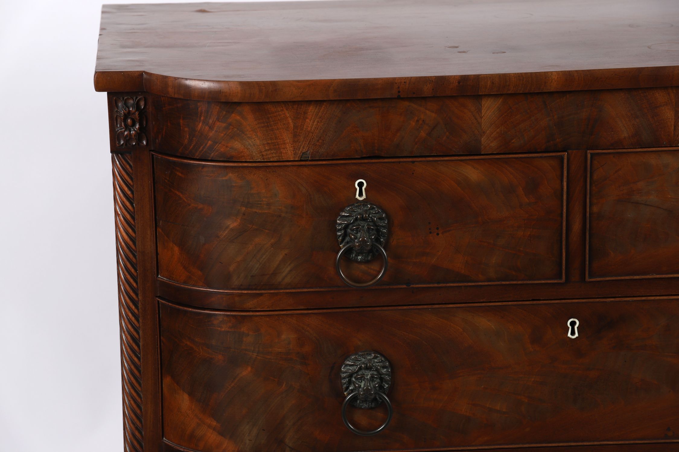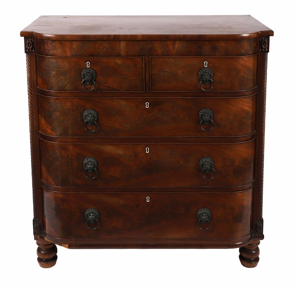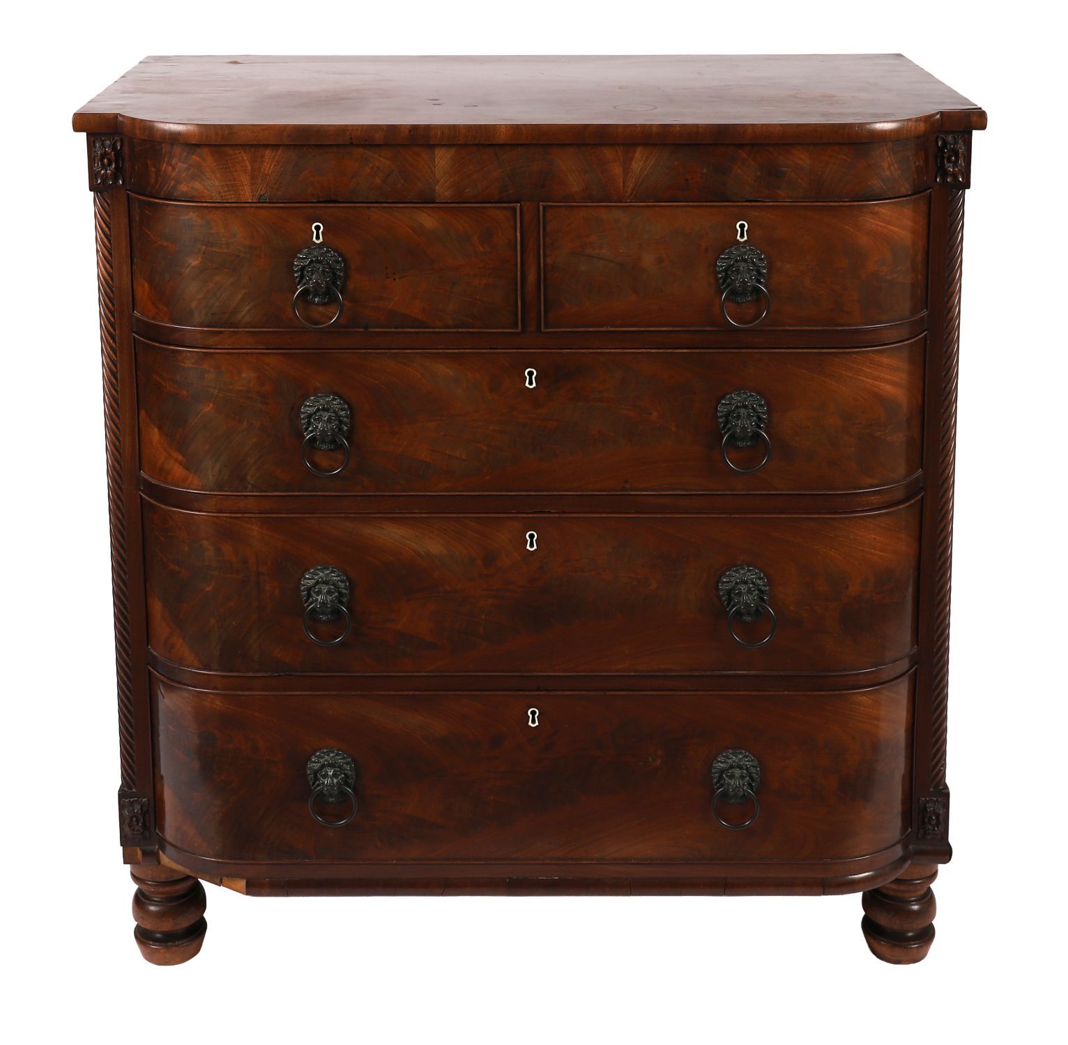 A Regency period mahogany chest of drawers of serpentine form, comprising two short over three long drawers, with lion mask ring handles and brass escutcheons, flanked by reeded stiles and raised on compressed bun feet — fine grained mahogany with rich patina throughout.