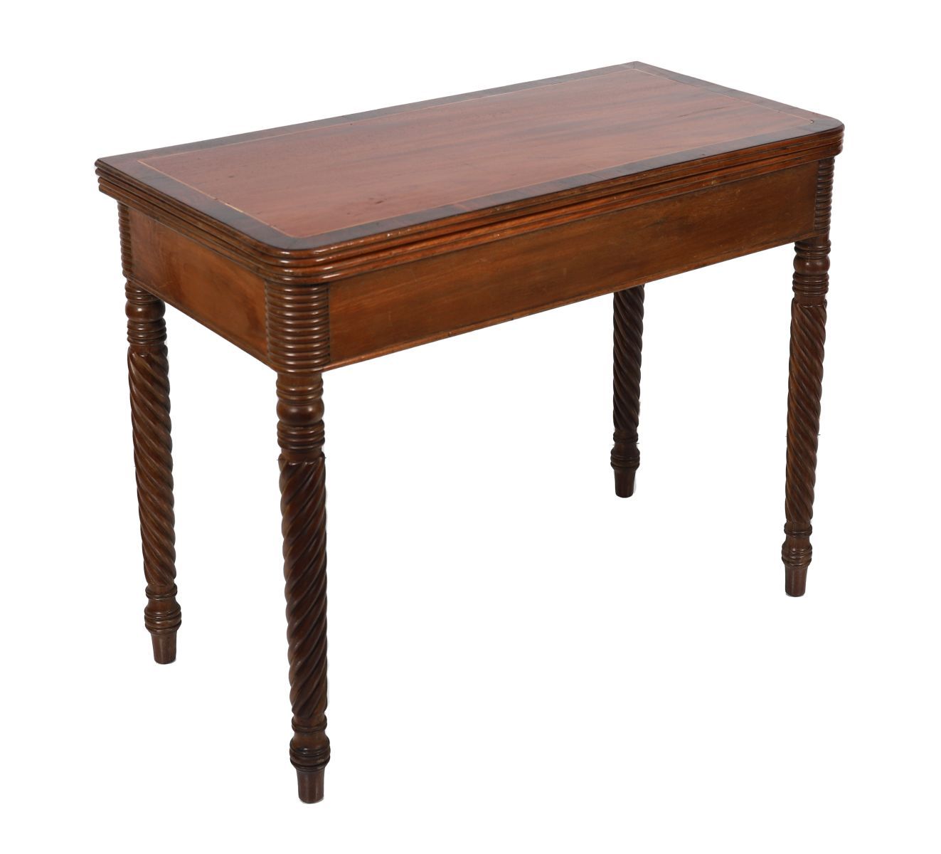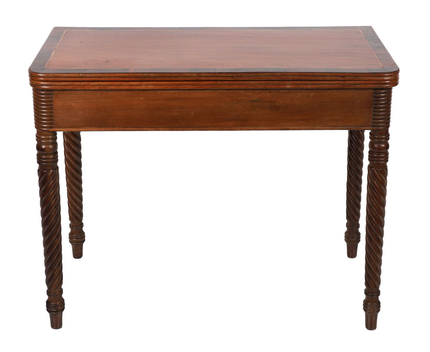 the rectangular crossbanded shaped top with rounded corners to the fore opening to a polished interior above a conforming frieze, raised on opposing spiral turned legs.