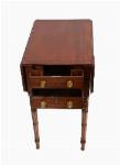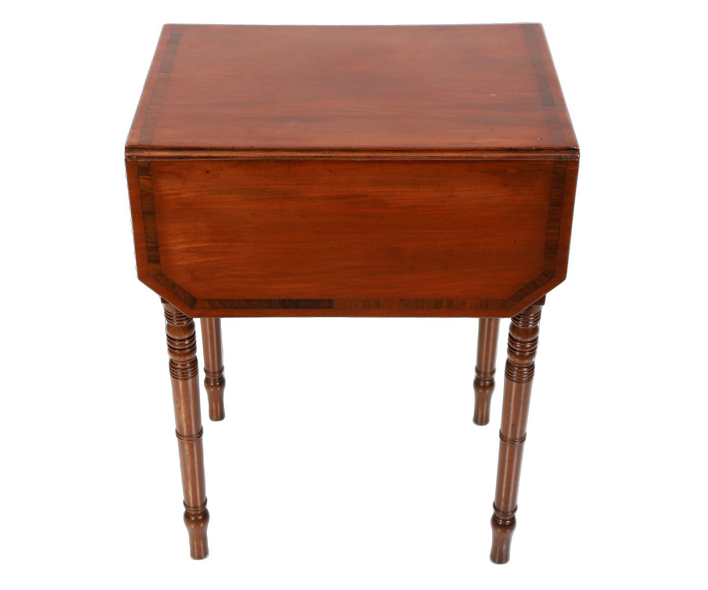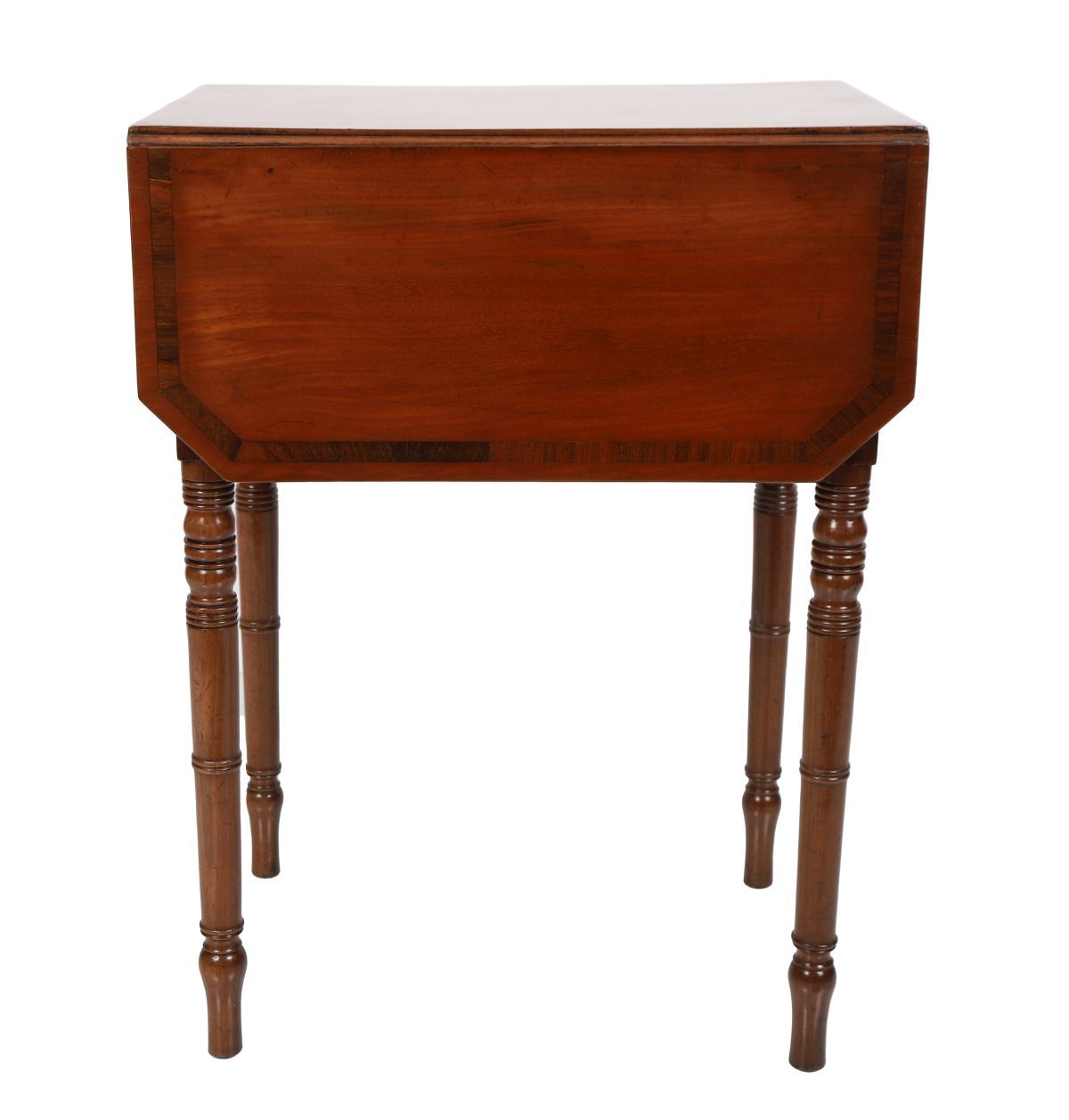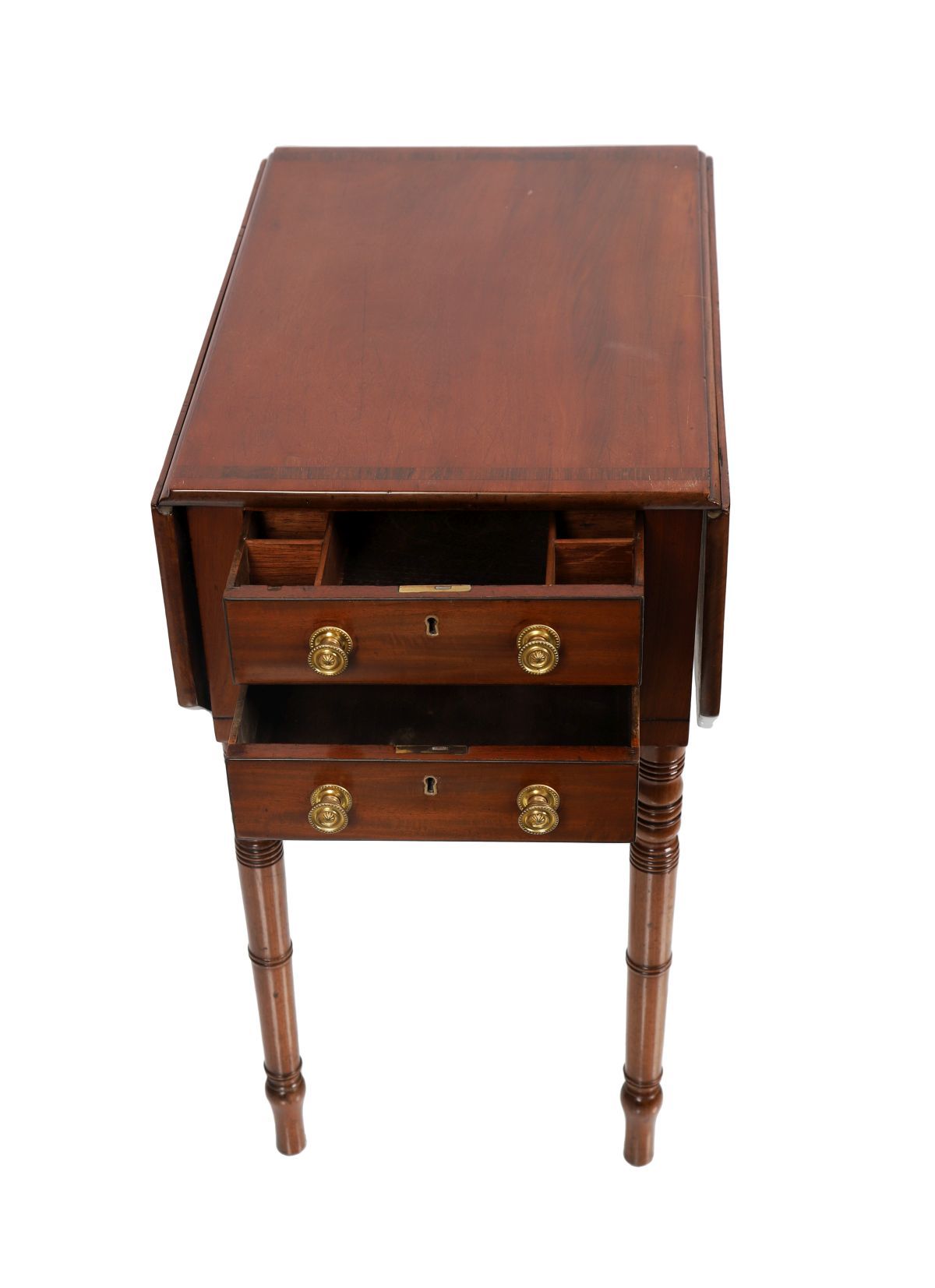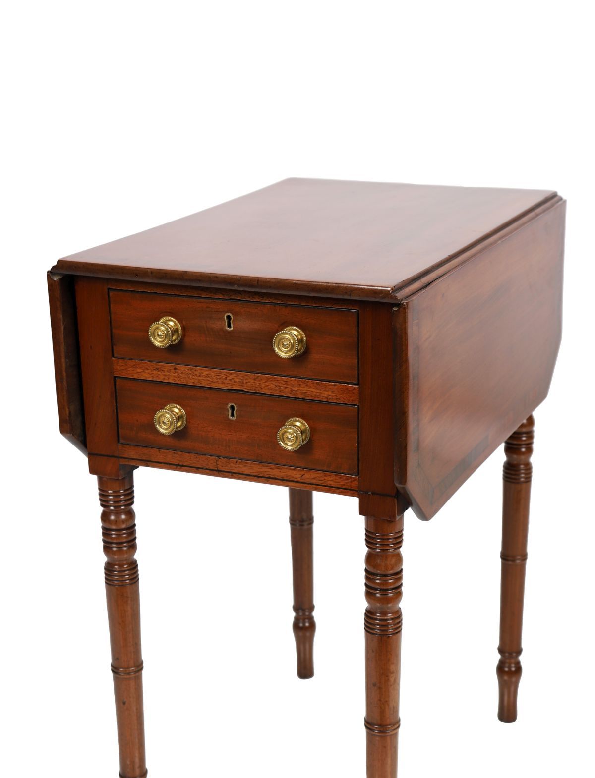 The rectangular crossbanded top, with chamfered drop leaves, sits above two real and opposing faux drawers furnished with brass knobs, all raised on turned legs.
