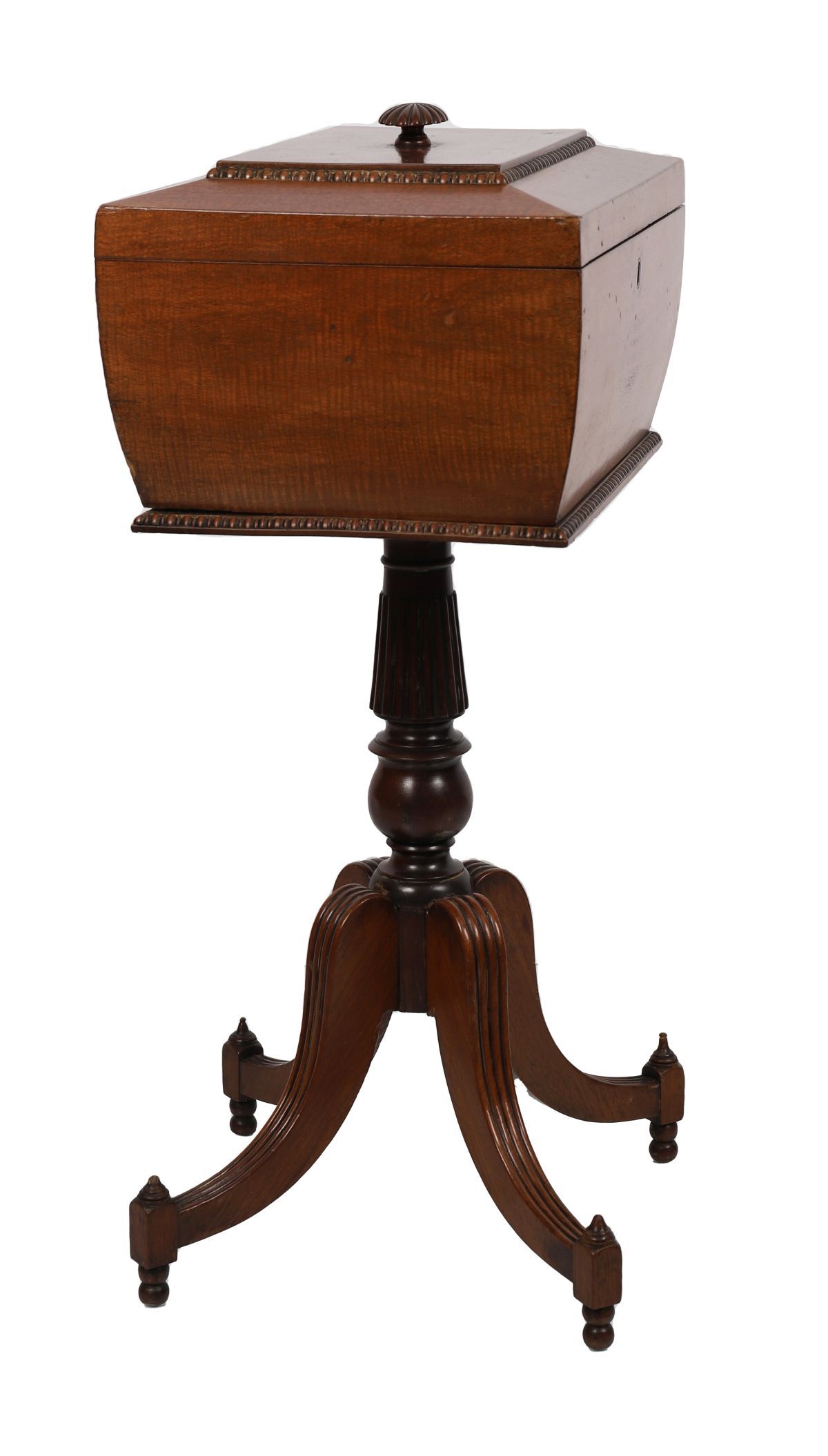 A Regency period mahogany teapoy of sarcophagus form, the hinged lid enclosing a fitted interior, raised on a turned pedestal and quadripartite base with reeded sabre legs.