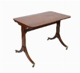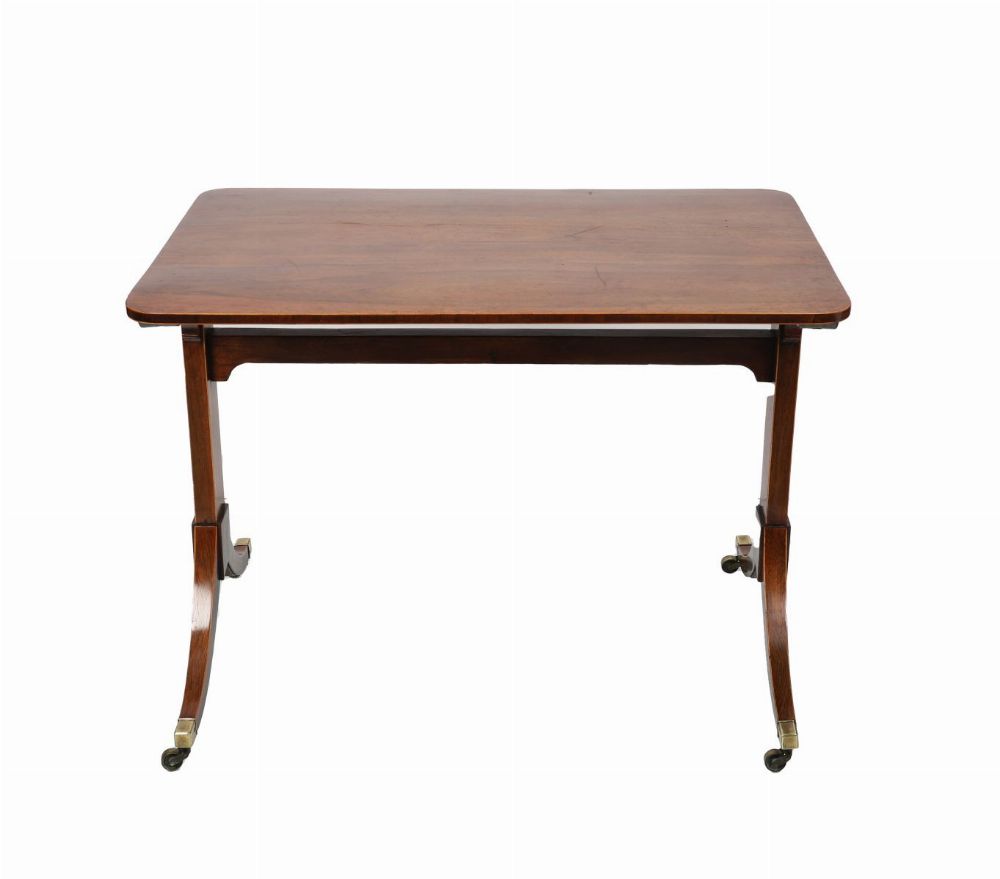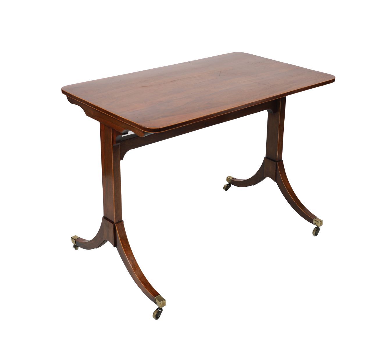 A Regency rosewood library table, the rectangular top with boxwood stringing and frieze drawers to either side, raised on tapering legs with brass caps and castors.