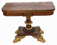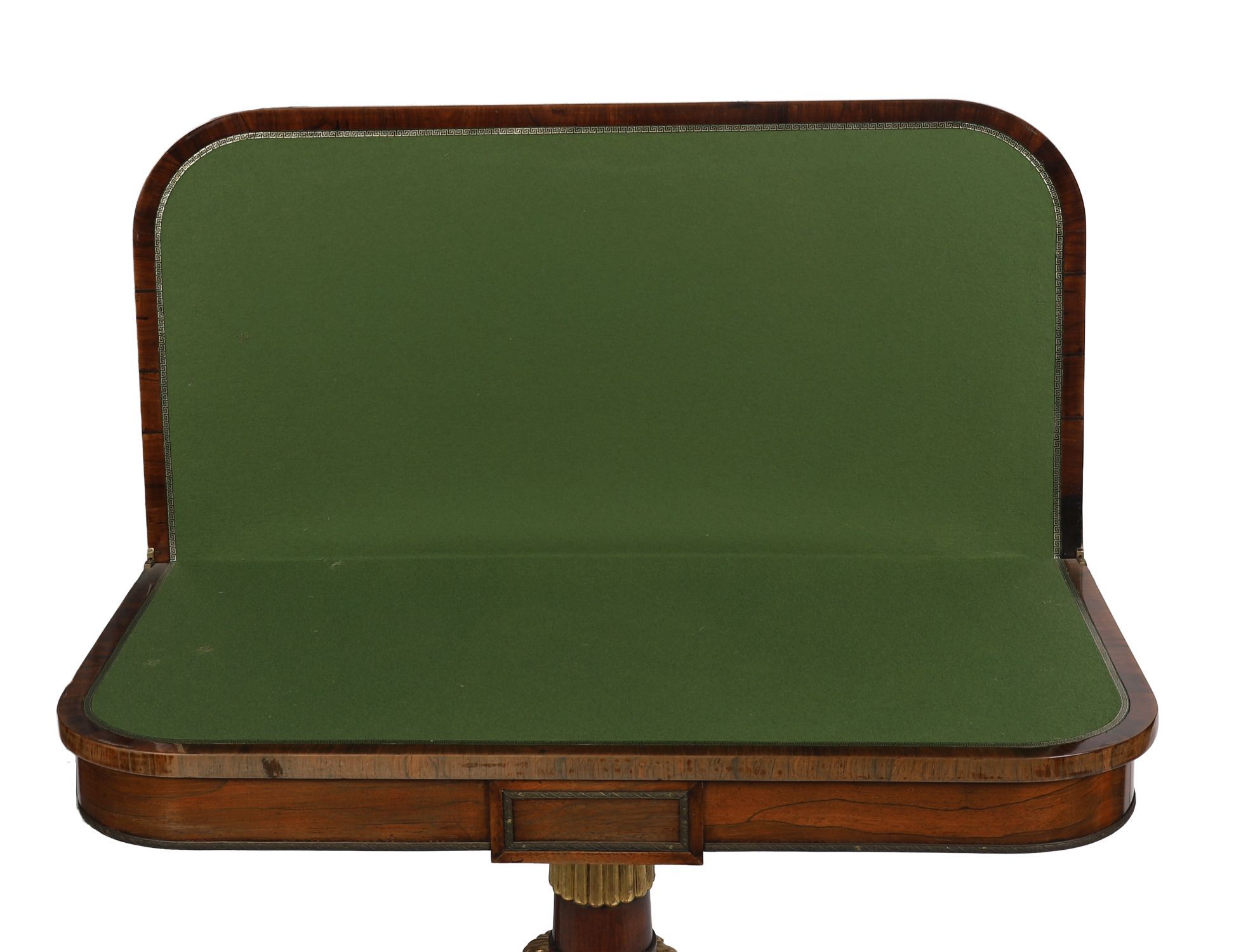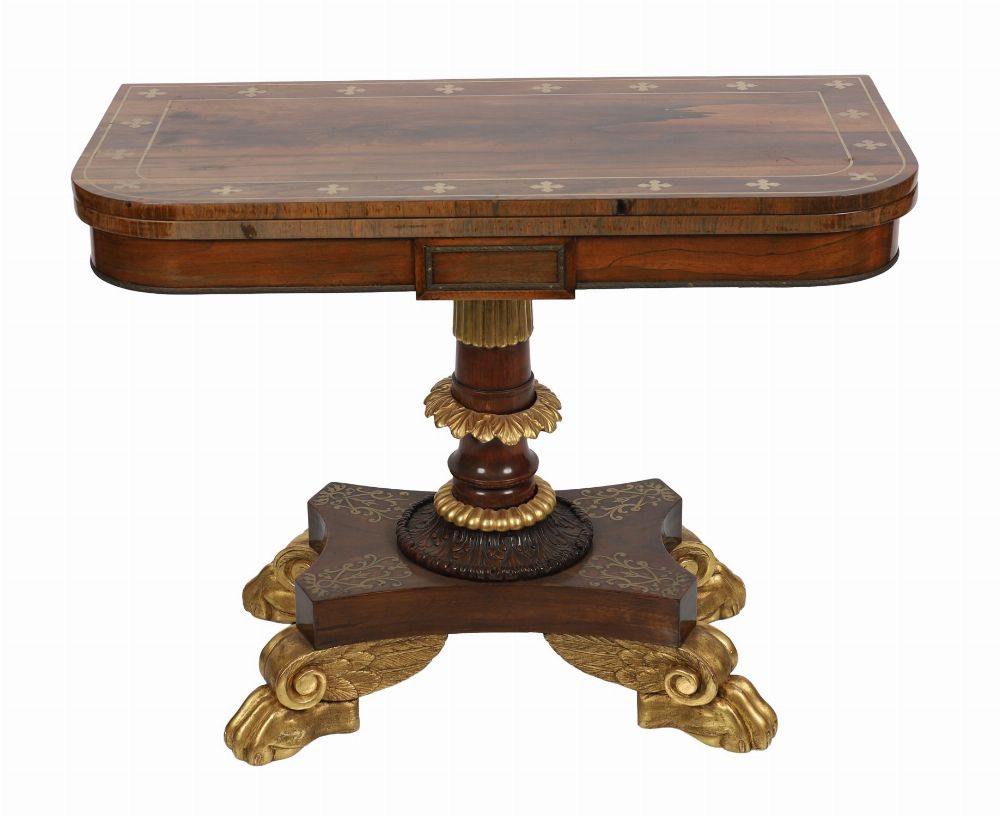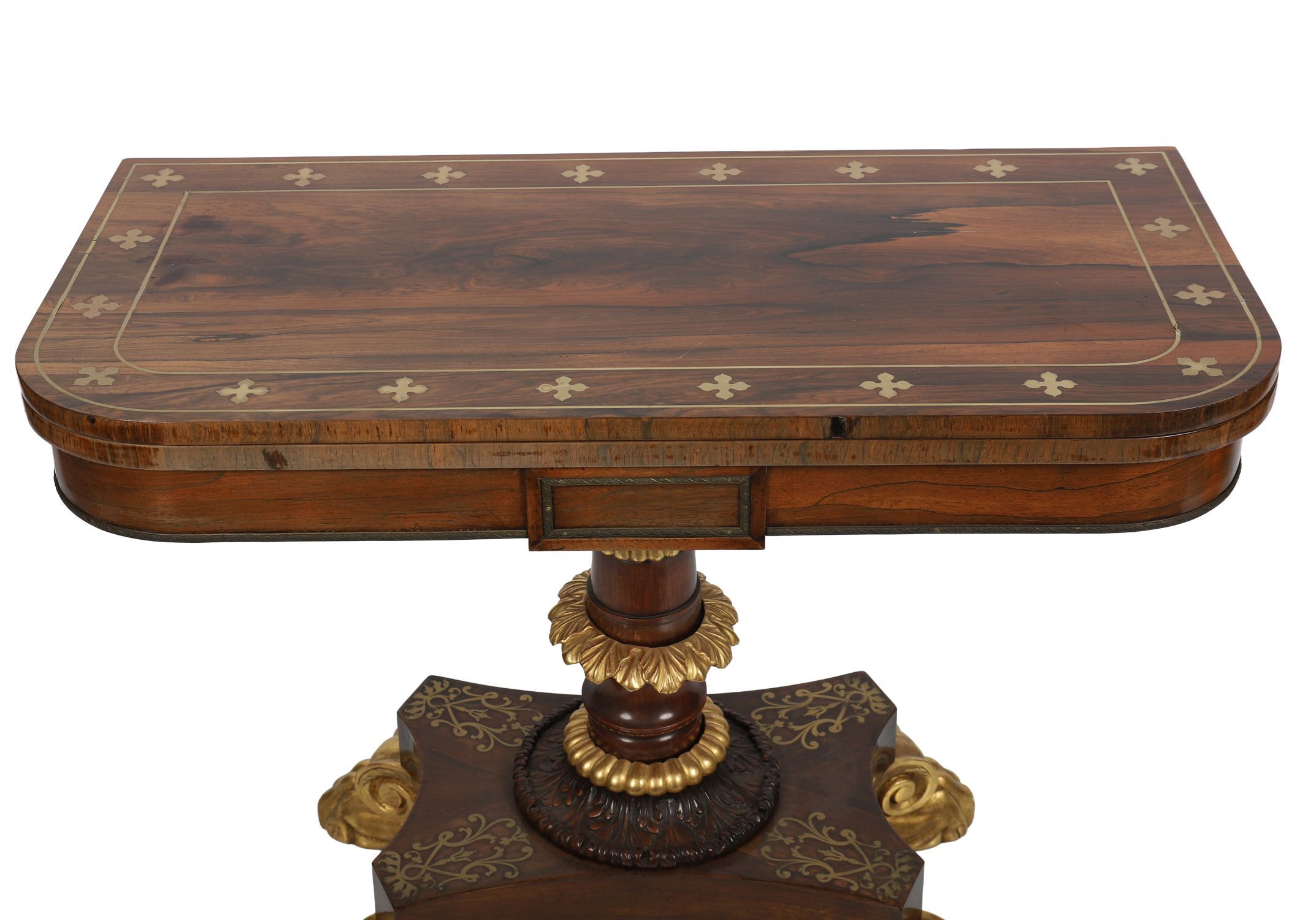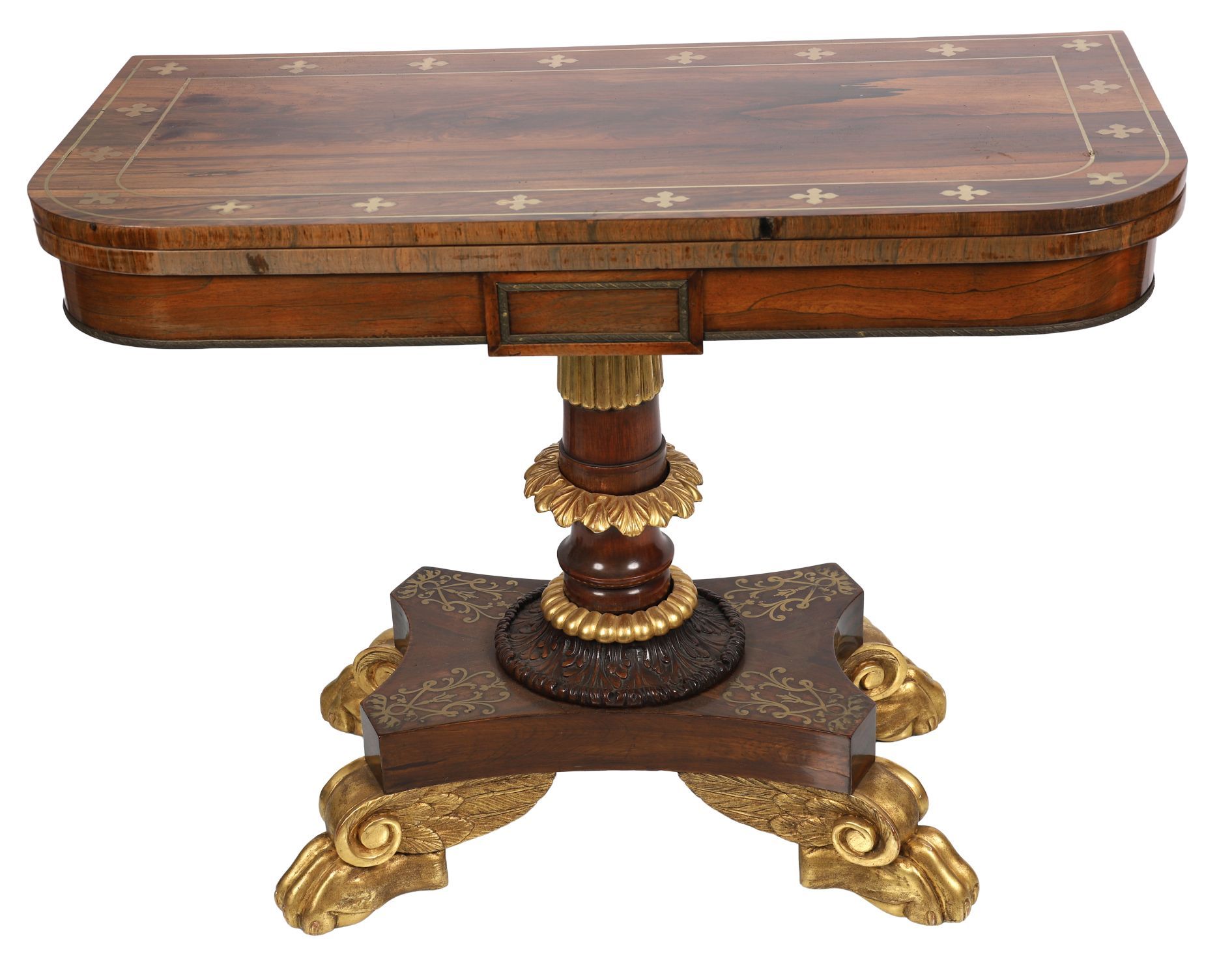 A striking Regency period fold-over games table in richly figured rosewood, the top with brass stringing and decorative brass panels to the corners, opening to reveal a baize-lined playing surface. The base with parcel-gilt carved pedestal on quadriform supports, each with bold gilded paw feet and scrolling decoration. A superb example of Regency taste, combining exotic veneers with gilt ornament and fine craftsmanship.