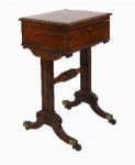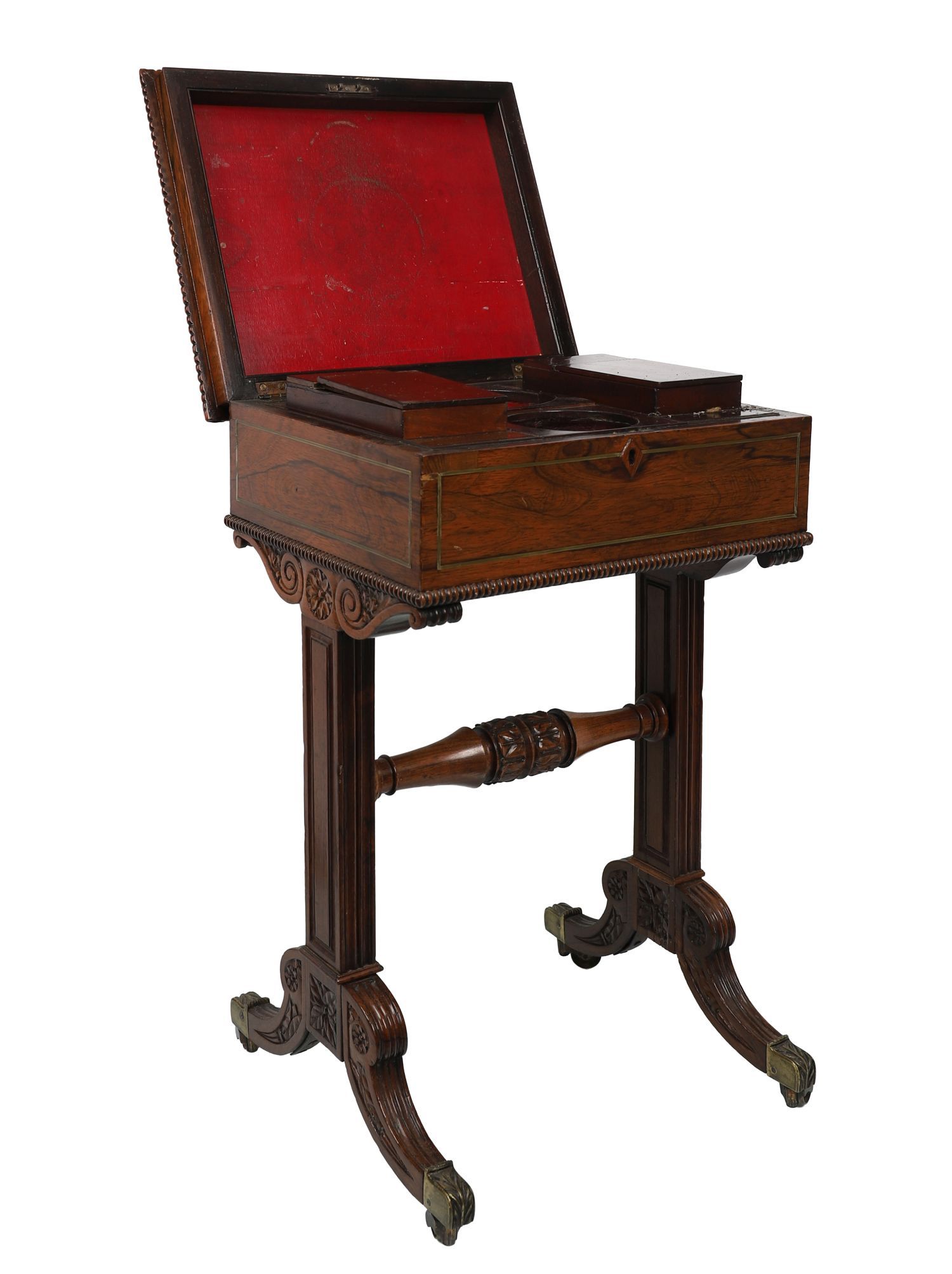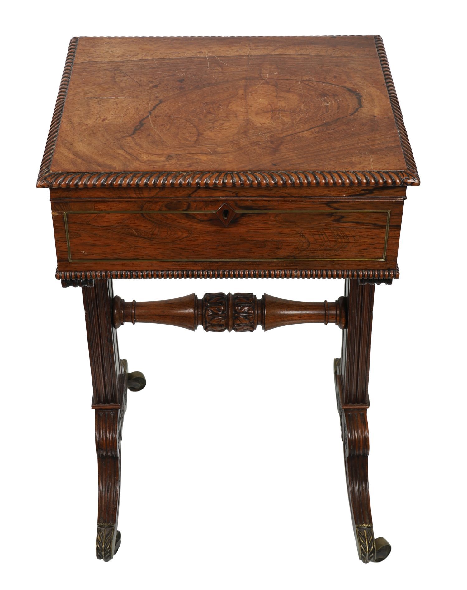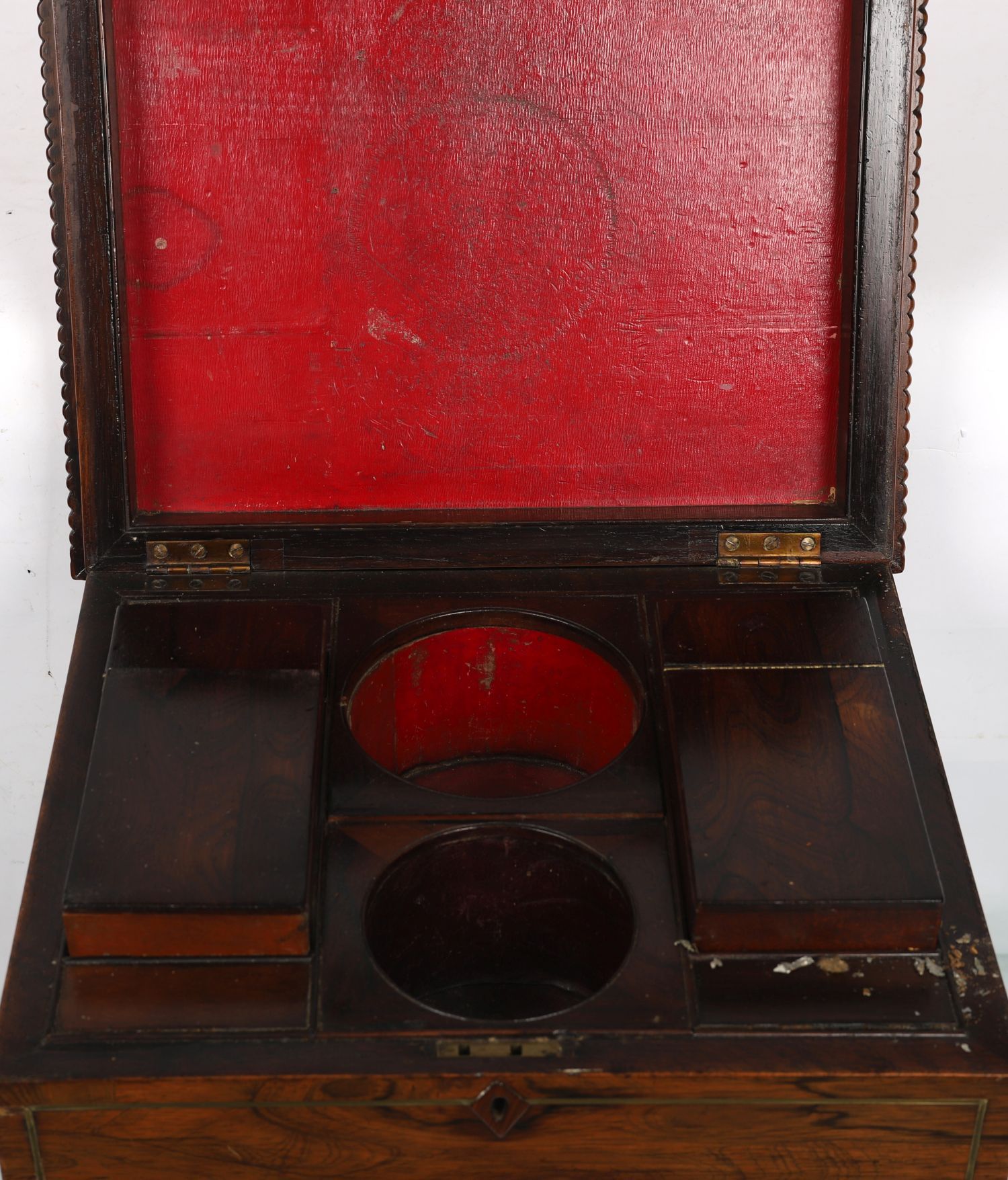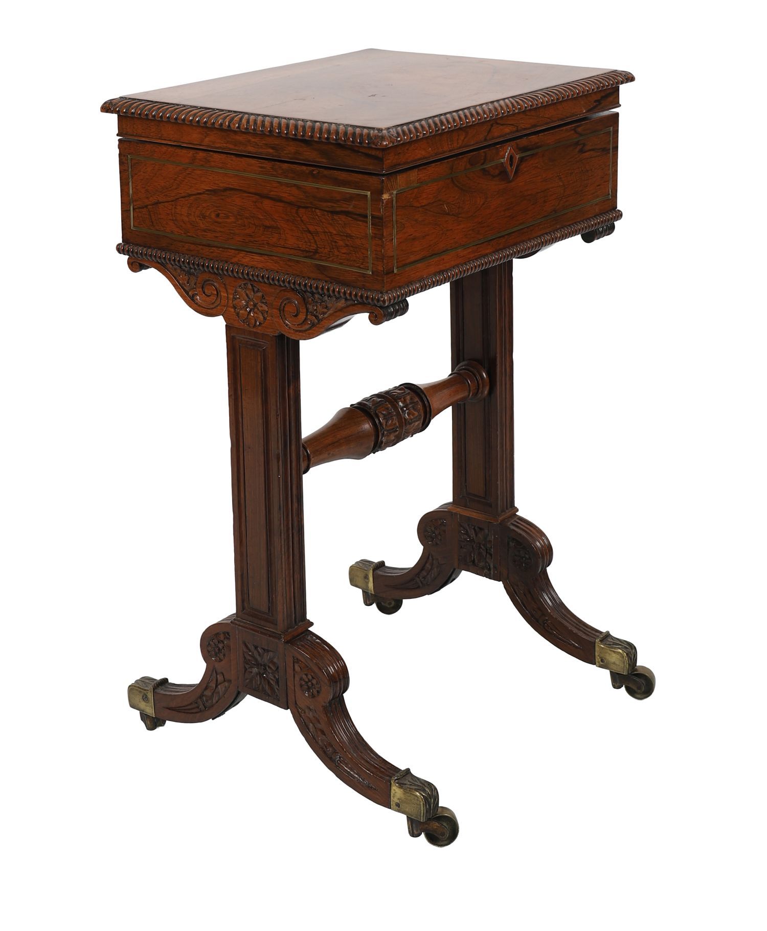 Lot 1706 REGENCY ROSEWOOD AND BRASS INLAID TEAPOY WITH FITTED INTERIOR