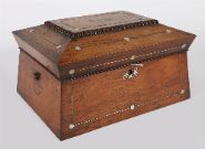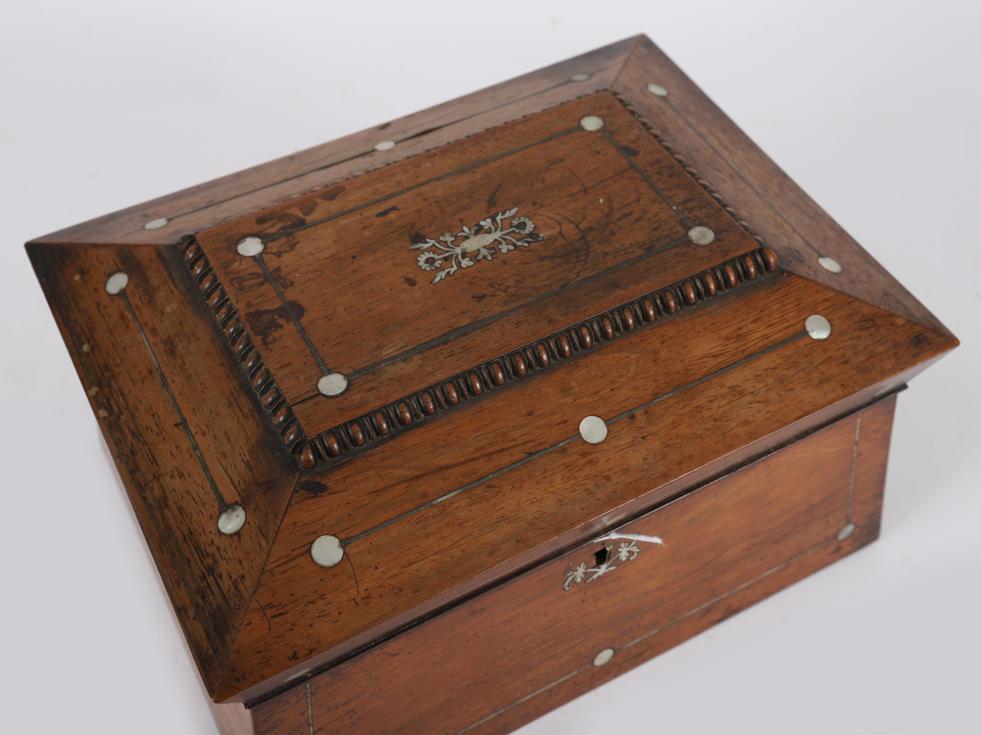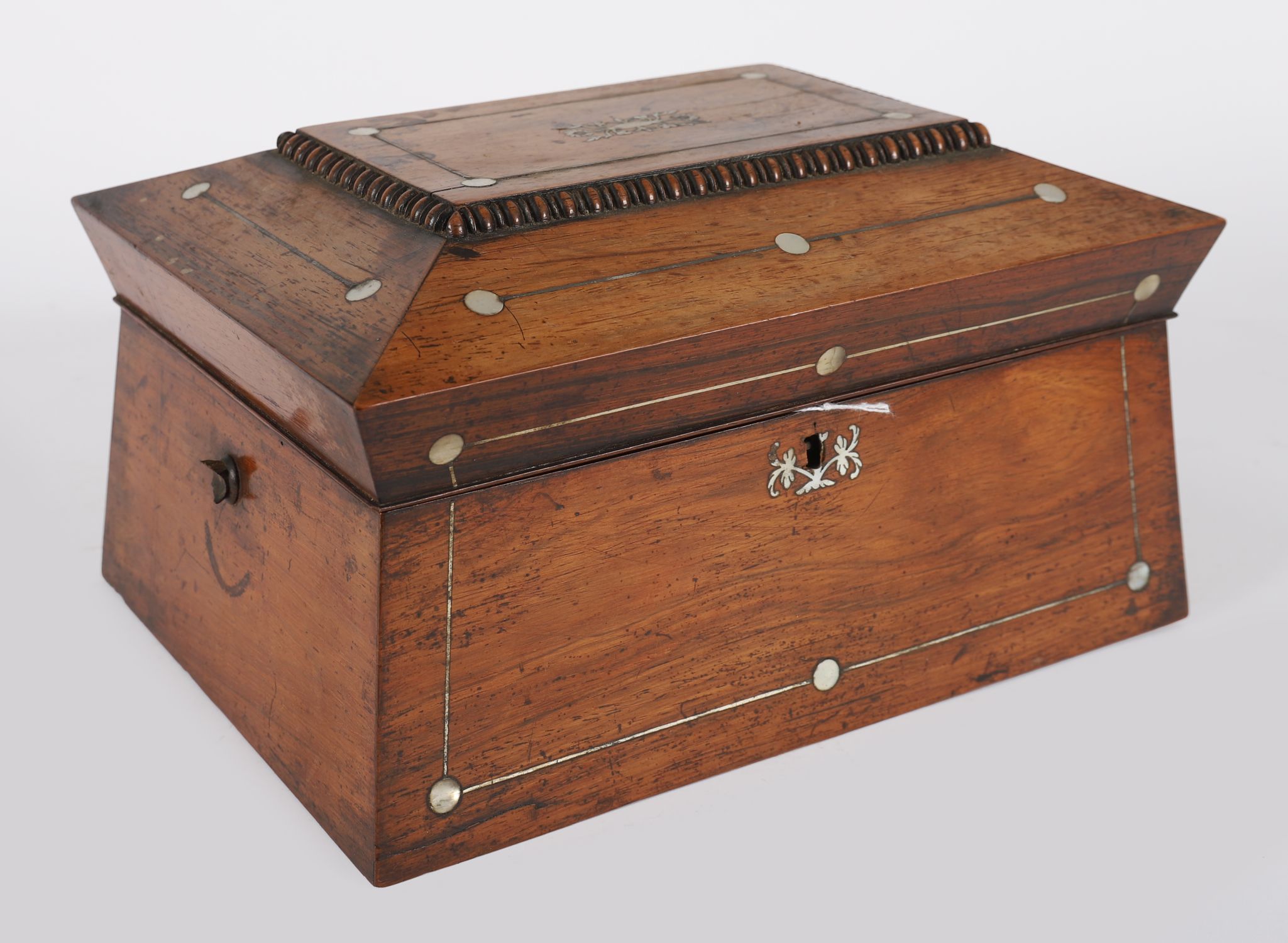 A Regency period rosewood box with domed lid, finely inlaid with mother-of-pearl roundels and line stringing, centred with a stylised floral motif. The lid framed by a beaded moulding, with brass escutcheon and key.