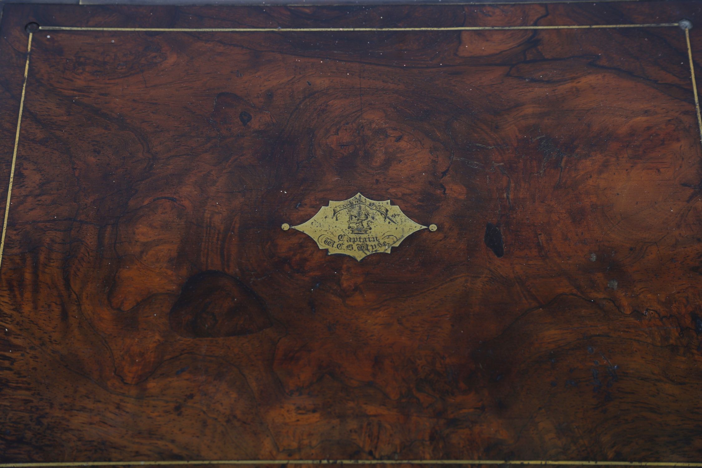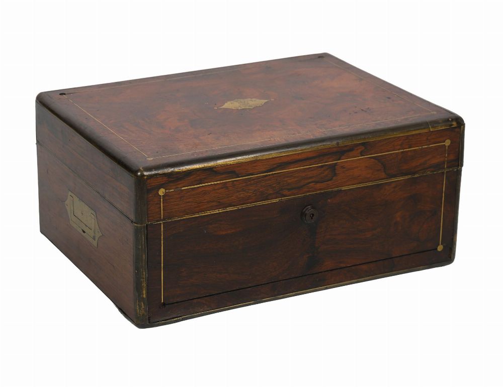 A Regency rosewood brass-bound vanity box with fitted interior, inset with a brass cartouche inscribed “Captain C. B. Wyse”, with retailer’s mark to interior.