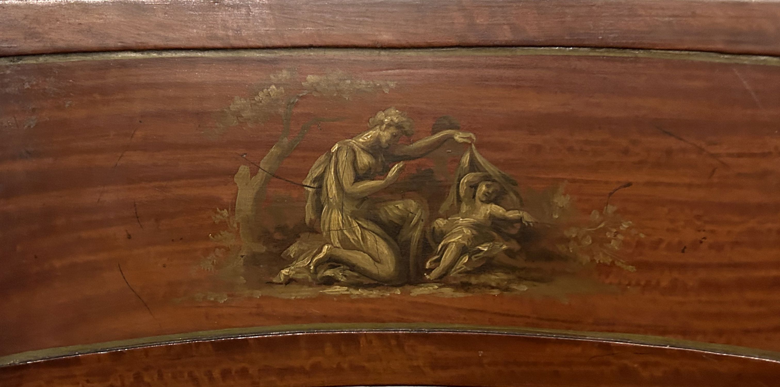 with a scallop shell carved crest rail, above curved splats with en grisaille panels, over a panelled seat, raised on sabre legs to the fore.