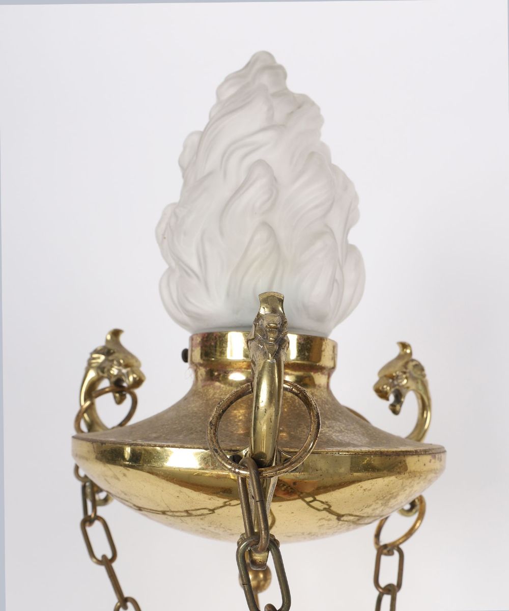 An Edwardian brass hanging ceiling light in Regency revival style, modelled as a classical flaming torch. The fitting features a fluted brass stem with acanthus mounts, suspended on three linked chains from a circular ceiling plate, and fitted with a frosted flame-form glass shade.